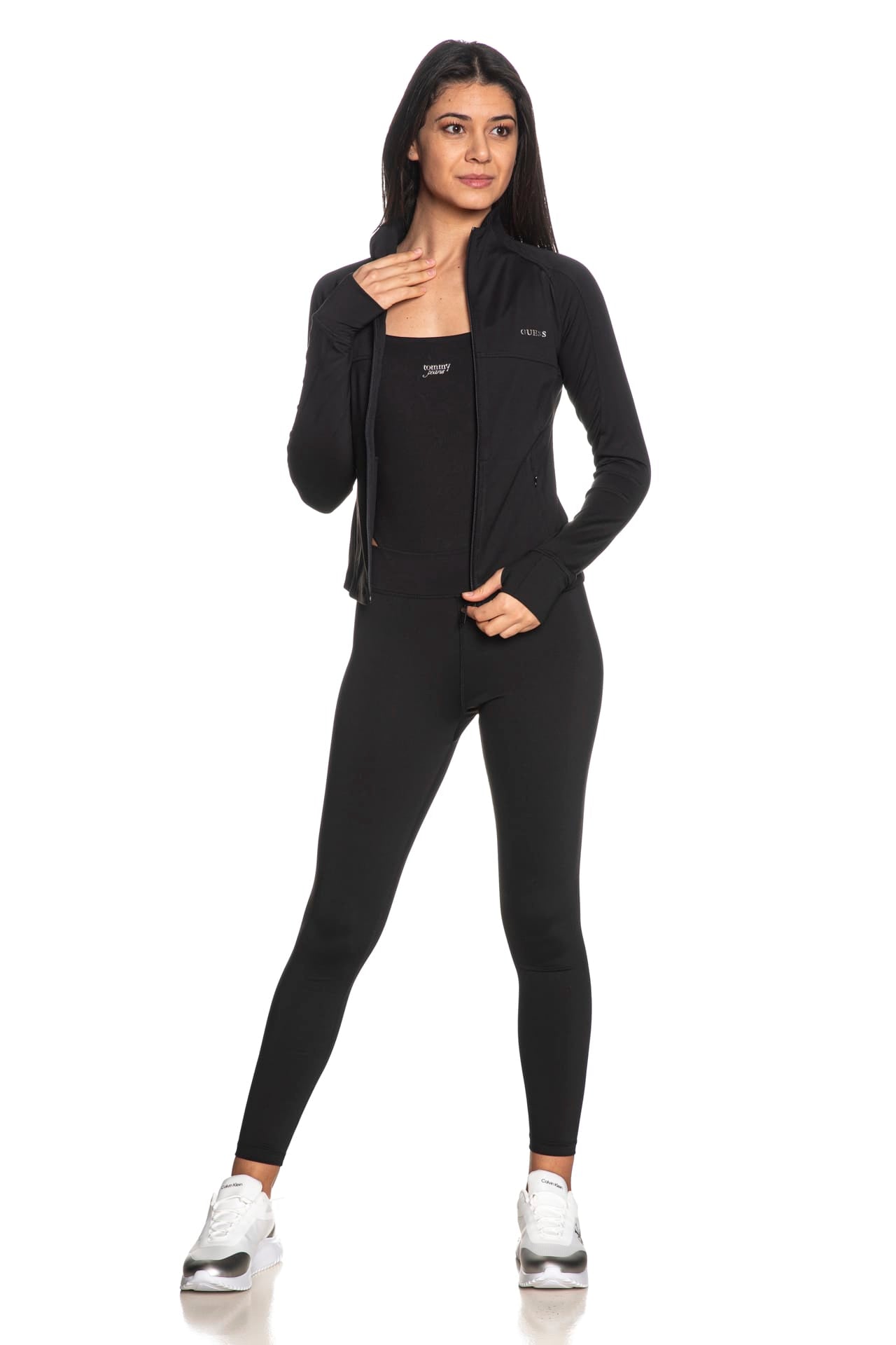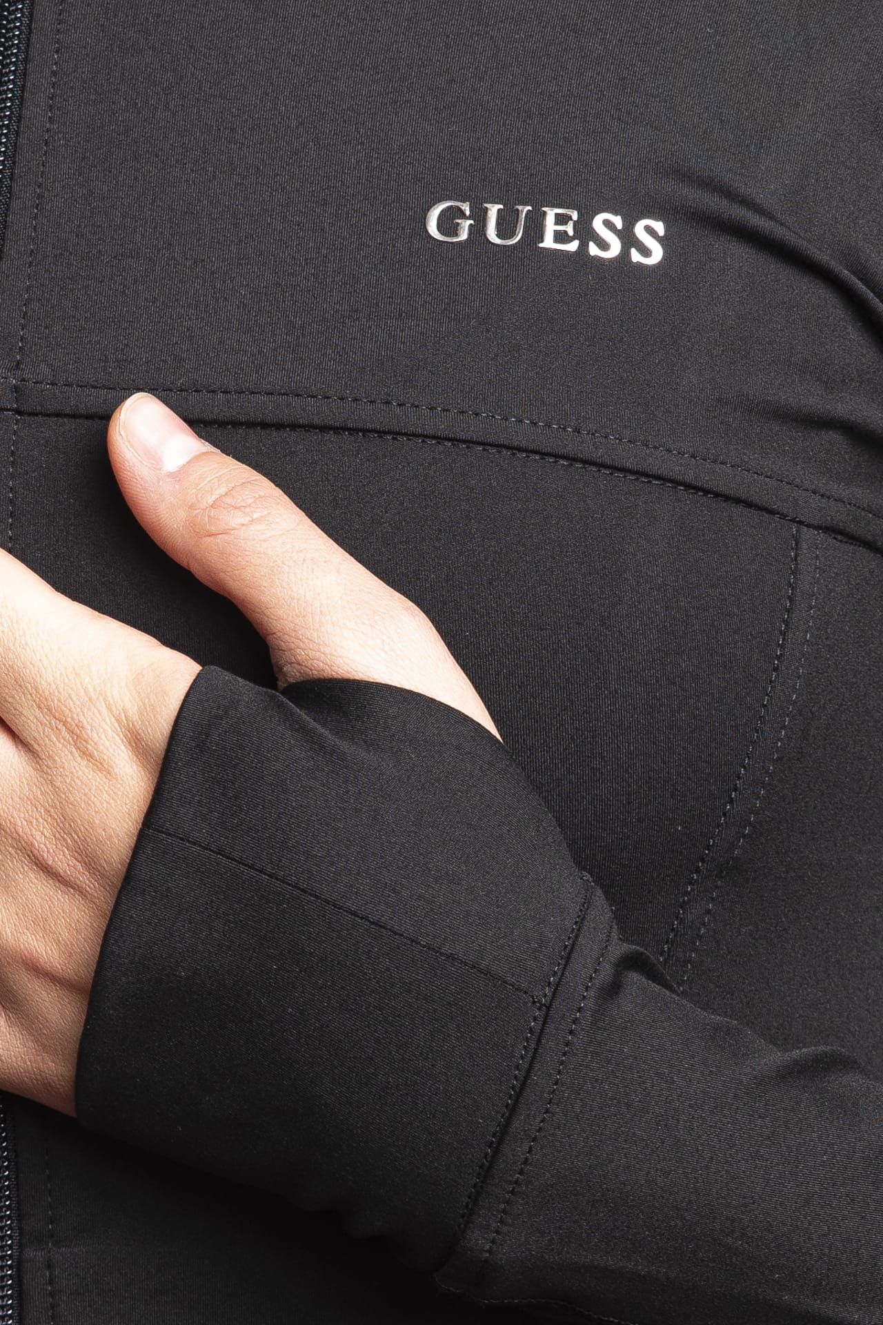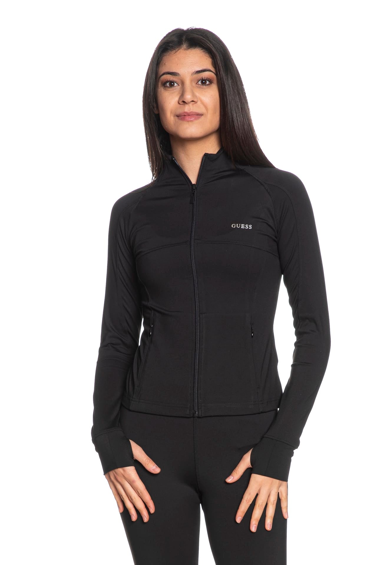 Felpa Guess Margot Z Active da donna in tessuto tecnico stretch di poliestere parzialmente riciclato soft touch, modello corto, aderente, con manica lunga raglan, collo alto, abbottonatura full zip centrale a vista, tasche a filo con chiusura lampo a scomparsa, lettering logo in stampa gommata sul petto e polsini con fessura per il pollice