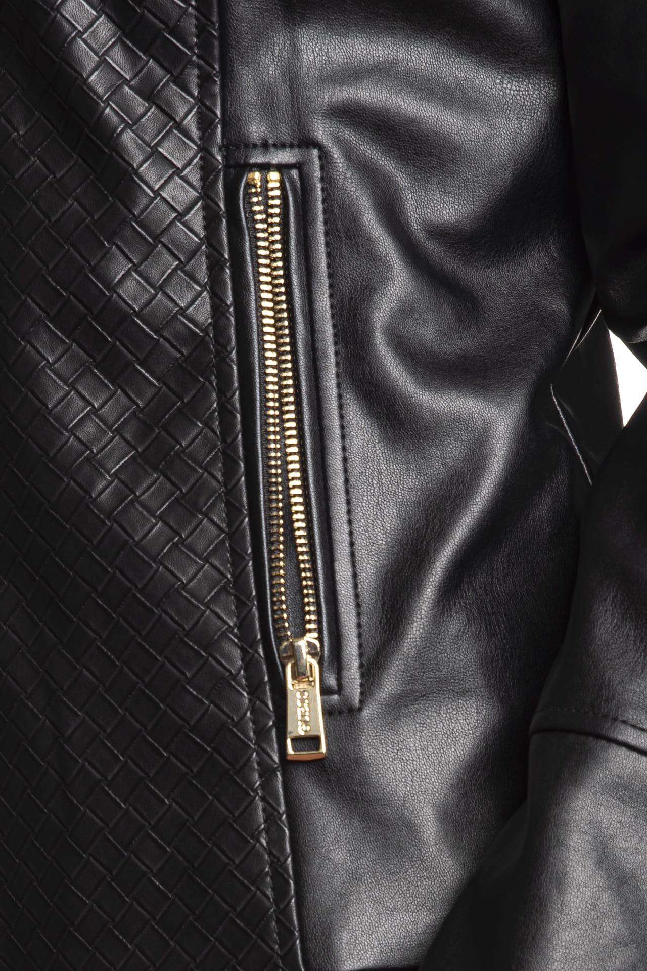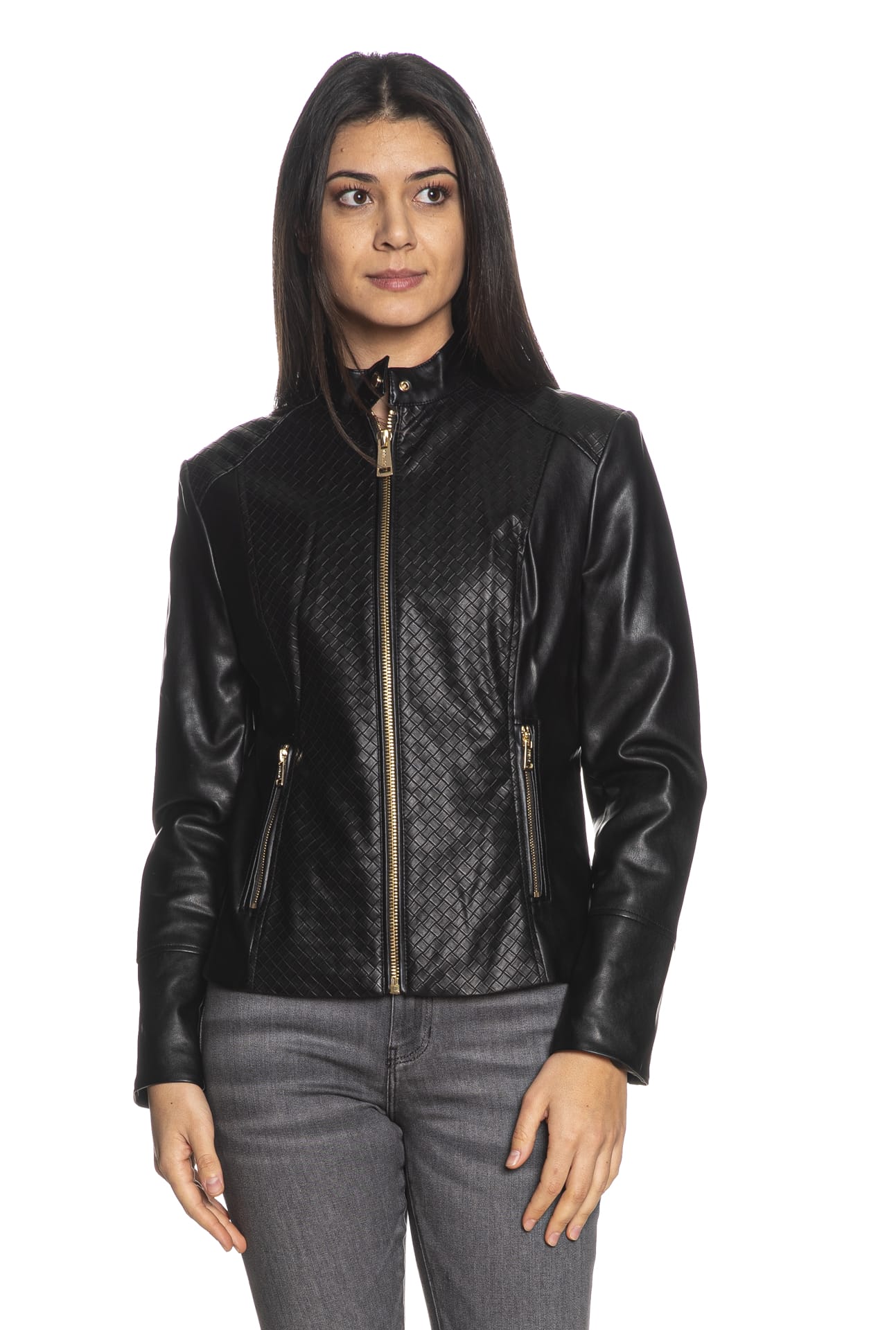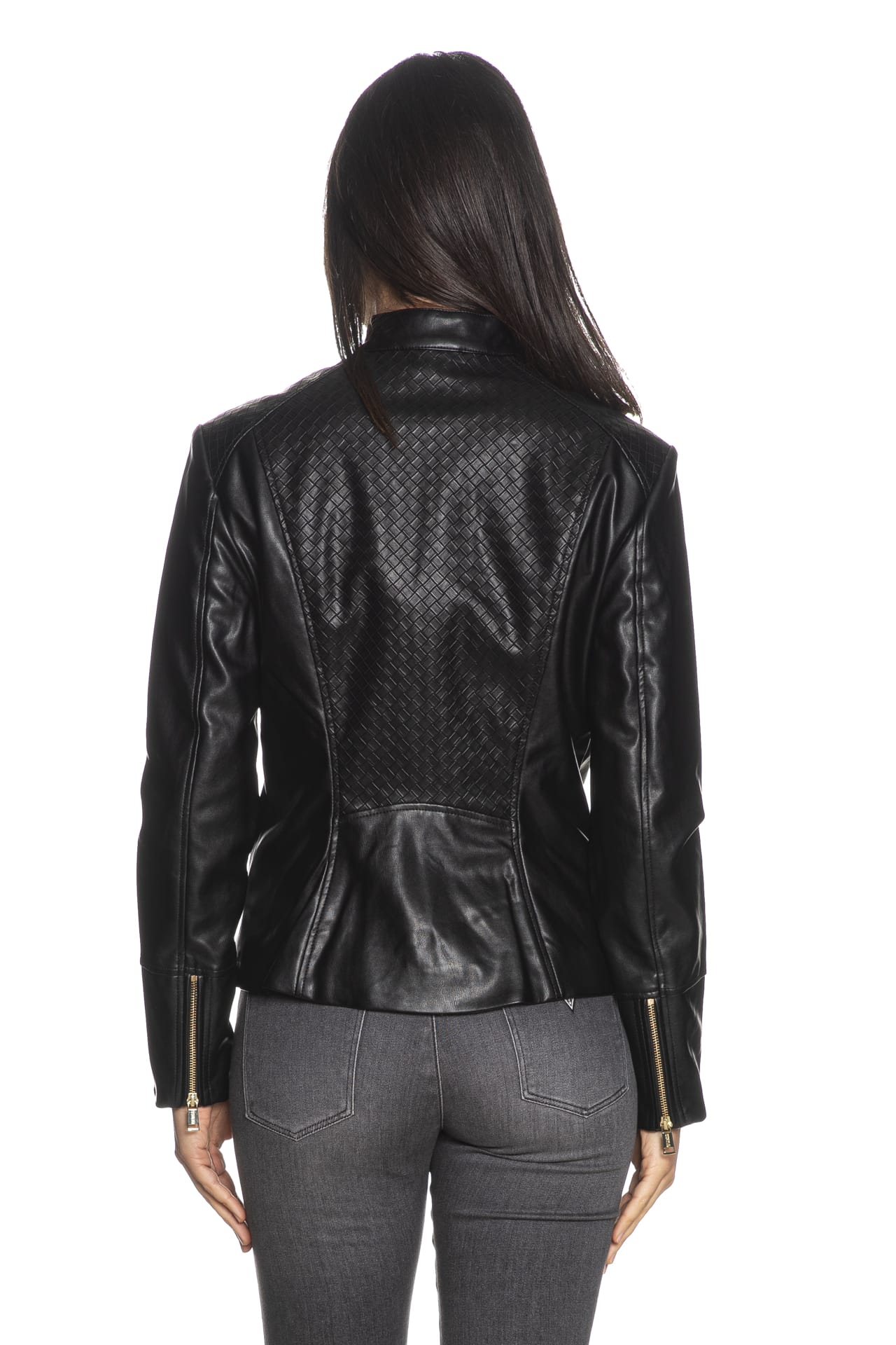 Giubbino Guess Claudine Bkr da donna in similpelle, modello biker corto sagomato foderato, con chiusura centrale full, tasche laterali a filo e polsini con zip a vista, girocollo con bottone a pressione e inserti stampati a intreccio su spalle e busto