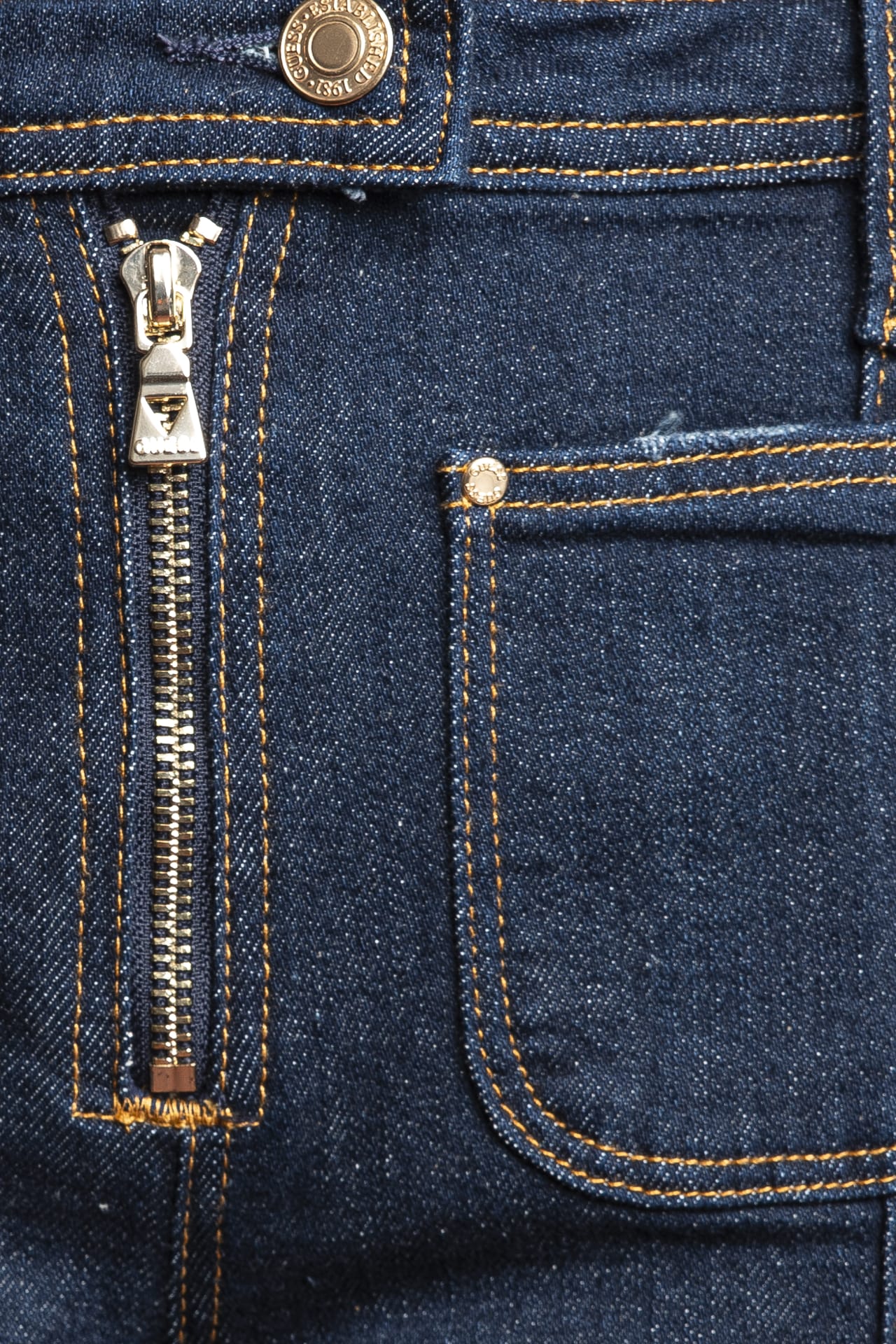 Jeans Guess Nicky High Z da donna in denim stretch di misto cotone parzialmente rigenerato e riciclato e poliestere, slim fit a vita media, con chiusura frontale con zip a vista e bottone, tasche a toppa anteriori e posteriori e cucitura nel centro della gamba dritta
