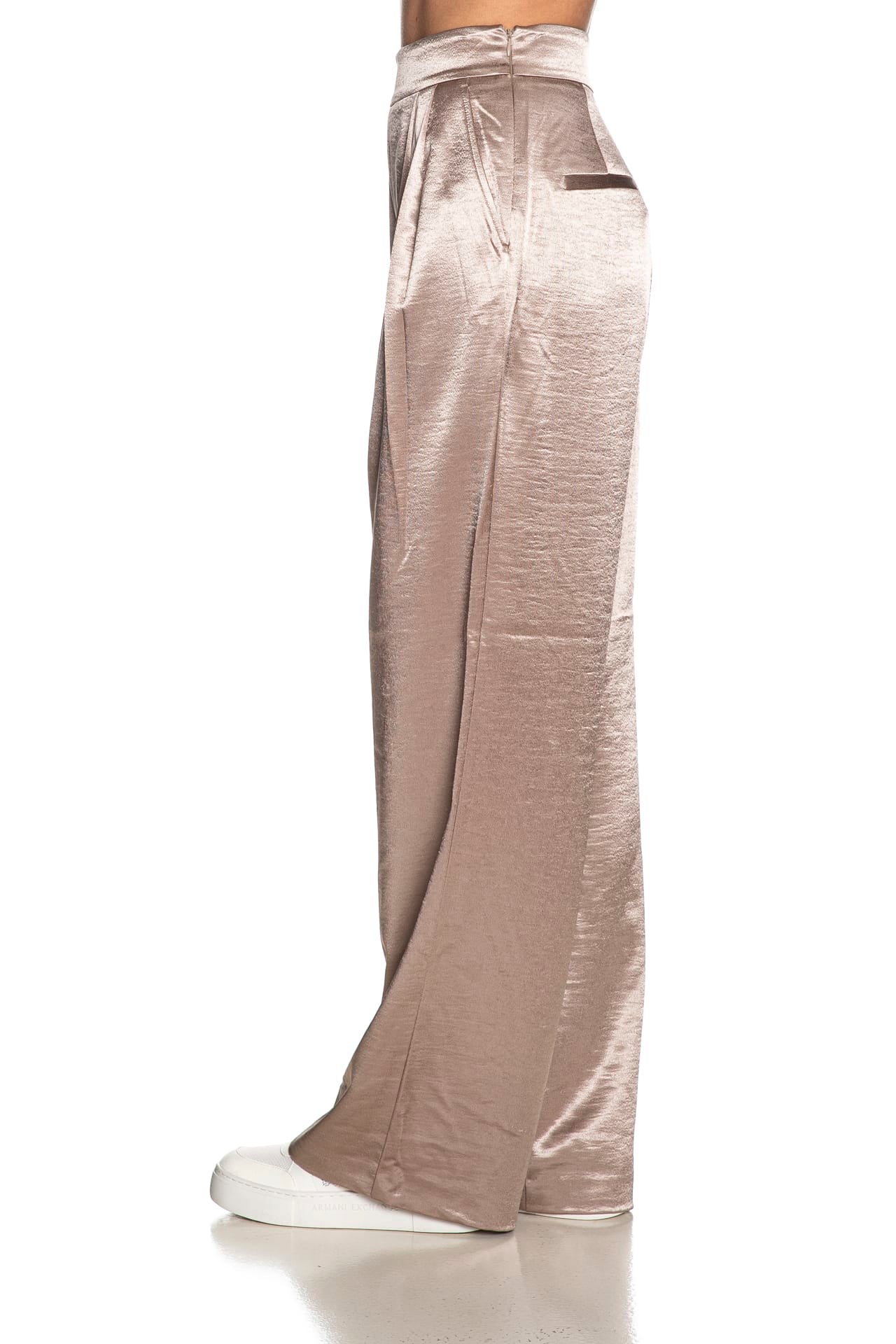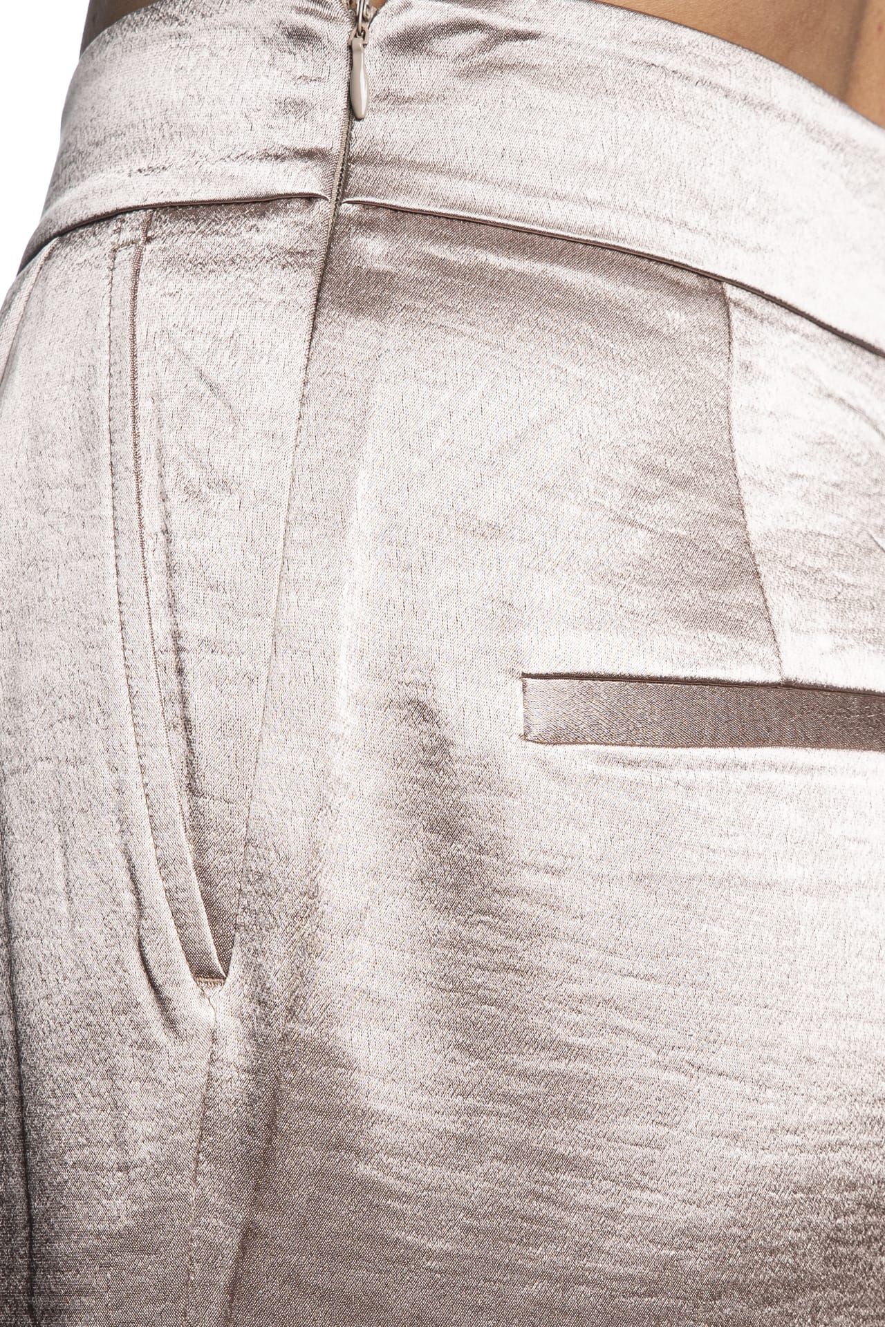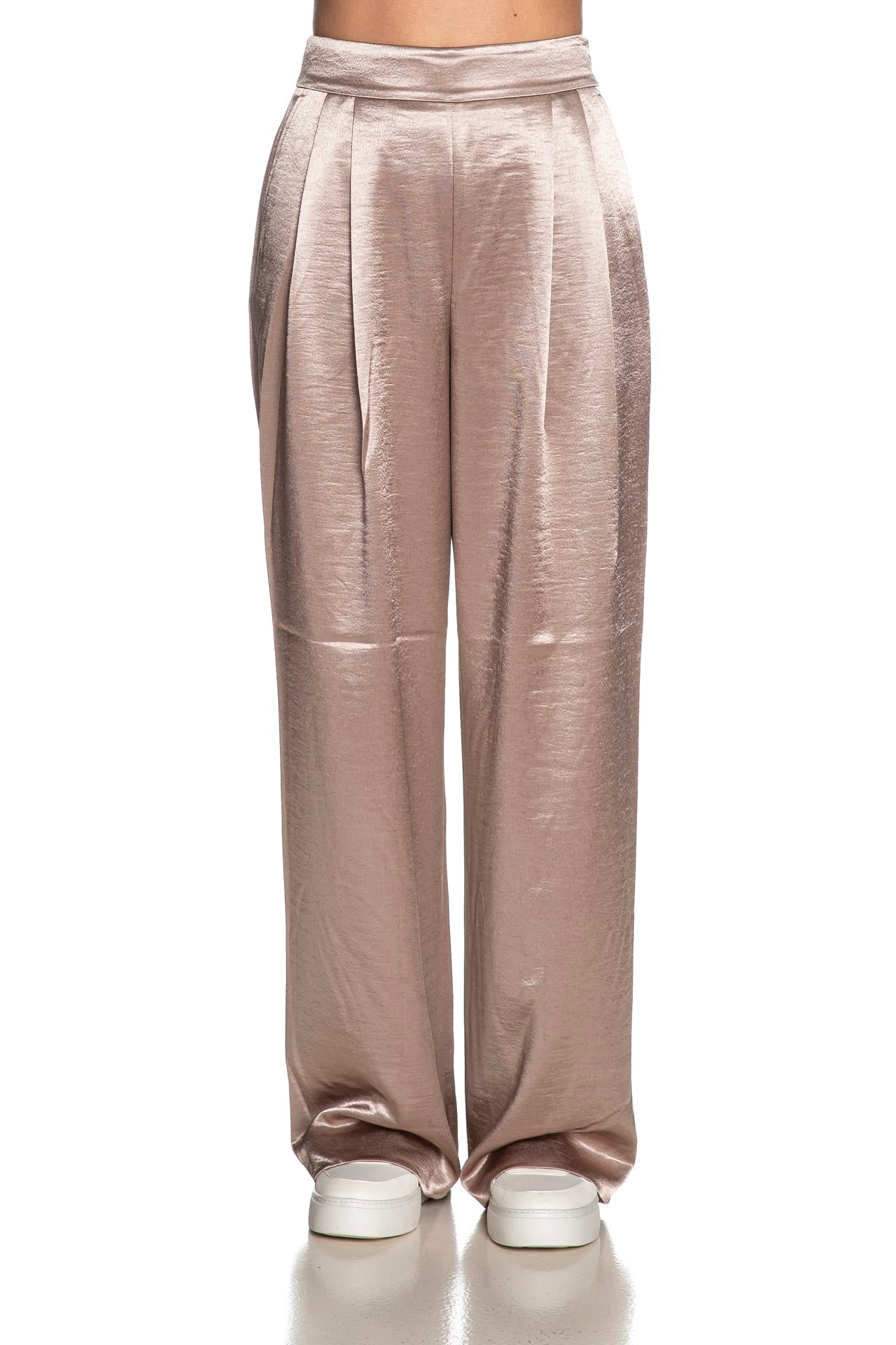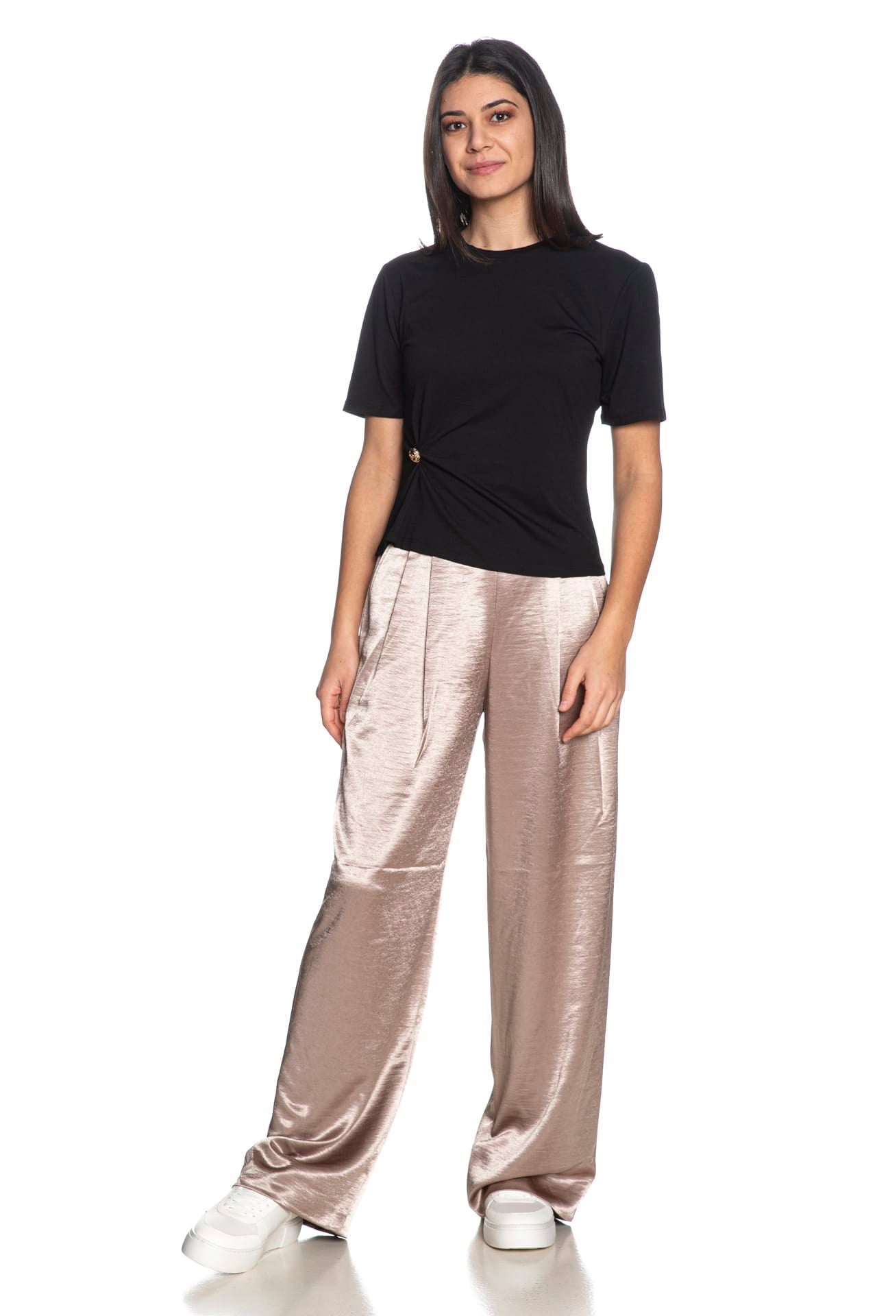 Pantalone Guess Katien Sa Wi da donna in satin di poliestere cangiante parzialmente riciclato, modello palazzo dal taglio chino a gamba ampia, con doppia pince frontale, tasche america laterali, a filo posteriorie chiusura zip a scomparsa laterale