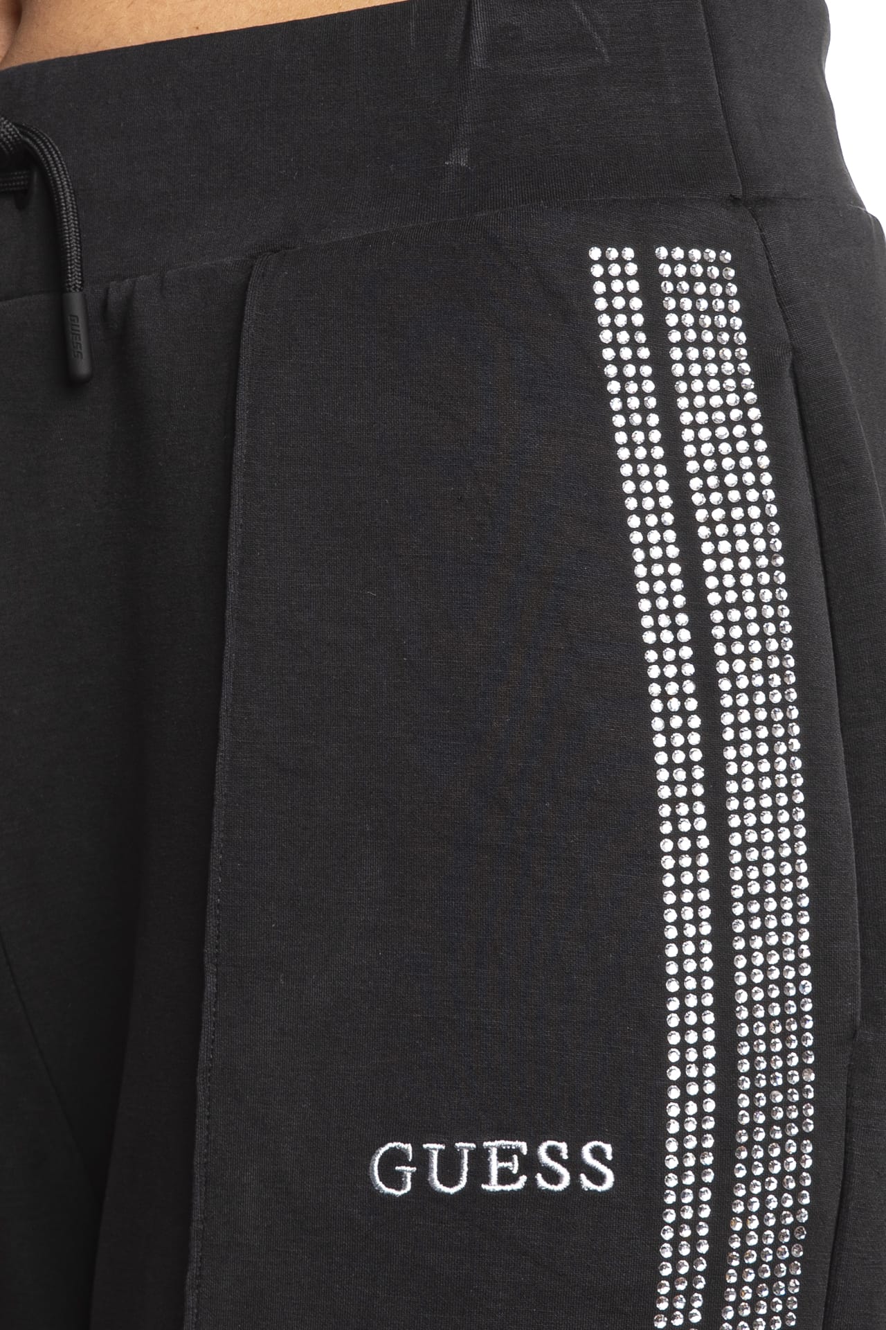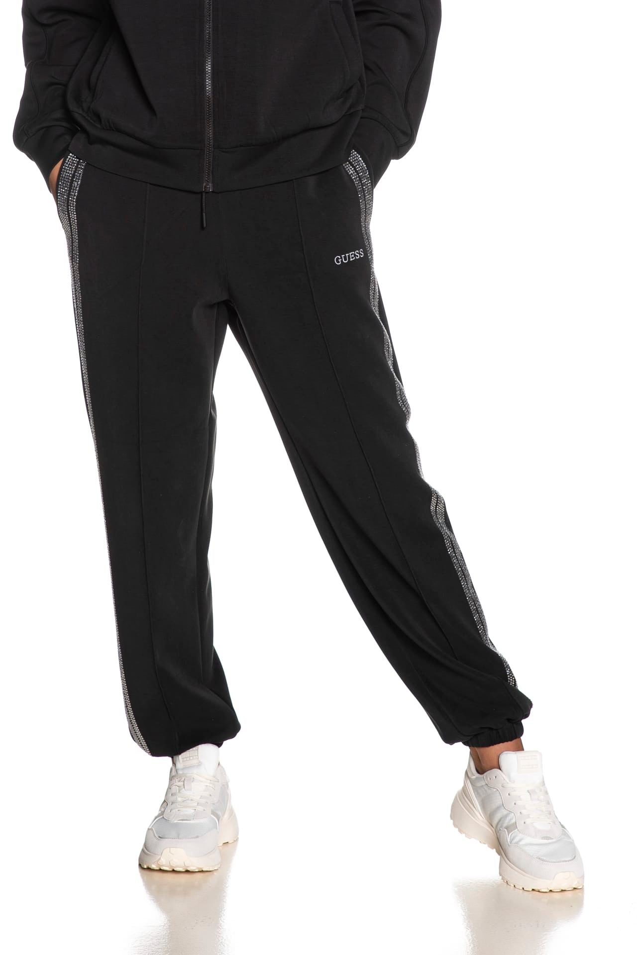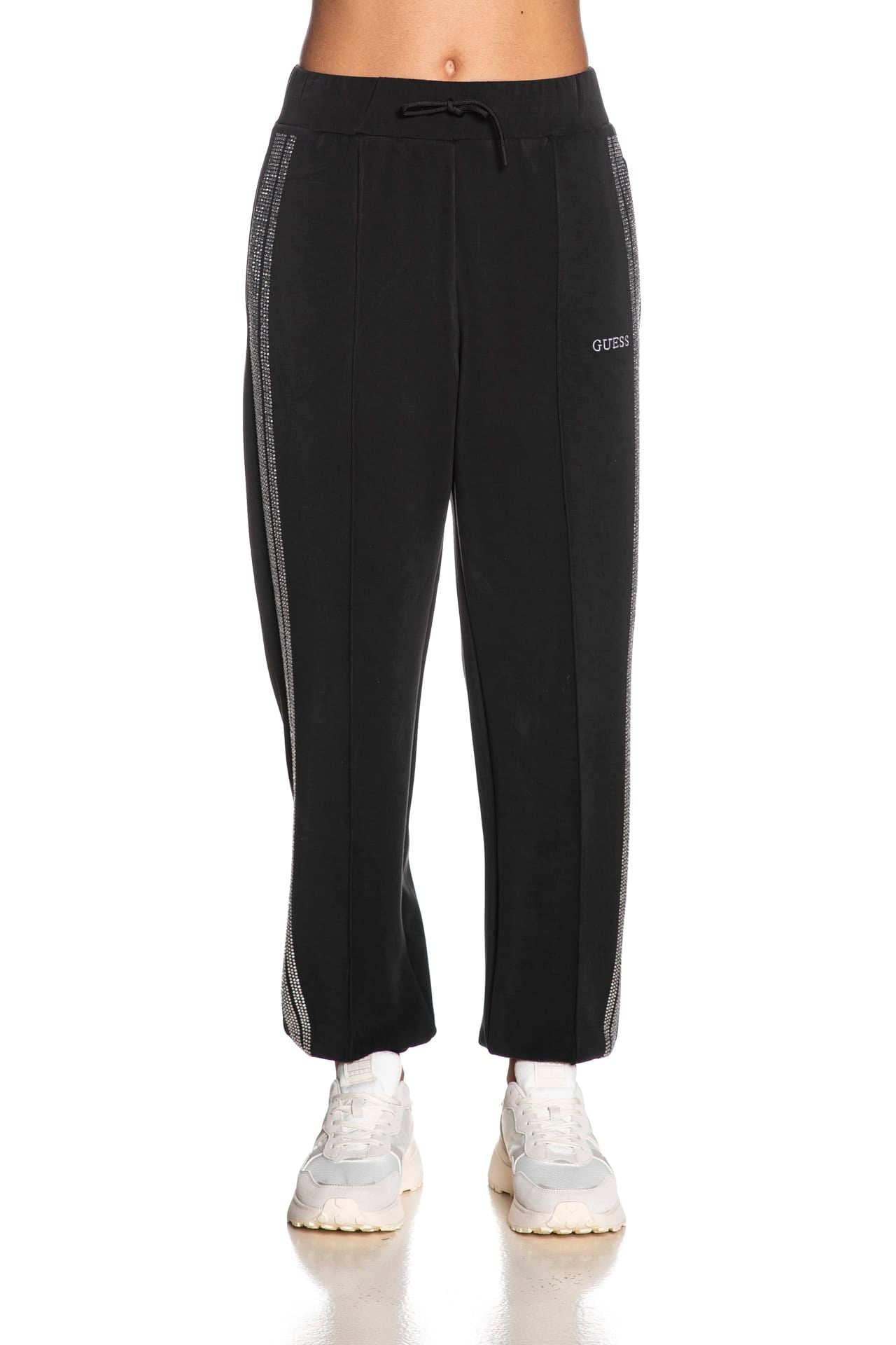 Pantalone tuta Guess Berthe Cuffed da donna in interlock stretch di poliestere parzialmente riciclato e modal, modello jogger, con elastico e coulisse in vita, tasche a filo, cucitura nel centro della gamba, bande laterali in strass a contrasto, lettering logo ricamato e polsini elasticizzati
