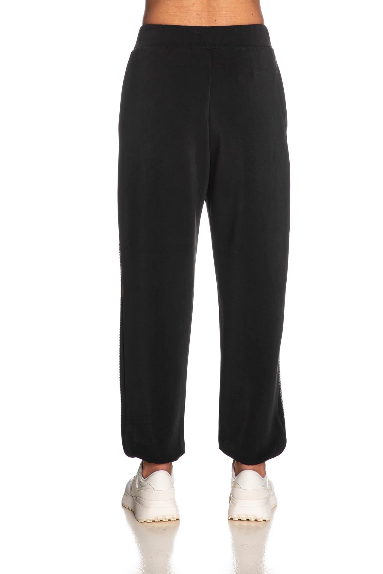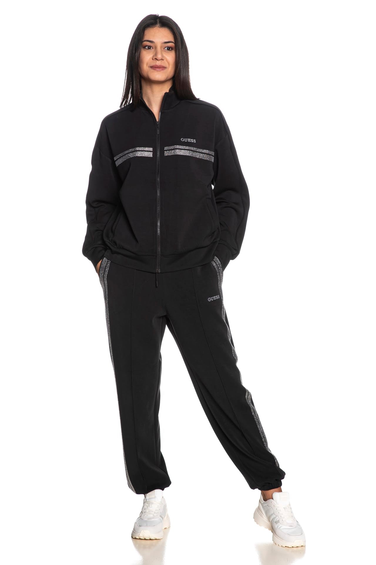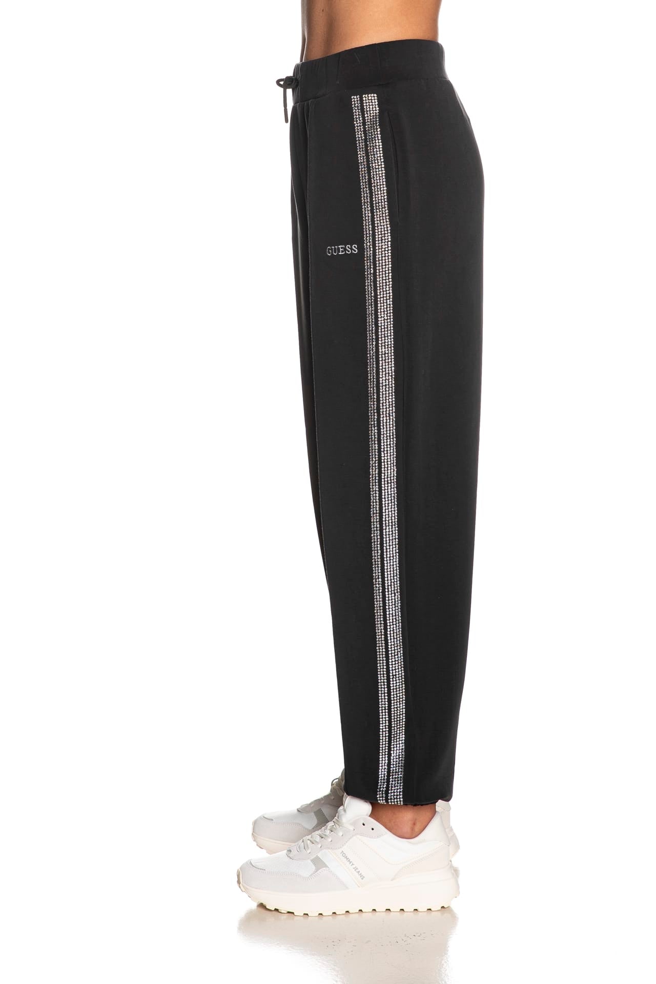 Pantalone tuta Guess Berthe Cuffed da donna in interlock stretch di poliestere parzialmente riciclato e modal, modello jogger, con elastico e coulisse in vita, tasche a filo, cucitura nel centro della gamba, bande laterali in strass a contrasto, lettering logo ricamato e polsini elasticizzati