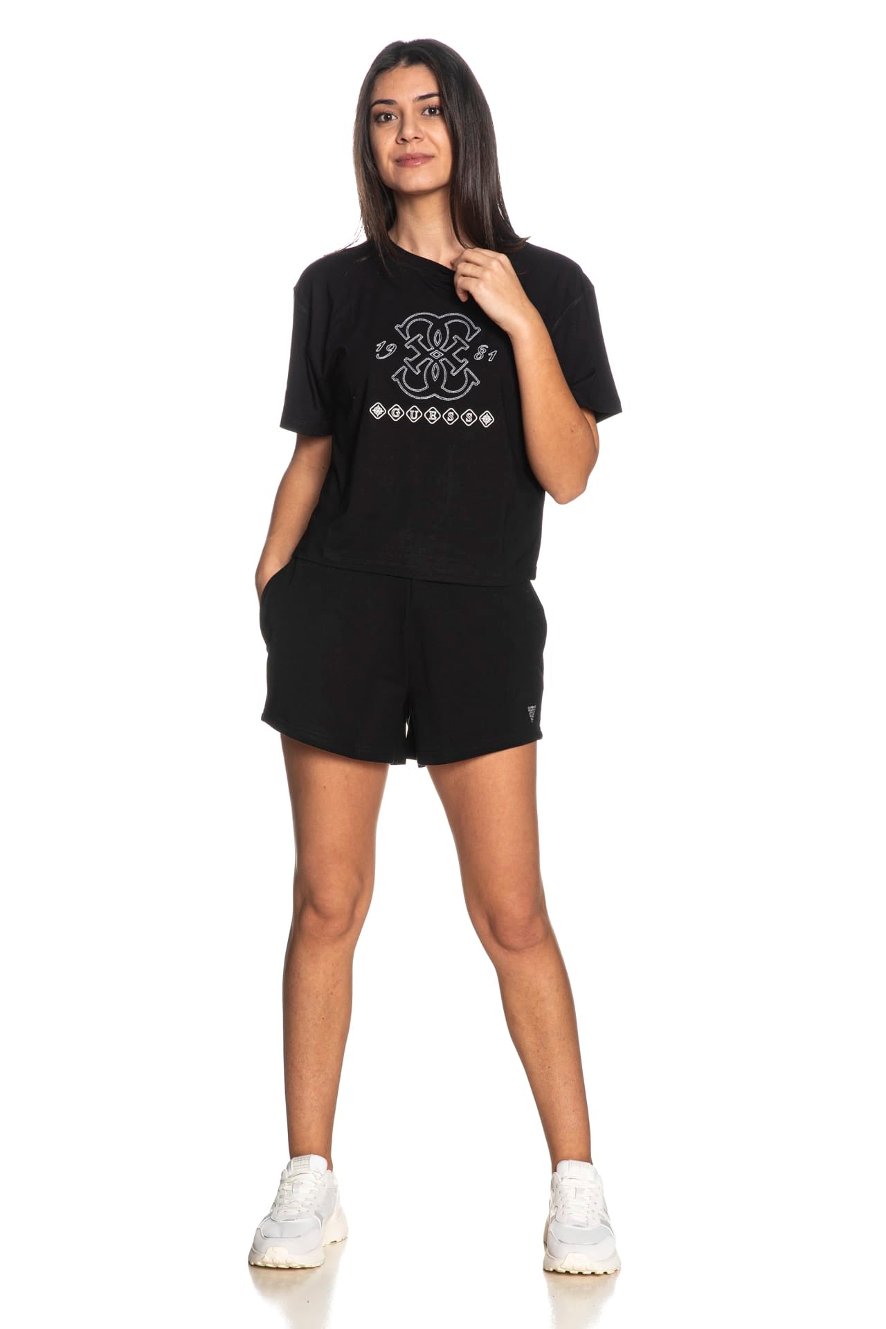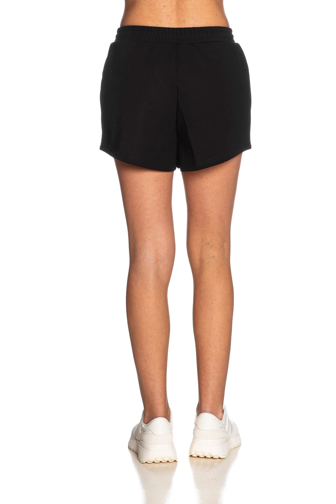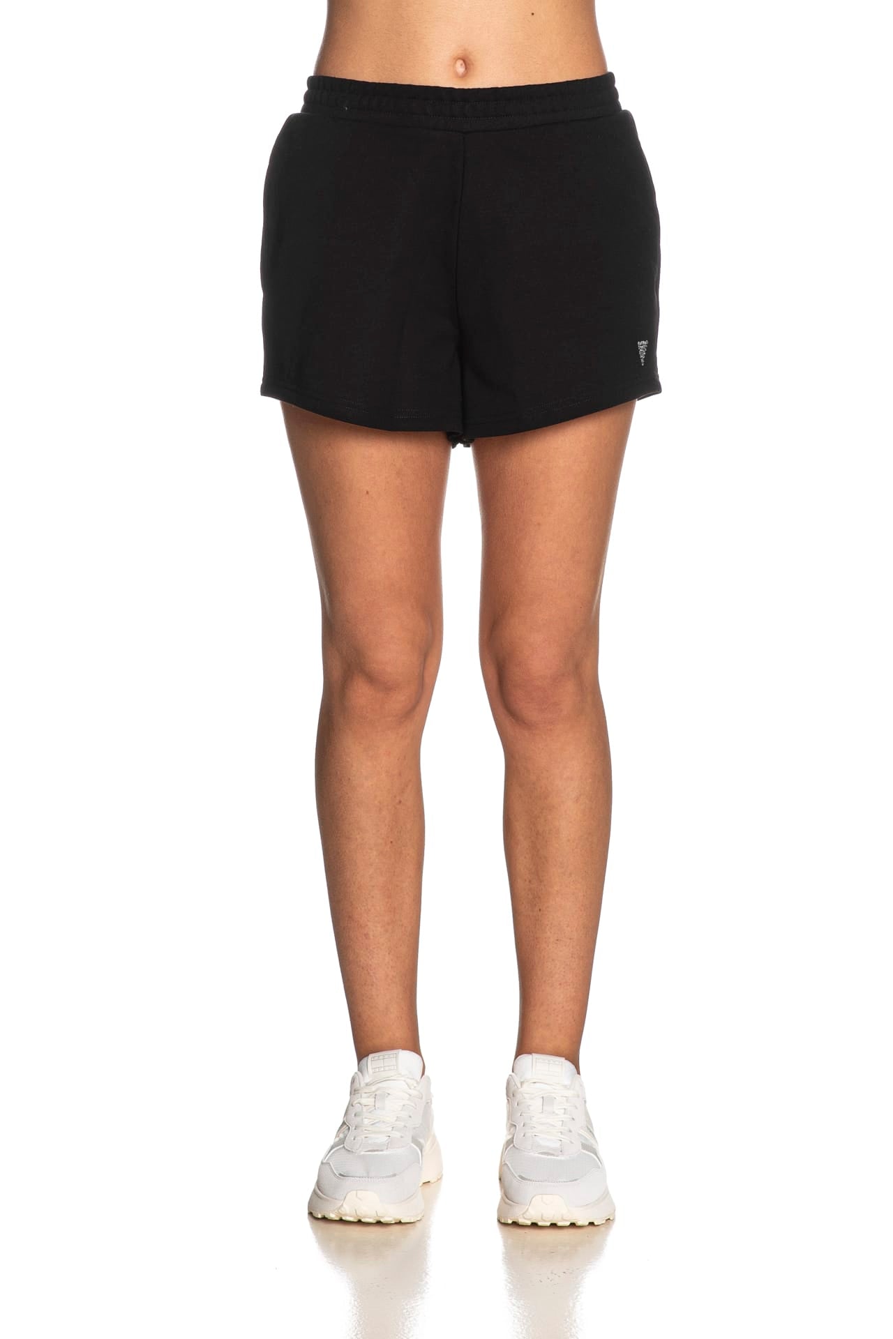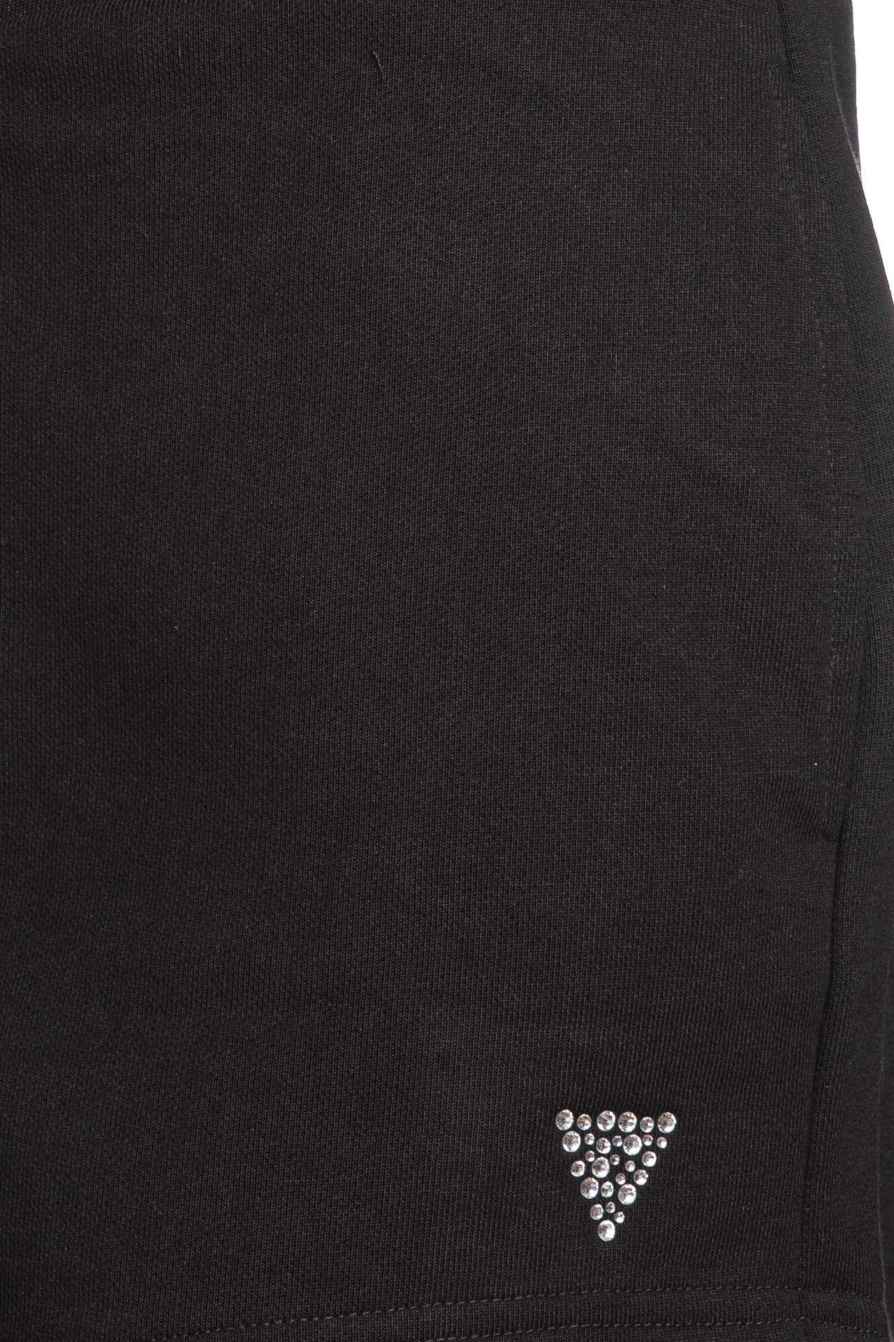 Shorts Guess Silvy Sh da donna in tessuto garzato di poliestere parzialmente riciclato e cotone, con elastico foderato in vita, tasche a filo e mini tag logo in strass su una gamba