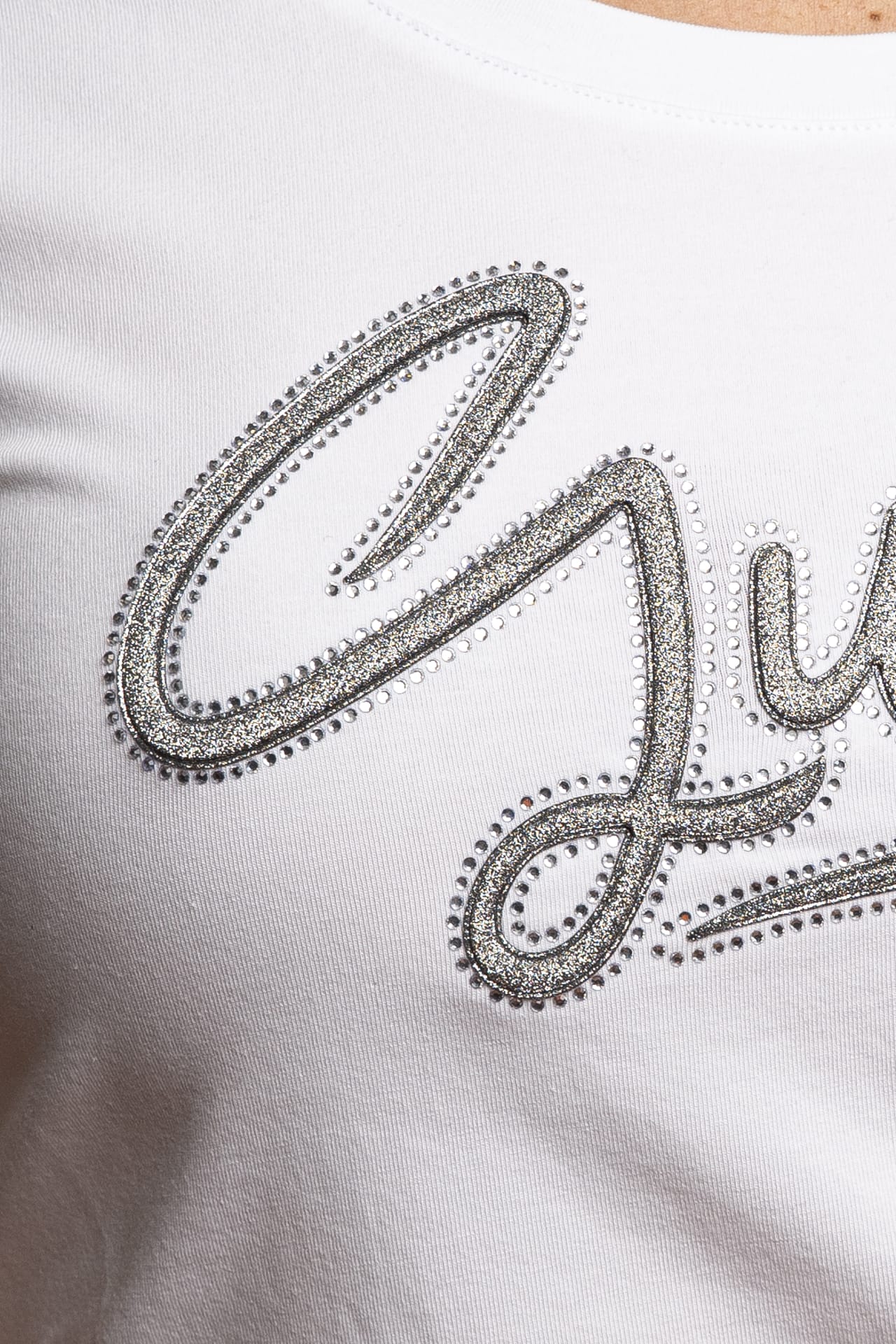 T-Shirt Guess Ss Gss Script da donna in jersey stretch di cotone parzialmente organico, slim fit a manica corta, con girocollo in maglina e maxi firma logo glitter tridimensionale bordata di strass sul lato anteriore