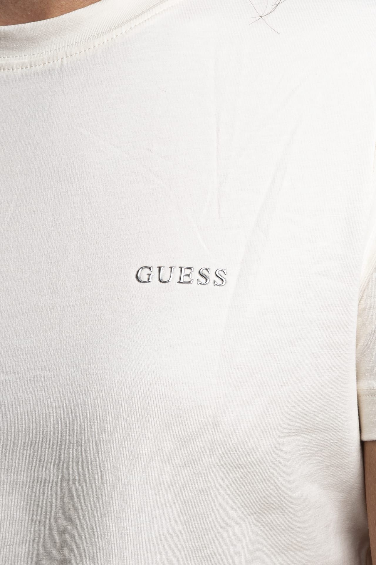 T shirt Guess Tracey Ss Tee da donna in jersey stretch di cotone, girocollo a manica corta, con piccolo logo lettering in stampa gommata a rilievo metallizzata argento sul petto