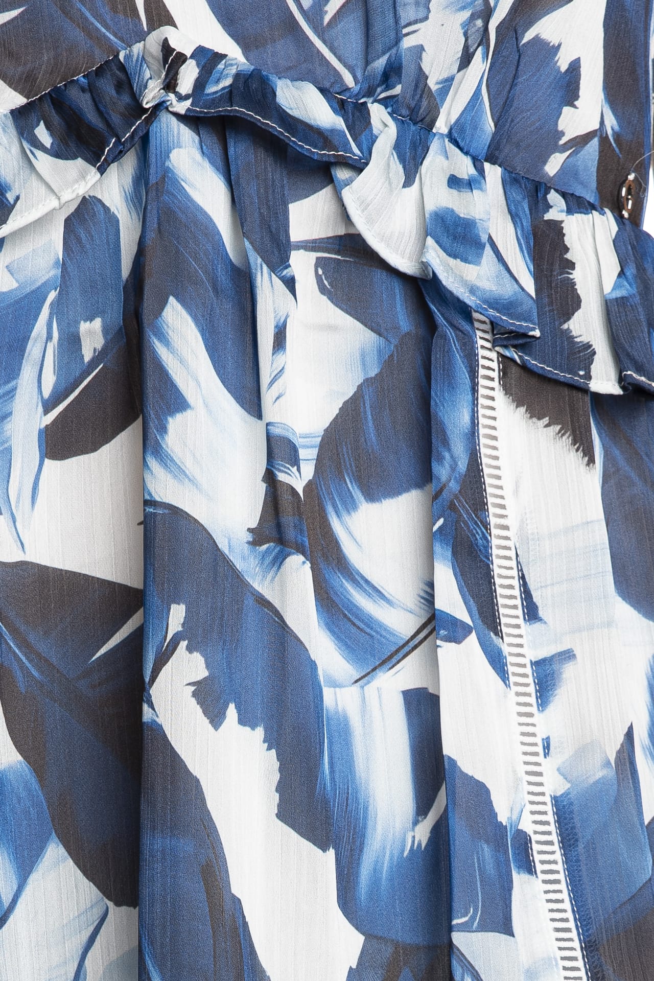 Vestito corto Guess Ss Orsola Flare Dress da donna in georgette di poliestere parzialmente riciclato micro plissettat stampata in fantasia botanica, modello svasato, con fodera sintetica, scollo a V, balze su spalline fisse elasticizzate, taglio sotto seno e fondo della gonna, chiusura zip a scomparsa posteriore e inserti passamaneria a contrasto