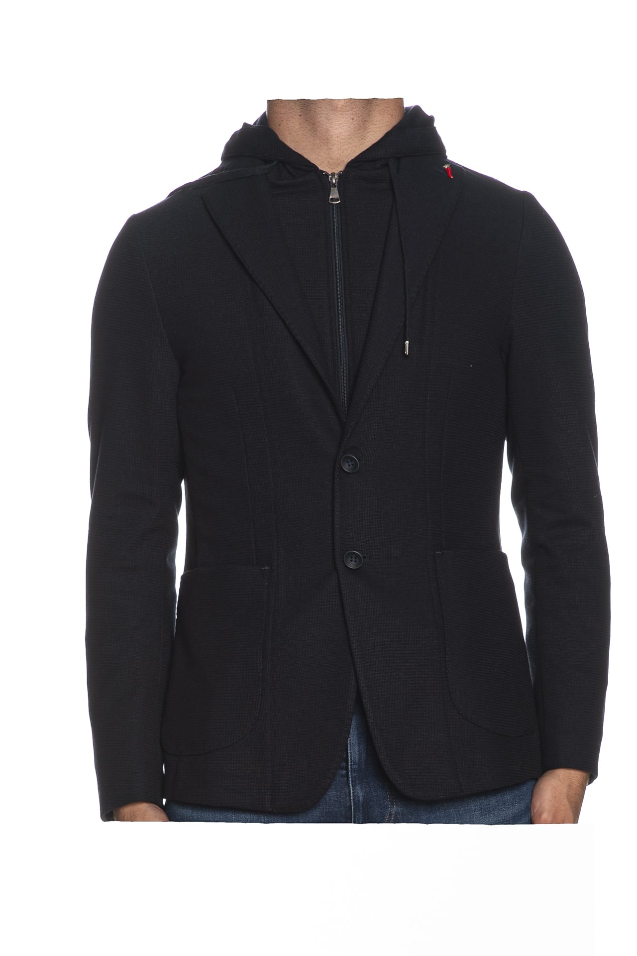 Giacca Mulish Silver da uomo in tessuto armaturato effetto maglia jersey di misto poliestere e viscosa stretch, modello blazer a due bottoni interamente sfoderato e destrutturato, con pettorina rimovibile unita a cappuccio regolabile da coulisse con chiusura zip, revers classici impunturati tono su tono, tasche anteriori con patta, spilla peperoncino smaltato con chiusura a farfalla all'asola, dettaglio bottone logato ai polsini e spacchetti posteriori