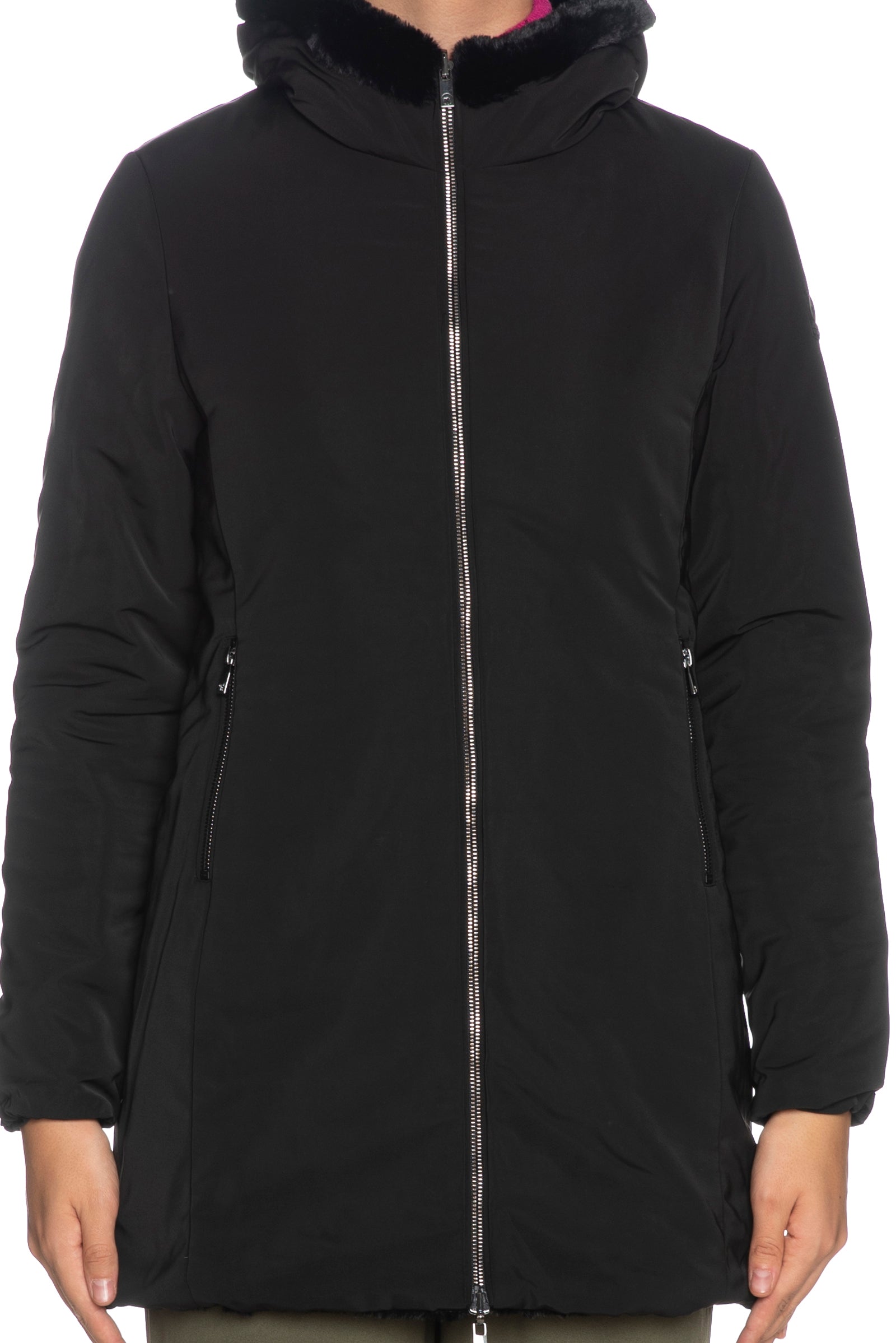 Giaccone Ciesse Piumini Claire Eco nero reversibile con lato liscio e lato in ecopelliccia di media lunghezza con cappuccio chiusura zip imbottitura sintetica e logo gommato sulla manica