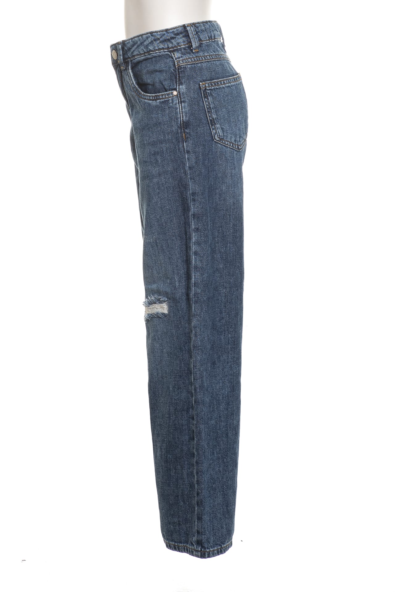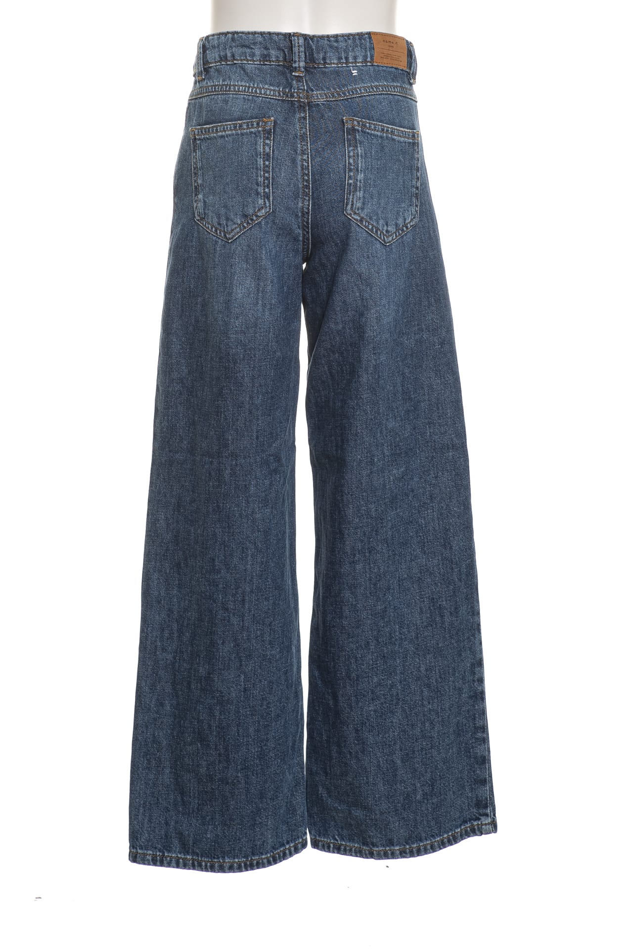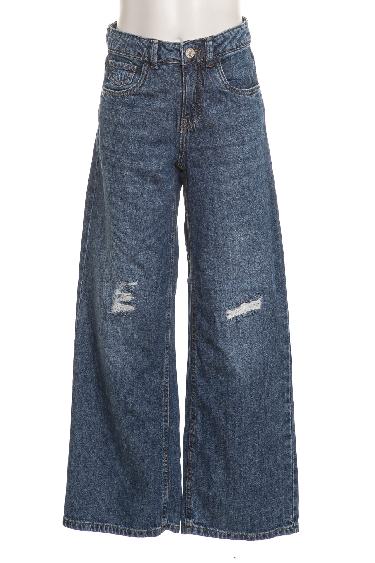 Jeans Name It Frose Wi da bambina in denim di cotone parzialmente organico sottoposto a trattamento per un aspetto vissuto, modello cinque tasche, wide fit, con chiusura zip e gancetto a slitta nascosti, vita regolare elasticizzata regolabile da bottoni, rotture anteriori sulle gambe, taschino portamonete applicato e tasche a toppa posteriori