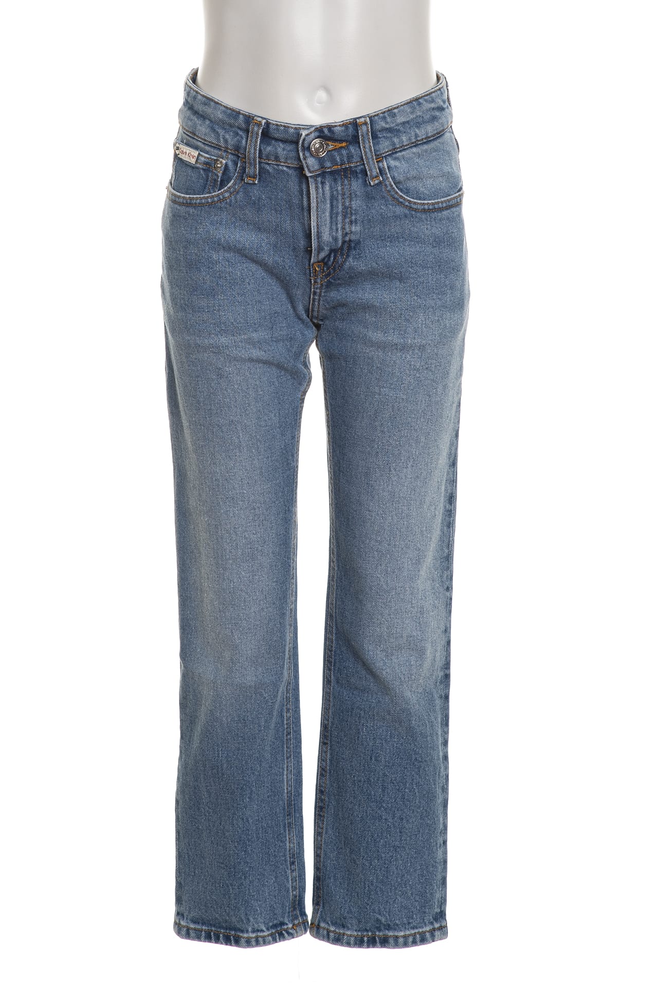Jeans Calvin Klein Strght Cloudy da bambino in denim stretch di cotone sottoposto a trattamento per un aspetto vintage, regular straight fit, modello cinque tasche, con vita regolabile internamente da elastico e bottone, chiusura zip nascosta e gamba dritta