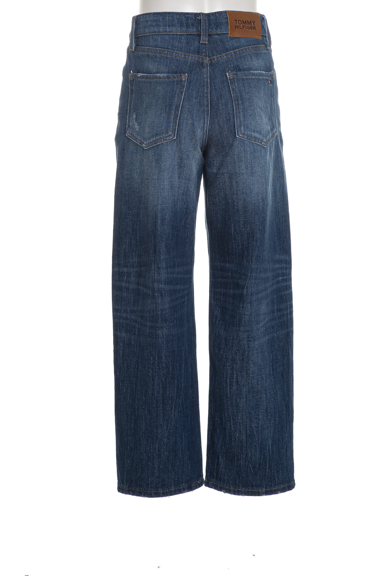 Jeans Tommy Hilfiger Baggy Destructions da bambina in denim di cotone stretch sottoposto a trattamento per un aspetto used, modello cinque tasche baggy fit, con strappi cuciti e cimosa a vista, chiusura zip e vita regolabile