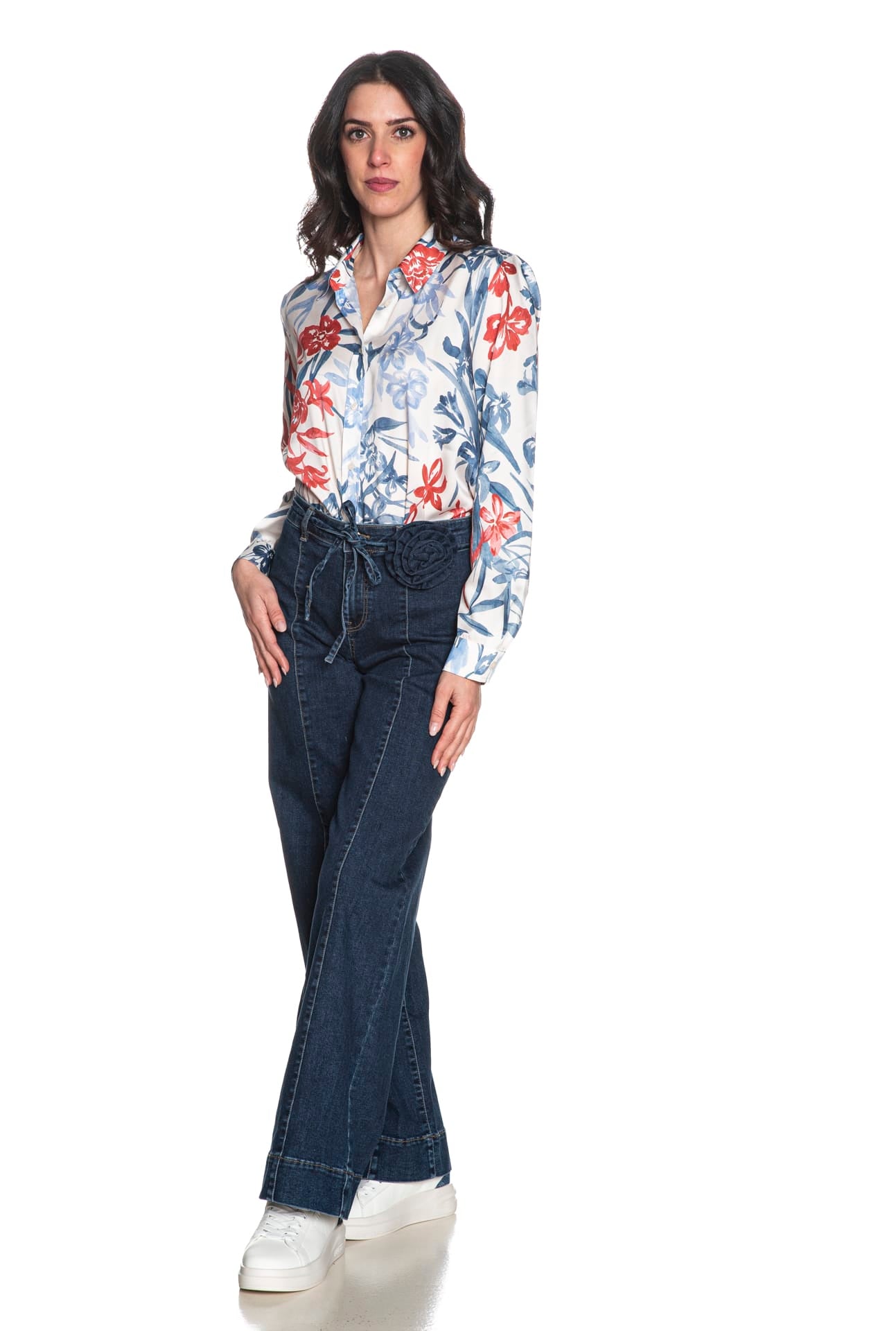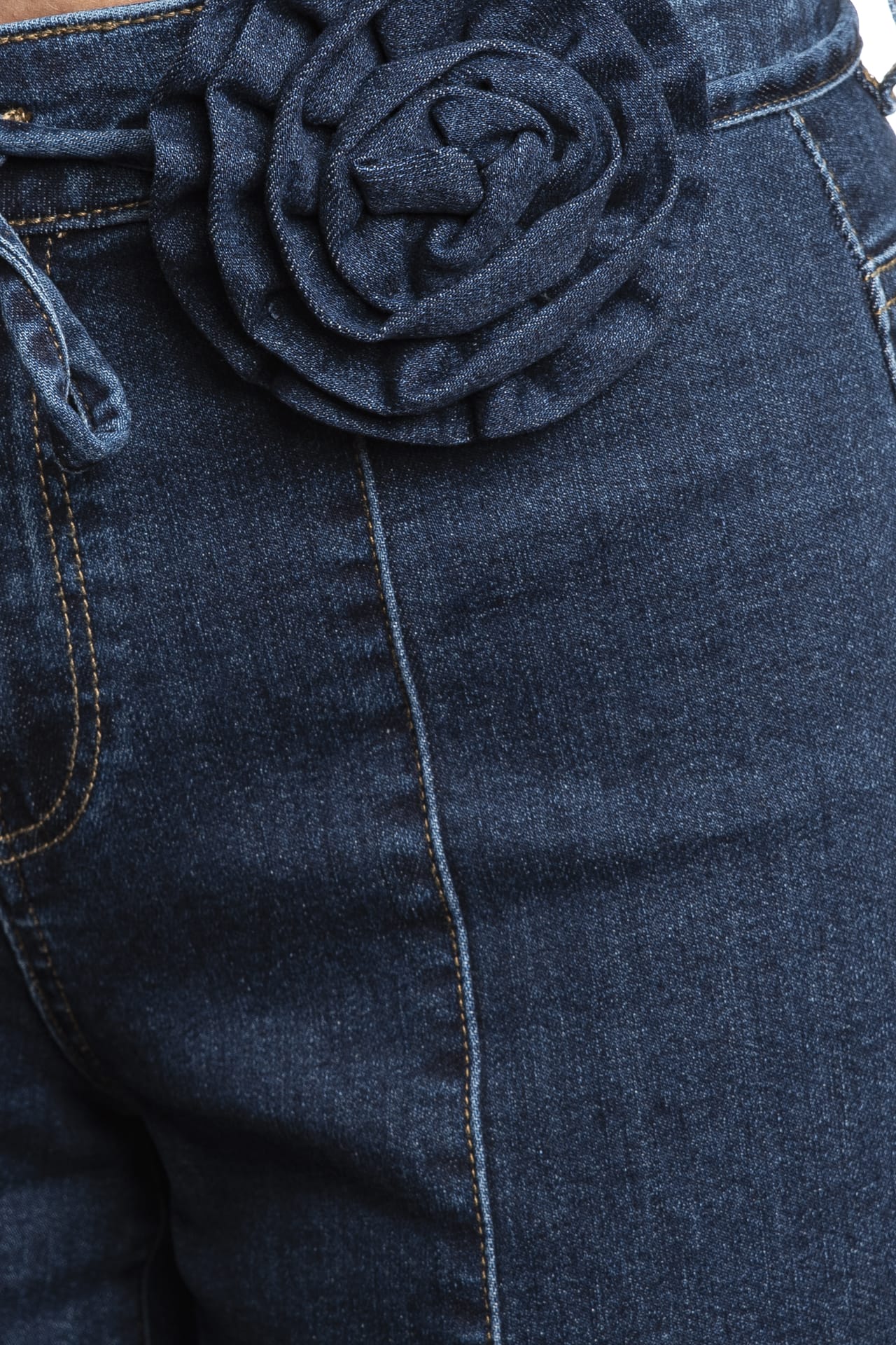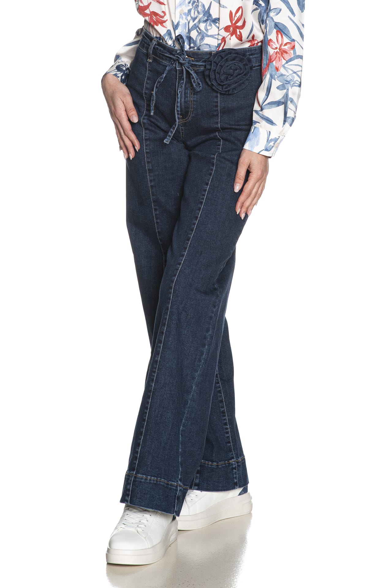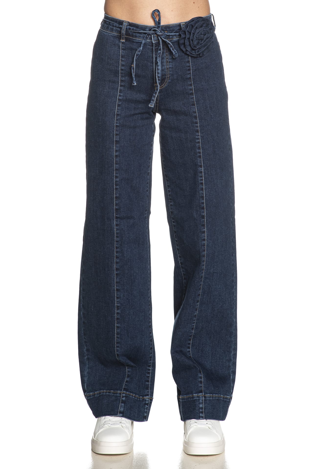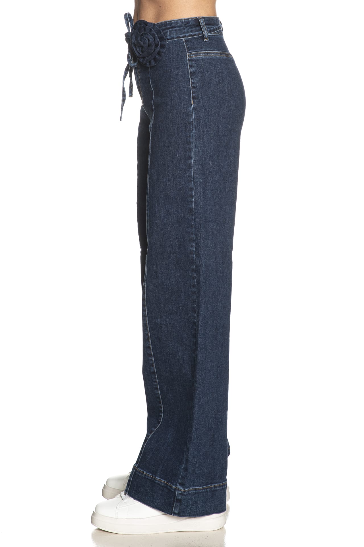 Jeans Only Madison Wide Rose da donna in denim stretch di cotone e poliestere sottoposto a tarattamento per un aspetto vintage, a vita alta, con cuciture ribattute al centro della gamba ampia, chiusura zip nascosta e bottone, orlo alto e cintura annodabile con applicazione rosa in vita