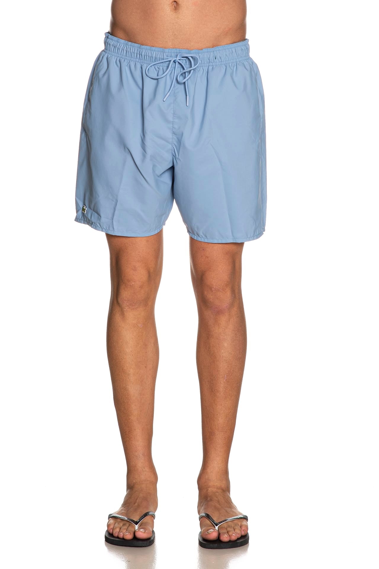Costume Lacoste Quick Dry da uomo in taffetà di poliestere ad asciugatura rapida, modello shorts da mare di media lunghezza, con mutandina interna in rete, elastico e coulisse in vita, tasche laterali a filo, tasca posteriore applicata e monogramma istituzionale ricamato a bordo gamba, in piccola sacca di tessuto ripstop