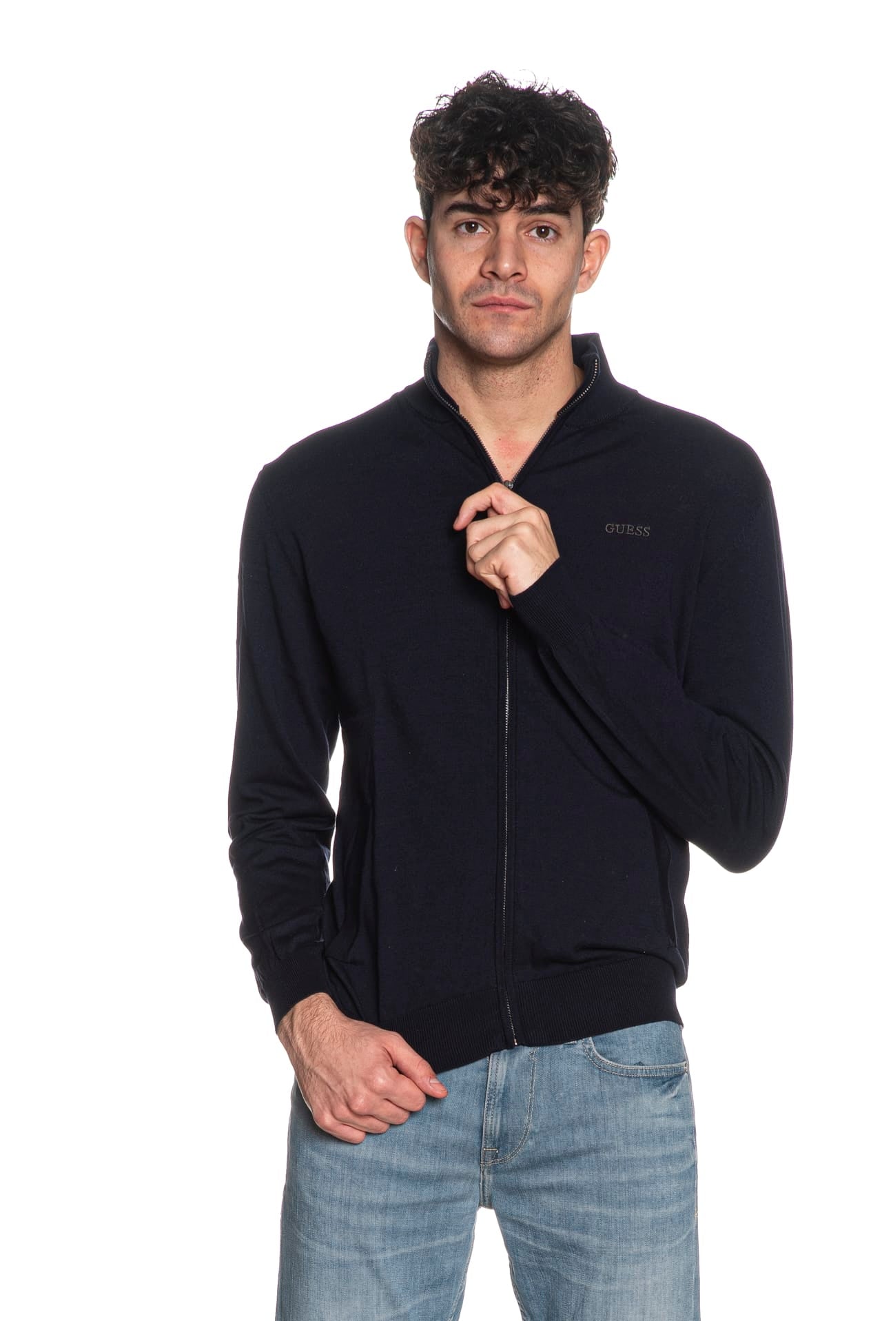 Maglia Guess Kaliq Lg Embr da uomo, in filato rasato di cotone parzialmente organico mercerizzato per una migliore tenuta del colore, a manica lunga, con collo alto polsini e cannolé a costine, tasche a filo frontali, micro logo lettering ricamato tono su tono sul petto e chiusura full zip a scomparsa