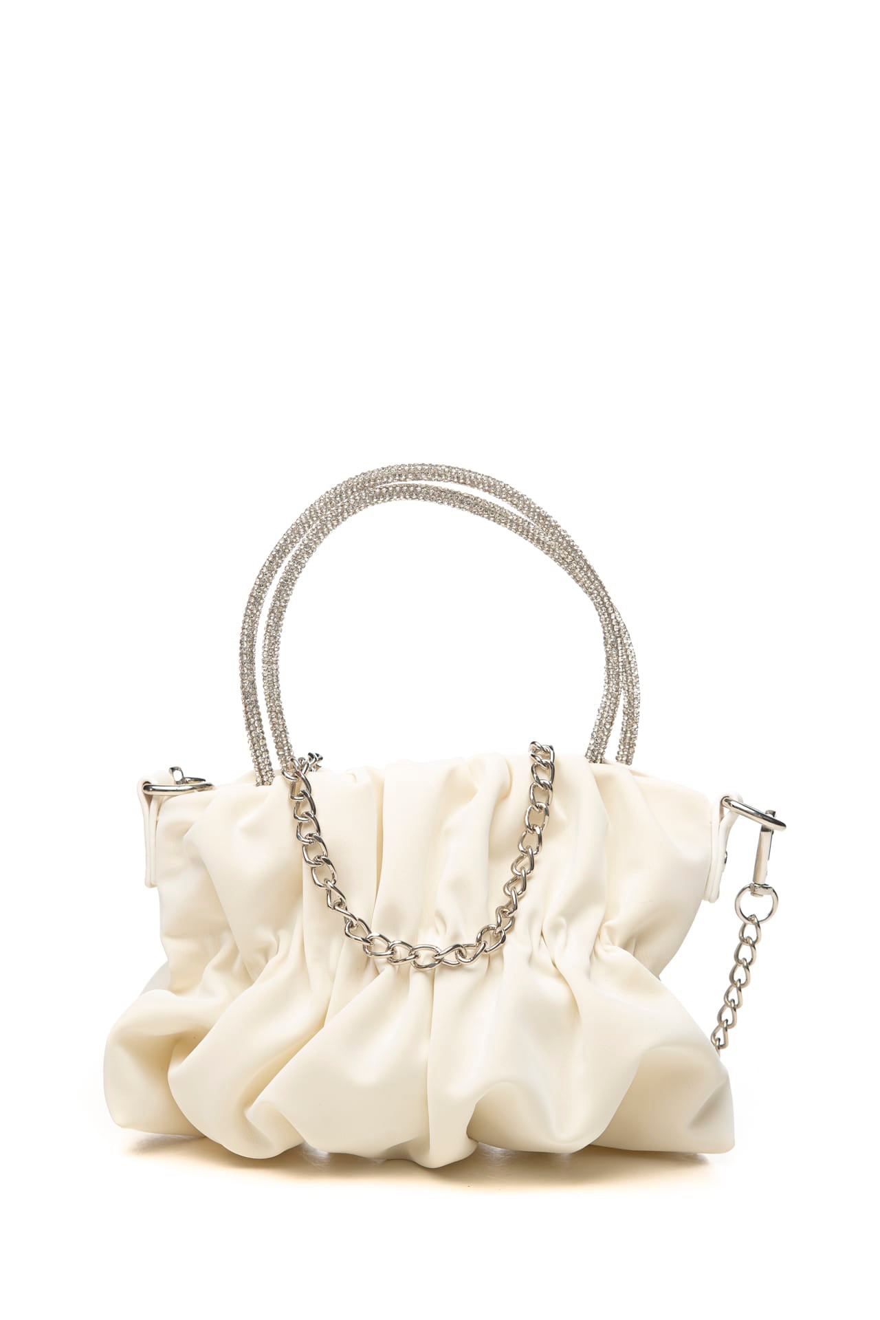 Borsa Sarabanda Premium Pure Elegance Ceremony Hb da bambina in poliuretano, a mano, con arricciatura centrale, chiusura magnetica, manici corti in tubolare di strass e tracolla rimovibile in catena acciaio Misure: 20x6,5x13 cm