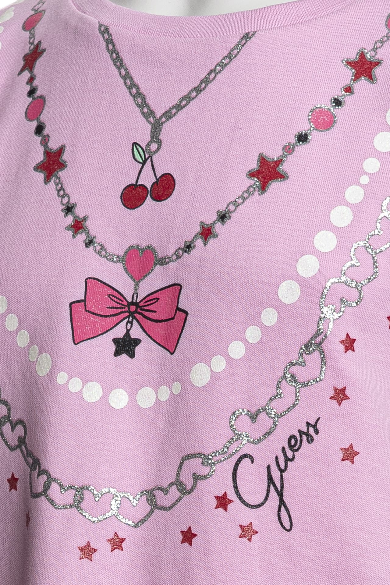 Abito Guess Cherry Necklace da bambina in interlock di cotone parzialmente organico, lunghezza midi, smanicato con ruche cucite nel giromanica, scollo tondo e maxi stampa collana glitterata