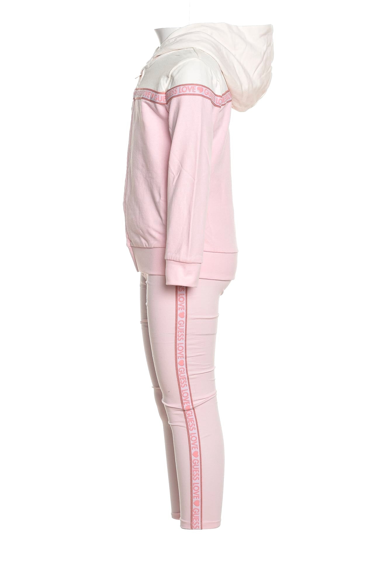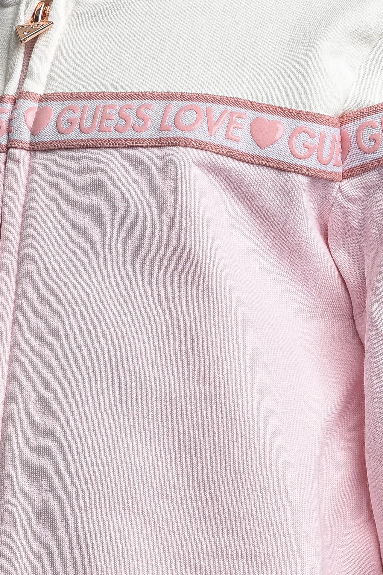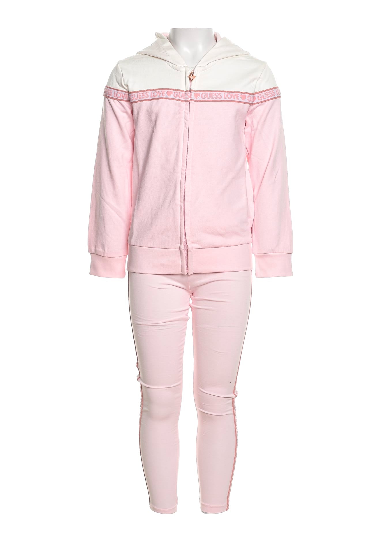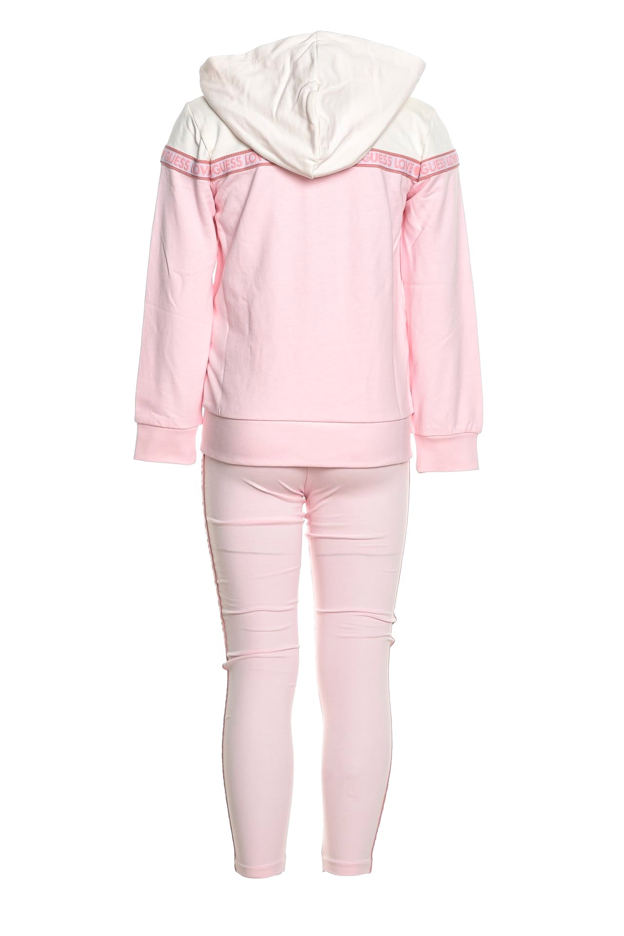 Completo Set Guess Active Top Z Lgg Pnk da bambina in tessuto garzato di cotone parzialmente organico composto da, felpa a due blocchi di colore, con chiusura centrale full zip, cappuccio fisso foderato a contrasto, banda in gros grain bicolore stampata con lettering gommato che si estende frontalmente da manica a manica lunga, polsini e fondo in maglina, leggins in jersey stretch con vita elasticizzata e banda bicolore logata gommata applicata lateralmente sulle gambe