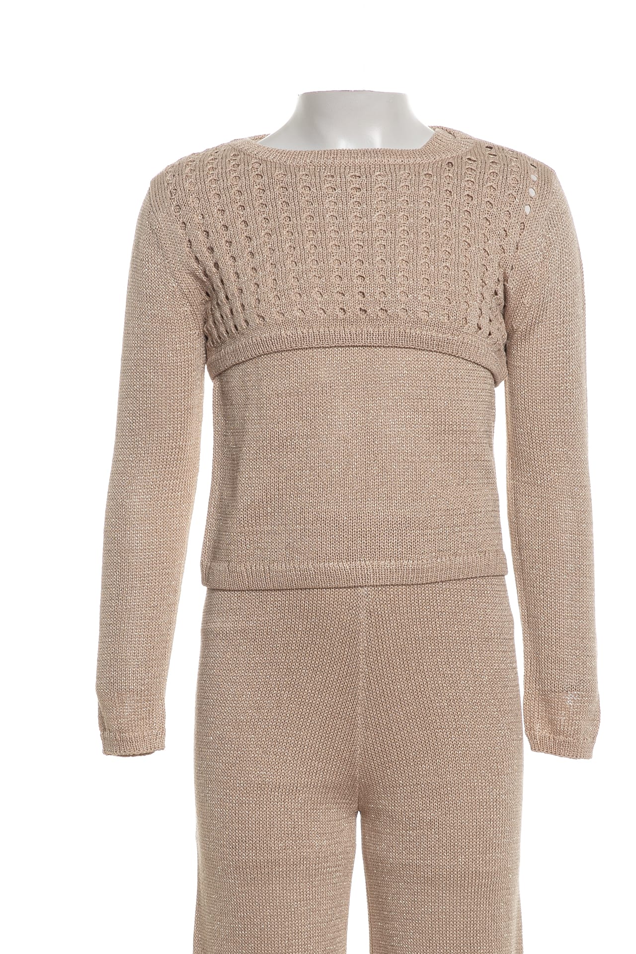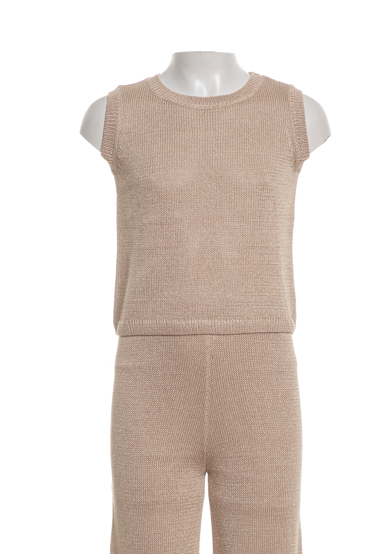 Completo Set Sarabanda Cut Knit Lu Twin da bambina in filato rasato lurex di misto viscosa poliammide e poliestere, composto da, gilet con giroccollo giromanica e cannolè a costine, maglia crop con lavorazione traforata sul davanti, girocollo polsini e cannolè a coste