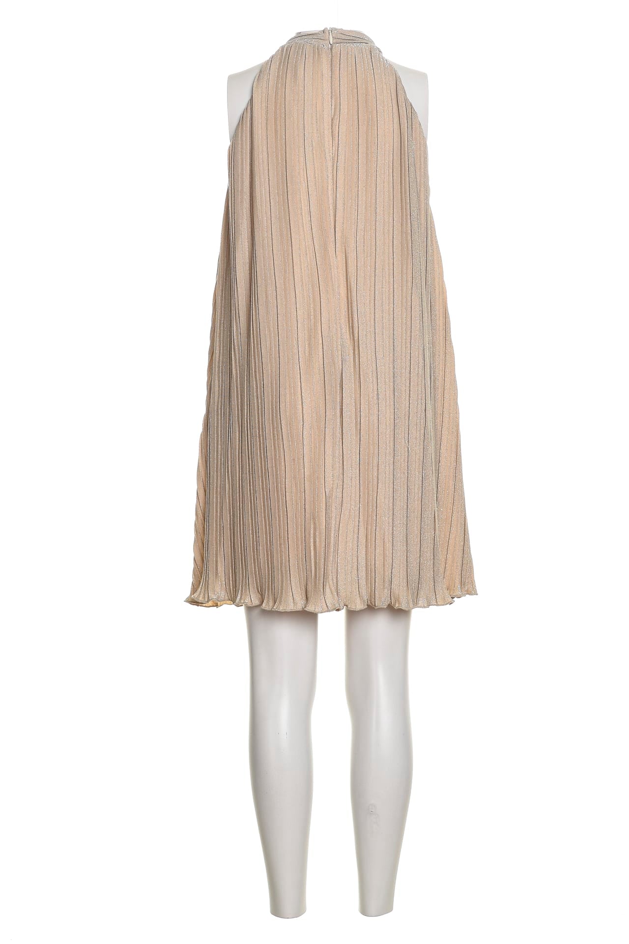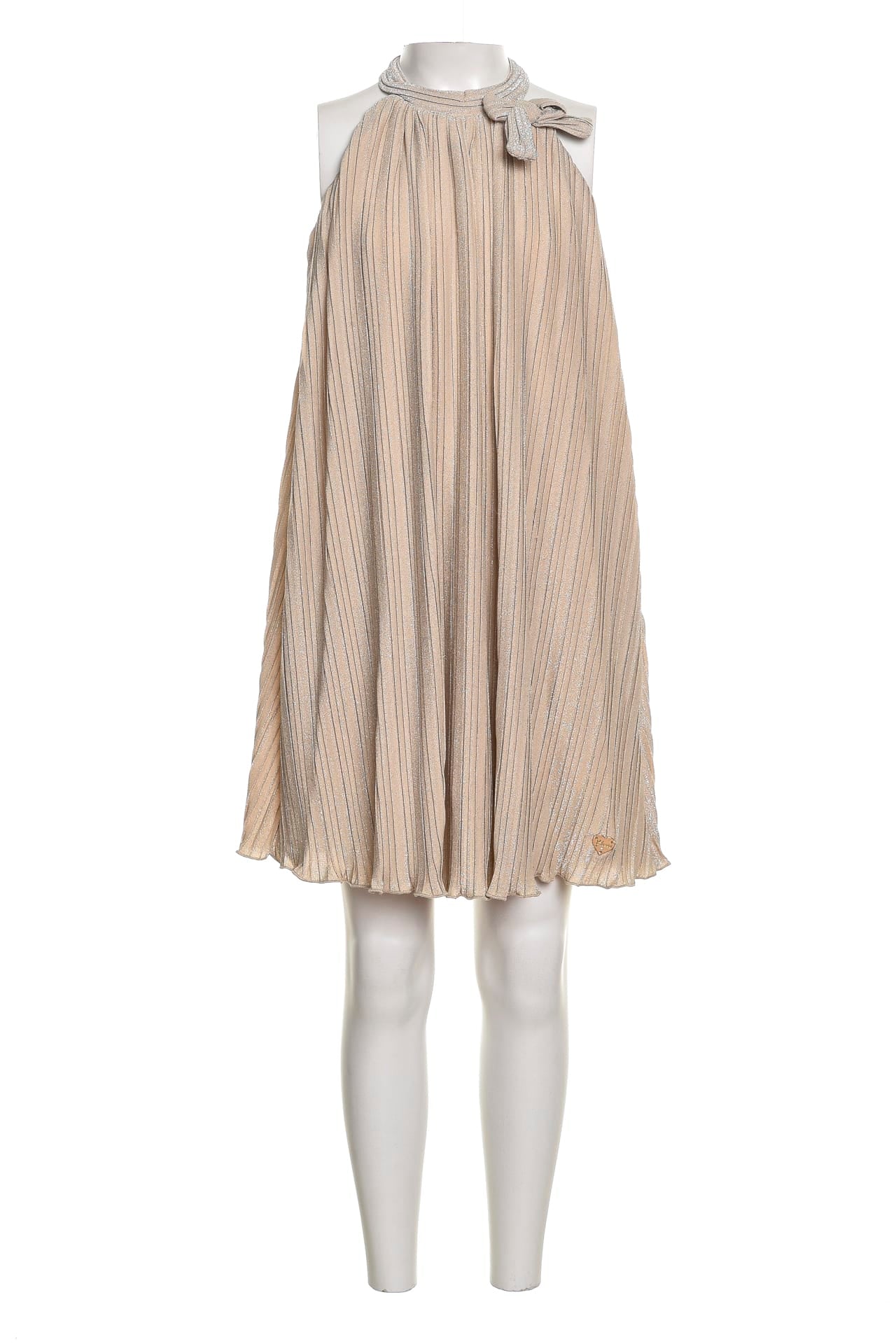 Vestito Guess Shiny Knit Tent da bambina in tessuto a maglia plissè lurex di poliammide foderato in poliestere, modello dalla linea a tenda, con scollo all'americana decorato da fiocco, zip a scomparsa nel retro e orlo lattuga