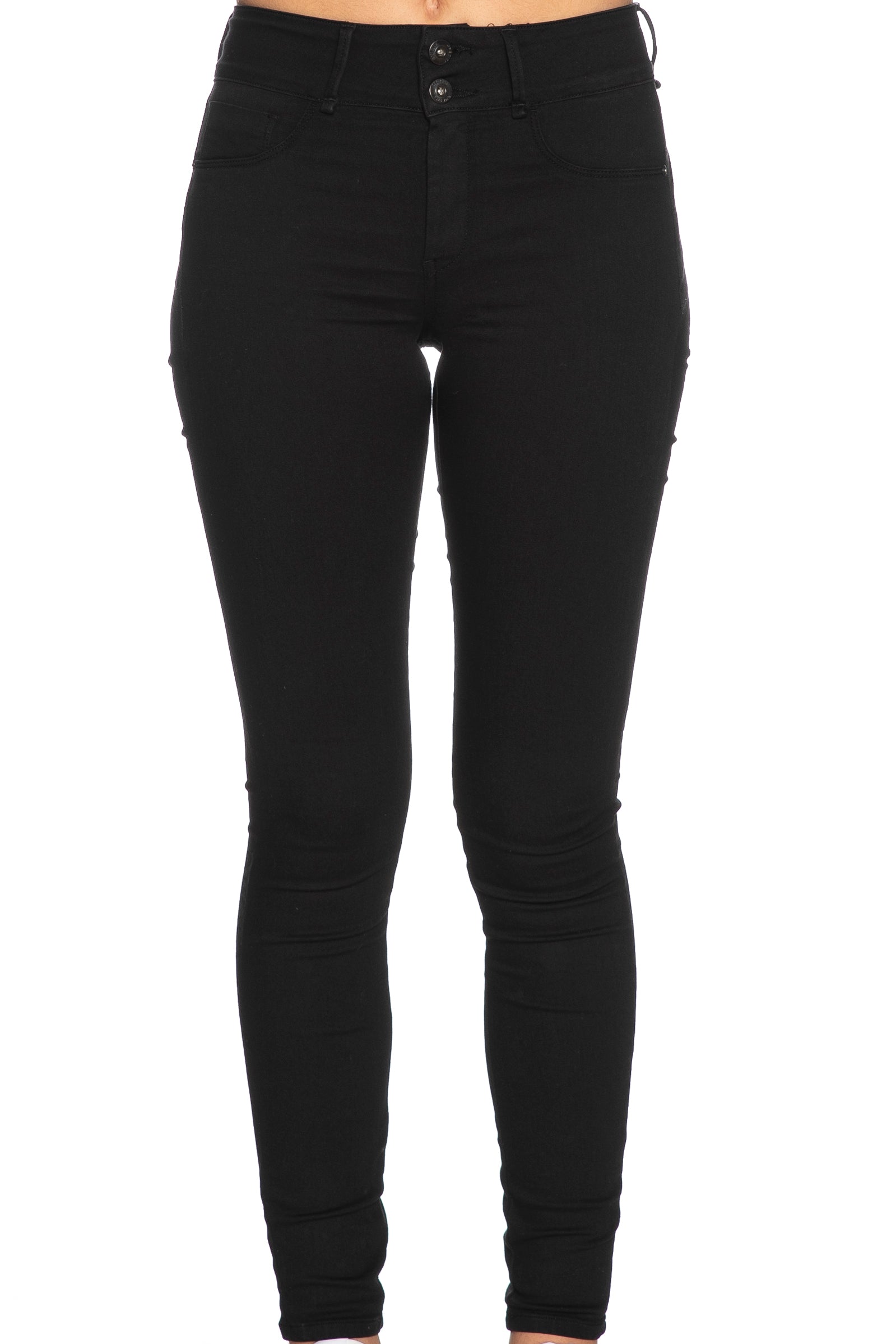 Pantalone Tiffosi Double Up da donna in tessuto stretch di misto cotone e poliestere, modello cinque tasche push in e up a vita alta, skinny e slim dal fit adattabile per una silouette perfetta, con chiusura zip coperta e doppio bottone a vista in vita, finte tasche anteriori cucite e tasche posteriori a cuore