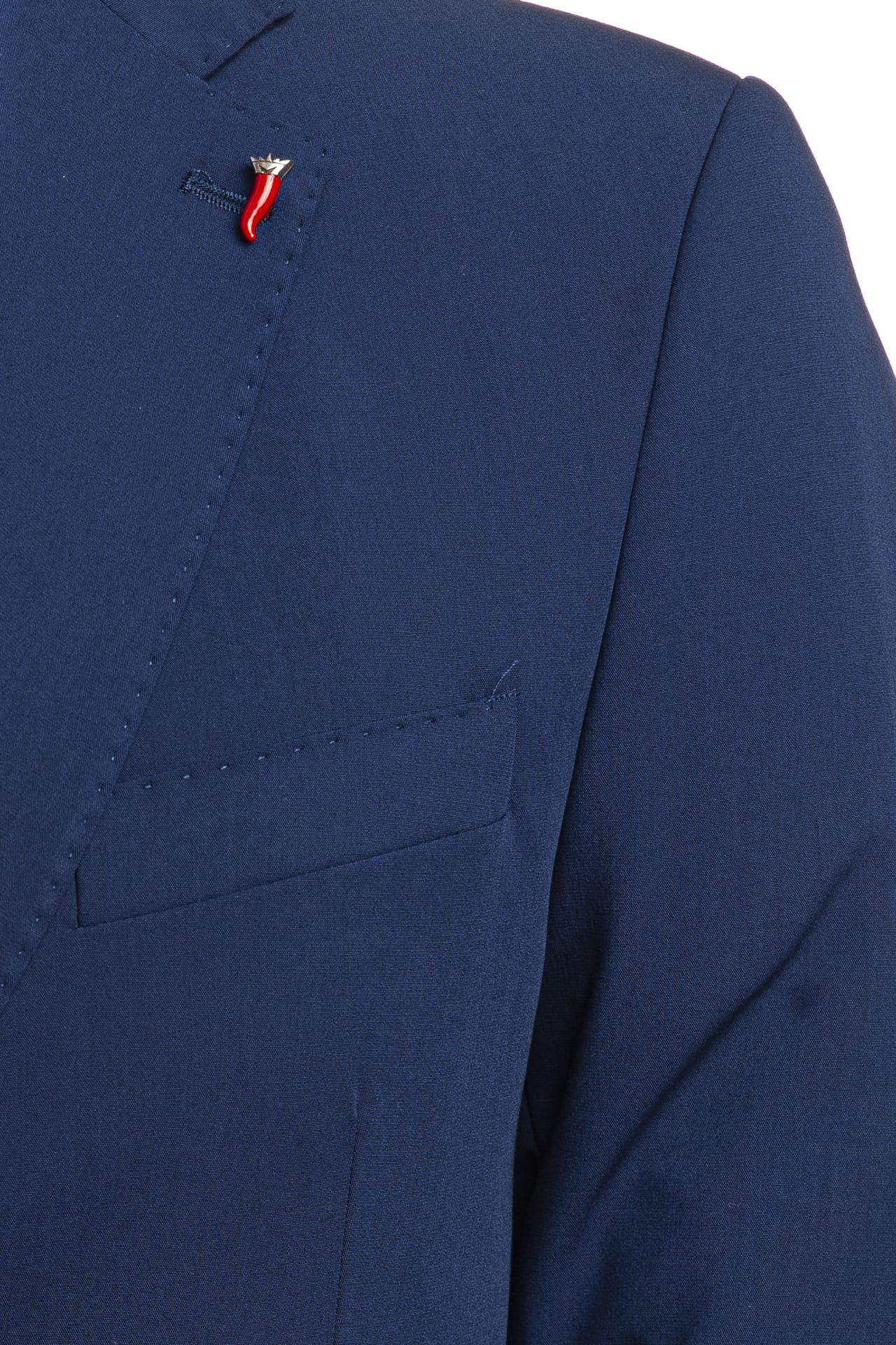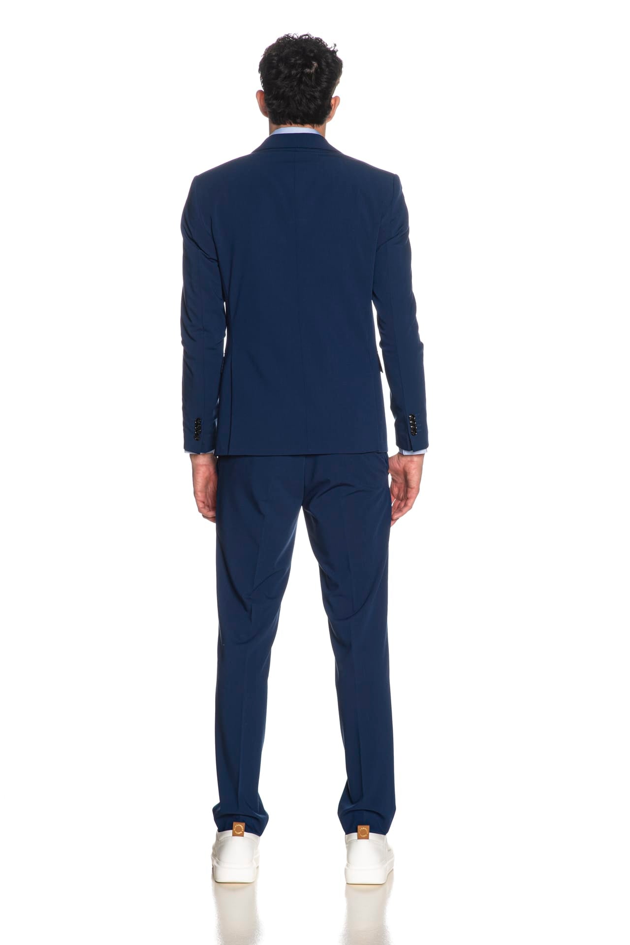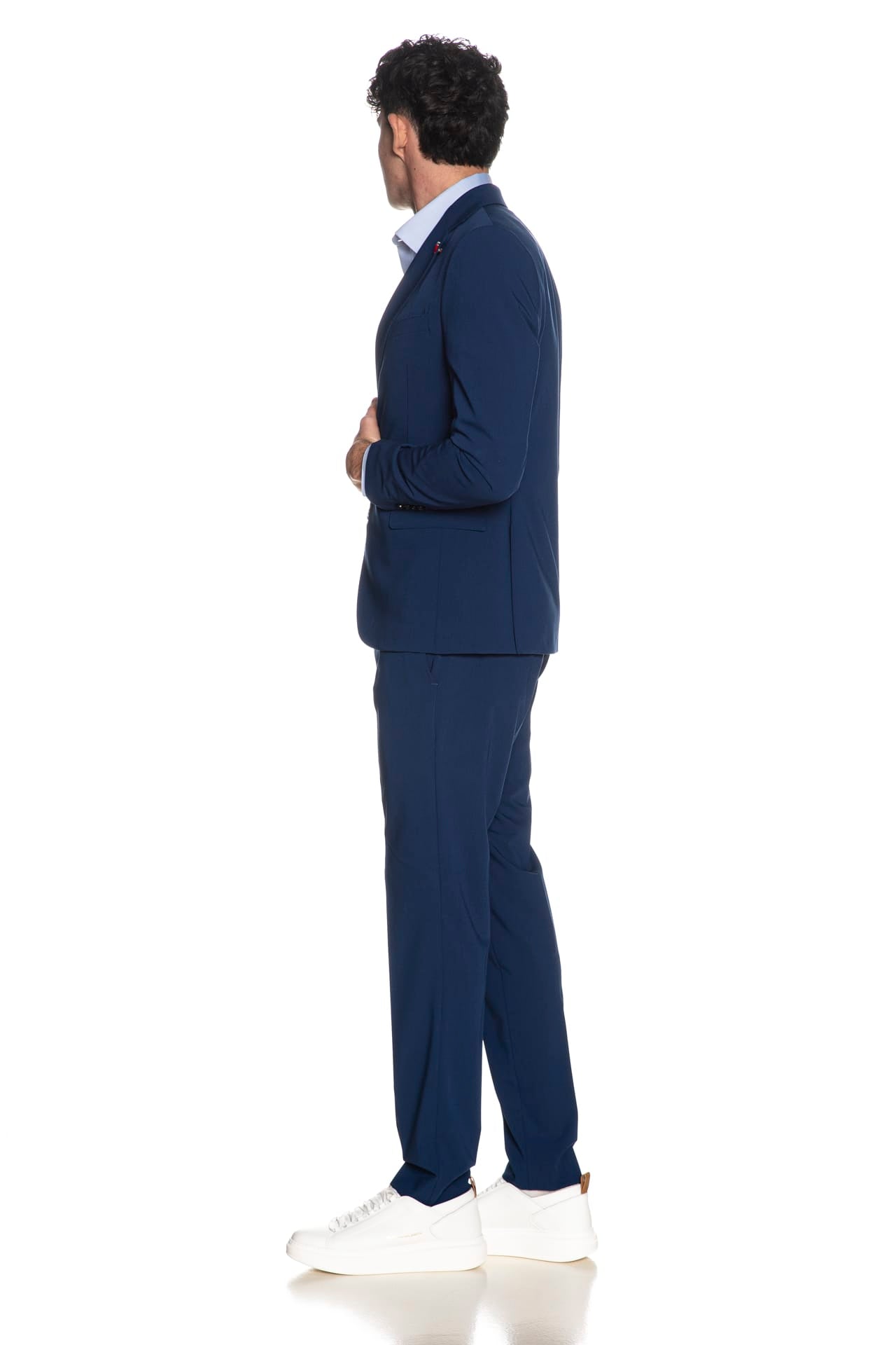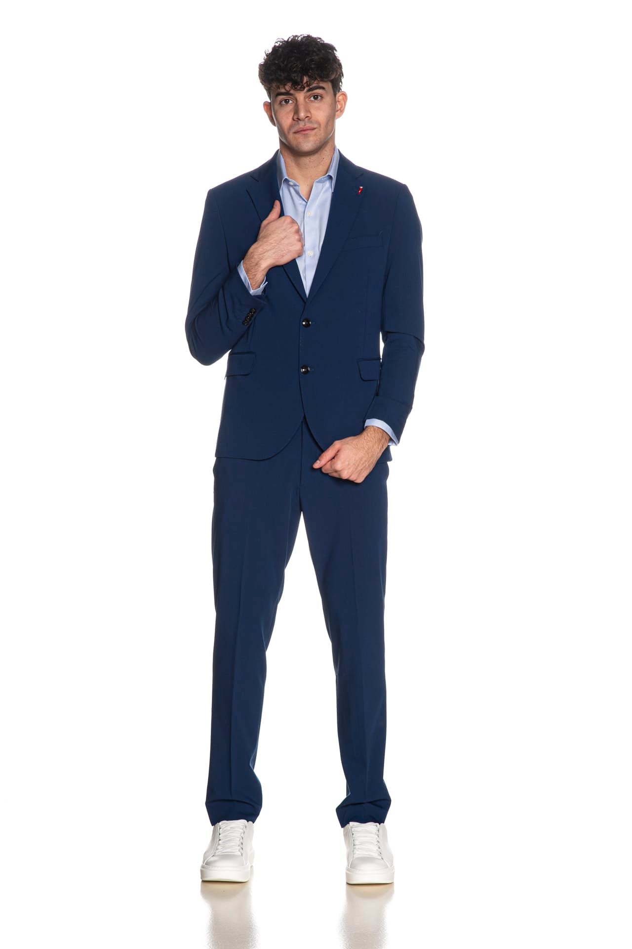 Completo Mulish Monet Ab72 da uomo in polyviscosa stretch drop 7 slim composto da: - Giacca modello blazer monopetto a due bottoni interamente foderata, con revers classici impunturati tono su tono, tasca sul petto a barchetta e tasche anteriori a filo con patta, spilla real smaltata con chiusura a farfalla all'asola e spacchetti posteriori - Pantalone modello chino con chiusura zip e gancetto a slitta coperti, tasche laterali america e tasche posteriori a filo