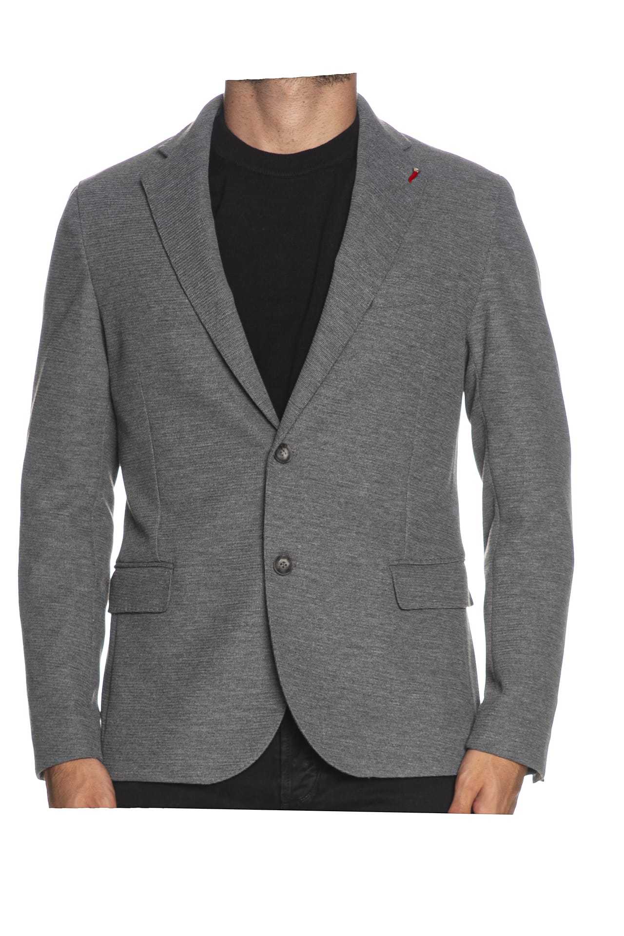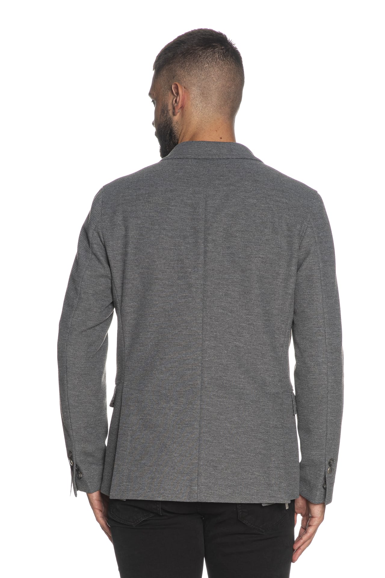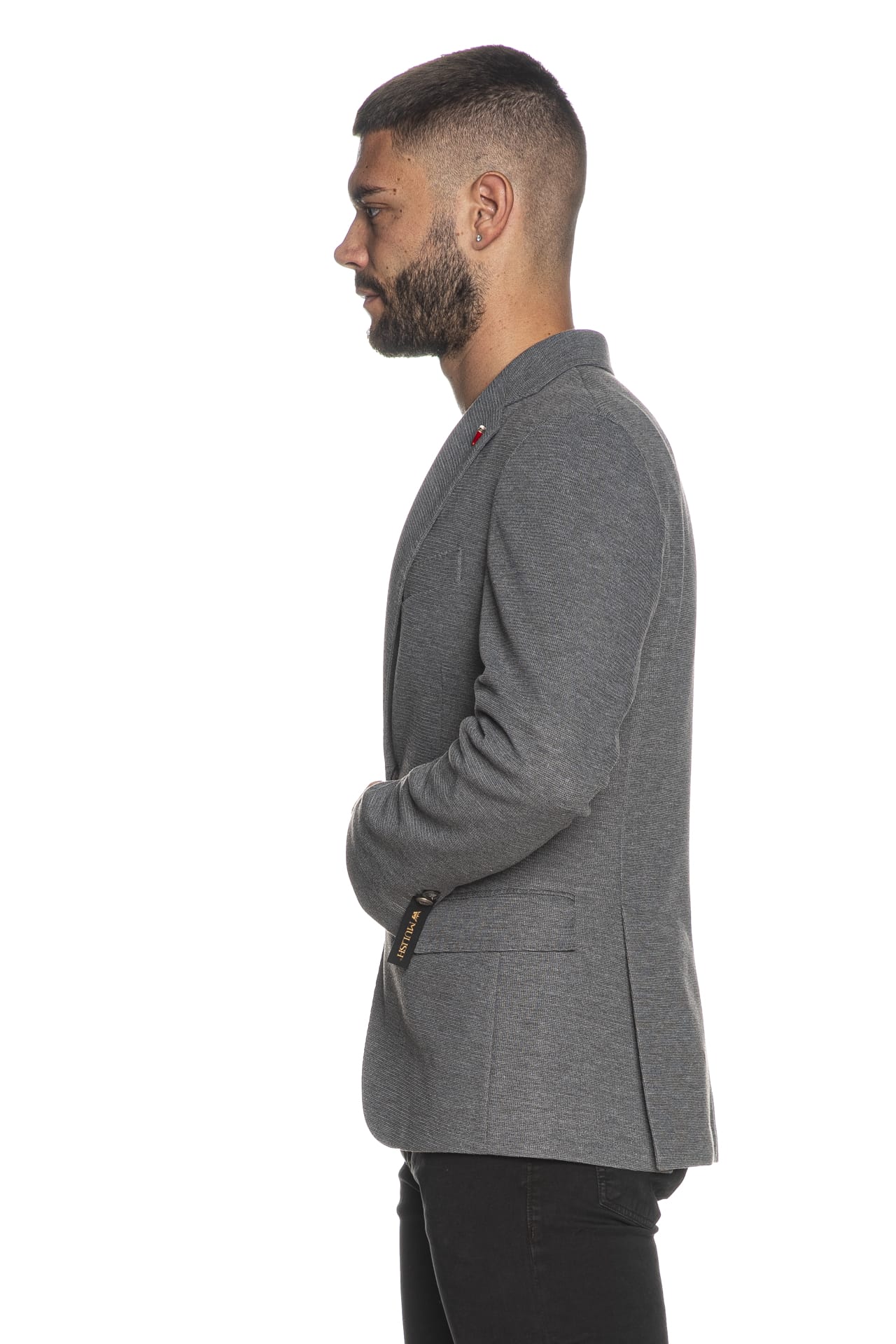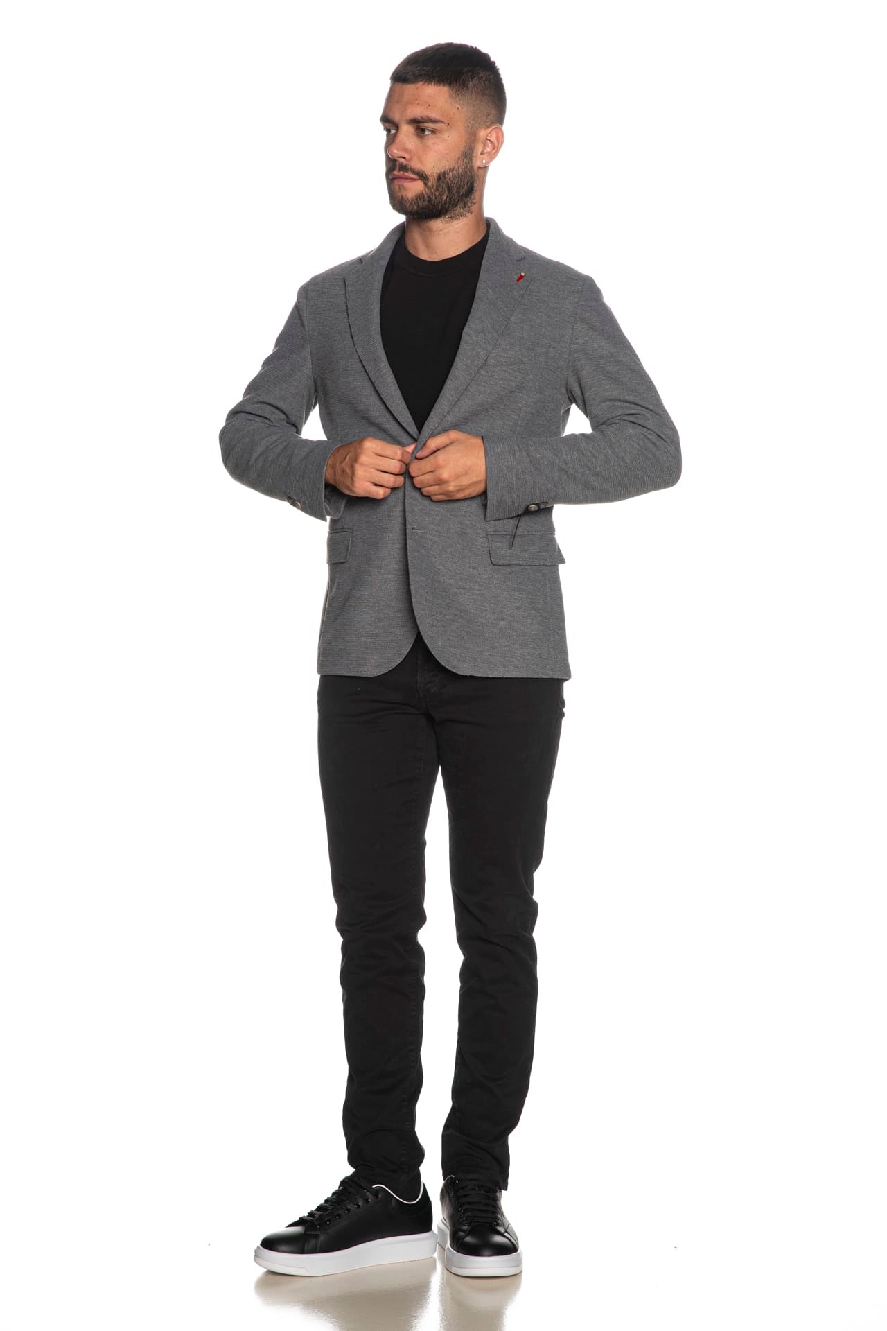 Giacca Mulish Ade da uomo in tessuto armaturato effetto maglia jersey di misto poliestere e viscosa stretch, modello blazer monopetto a due bottoni sfoderato e destrutturato, con revers classici impunturati tono su tono, tasca sul petto a filo e tasche anteriori con patta, spilla real smaltata con chiusura a farfalla all'asola, dettaglio bottone logato ai polsini e spacchetti posteriori