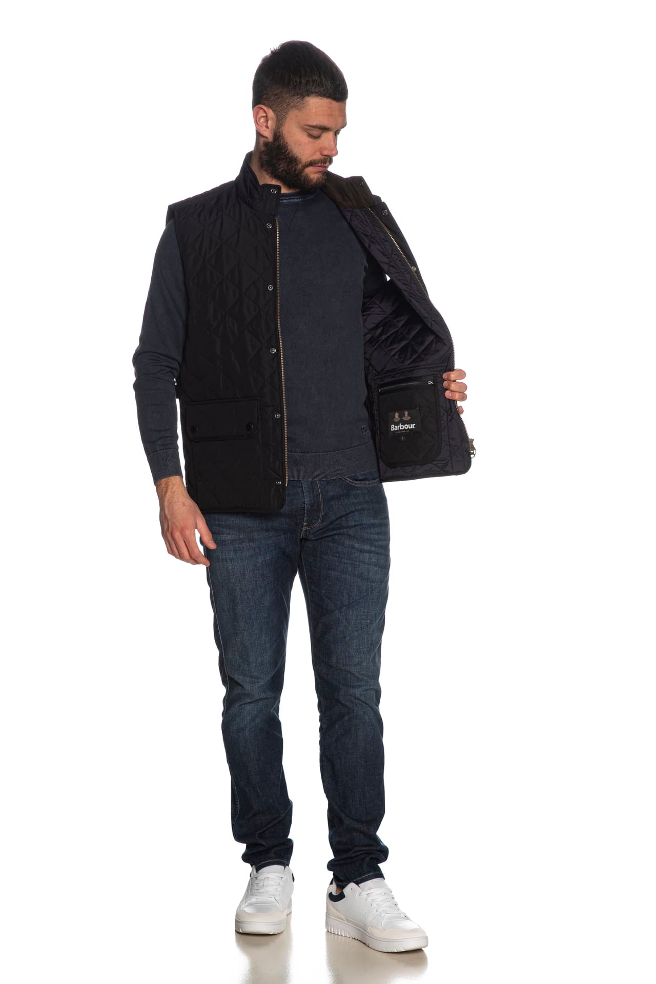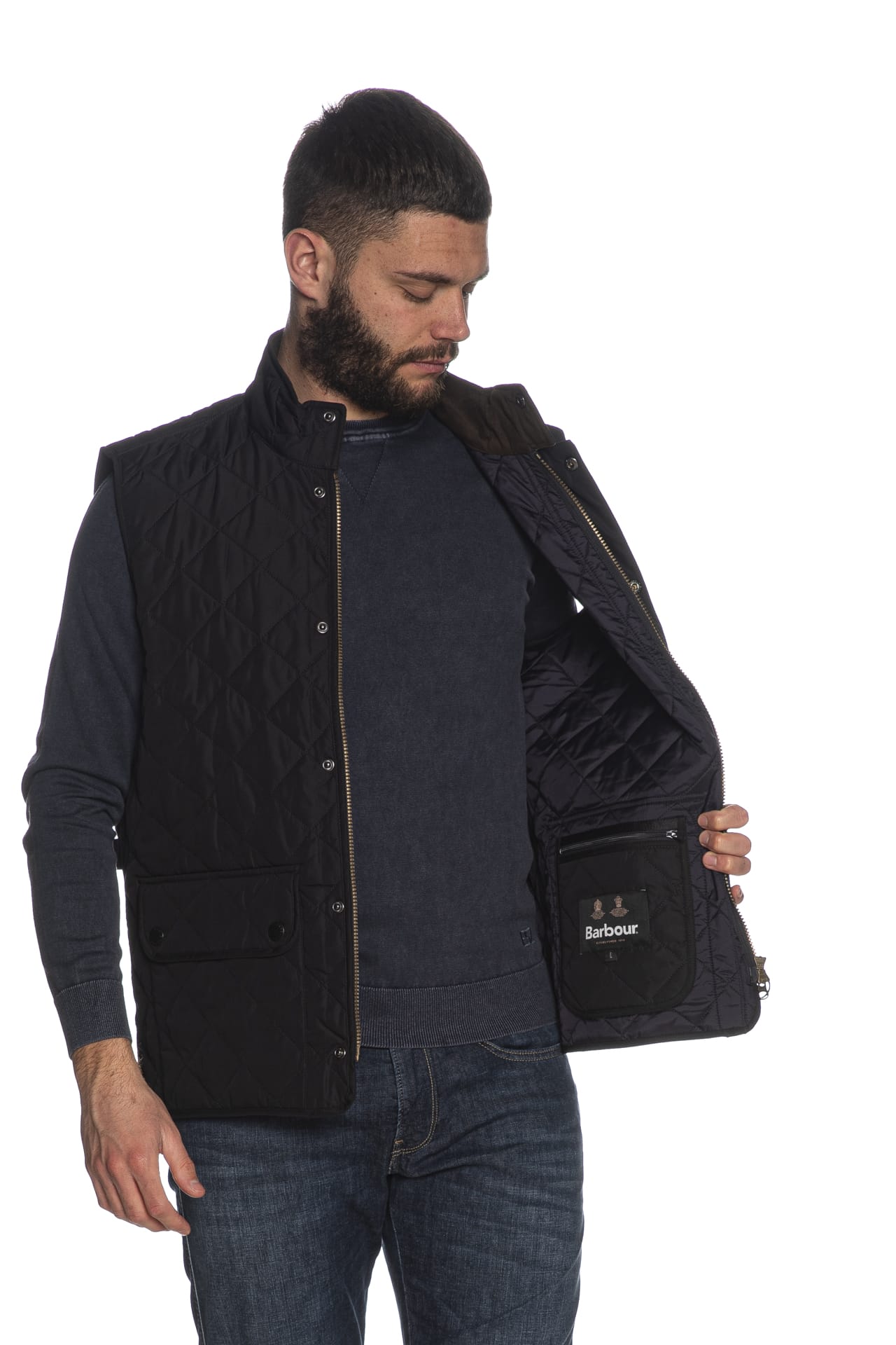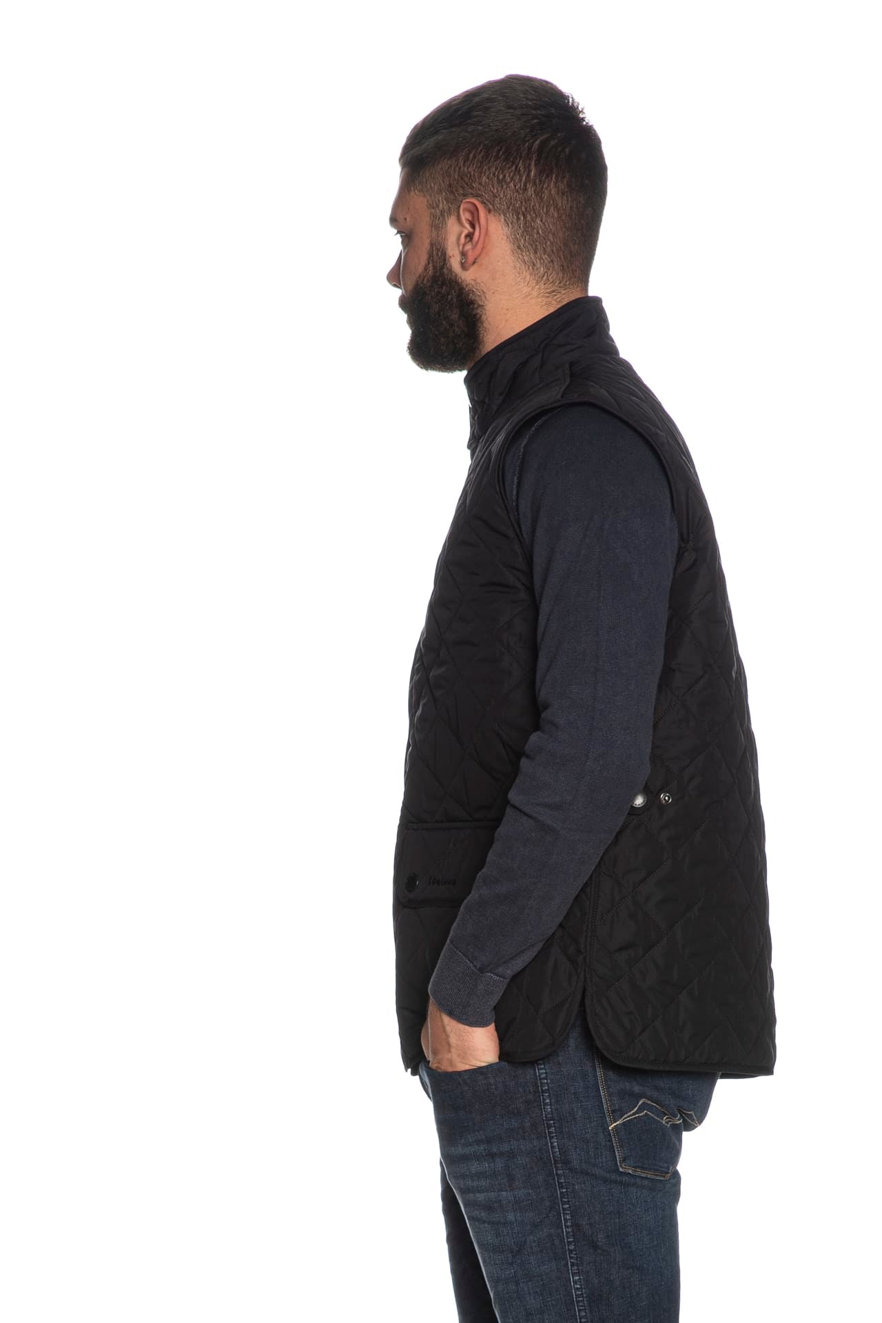 Smanicato Barbour New Lowerdale da uomo in tessuto trapuntato a rombi di poliestere, tailored fit in versione rivisitata del classico Lowerdale, con interno colletto in microfibra a contrasto colore, chiusura con zip a doppio cursore coperta e bottoni a pressione a vista, leggera imbottitura sintetica, stringa gancio logata retro collo per appendere il capo, tasche anteriori patch con patta, fit regolabile sui fianchi e spacchetti laterali stondati