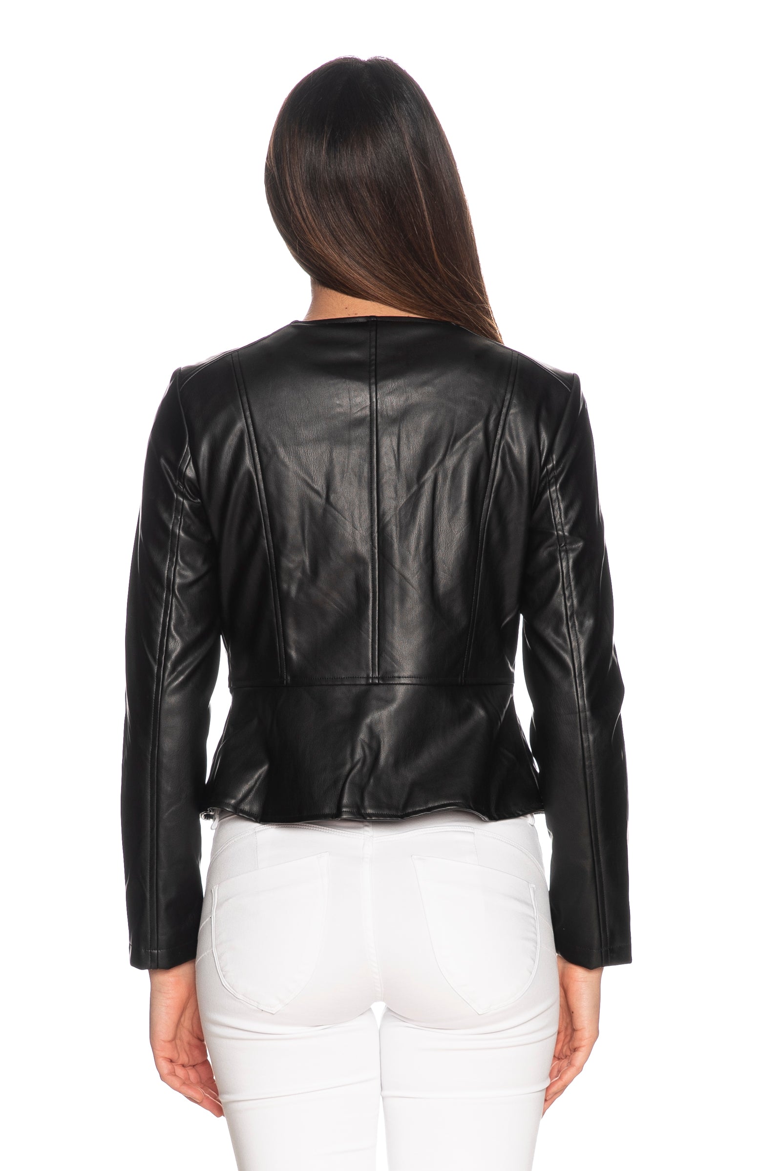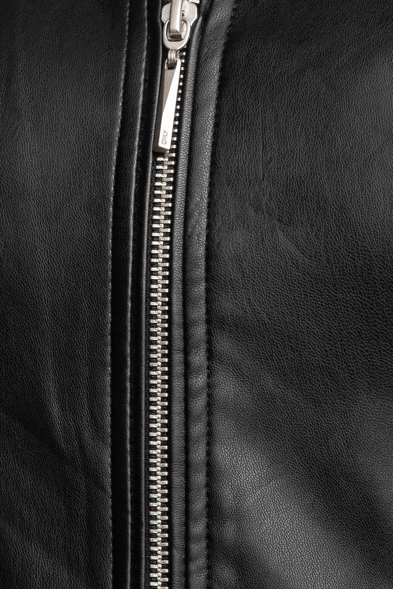 Giubbino Only Saramy da donna in ecopelle, corto sagomato senza collo a manica lunga con chiusura centrale full zip e balza sul fondo