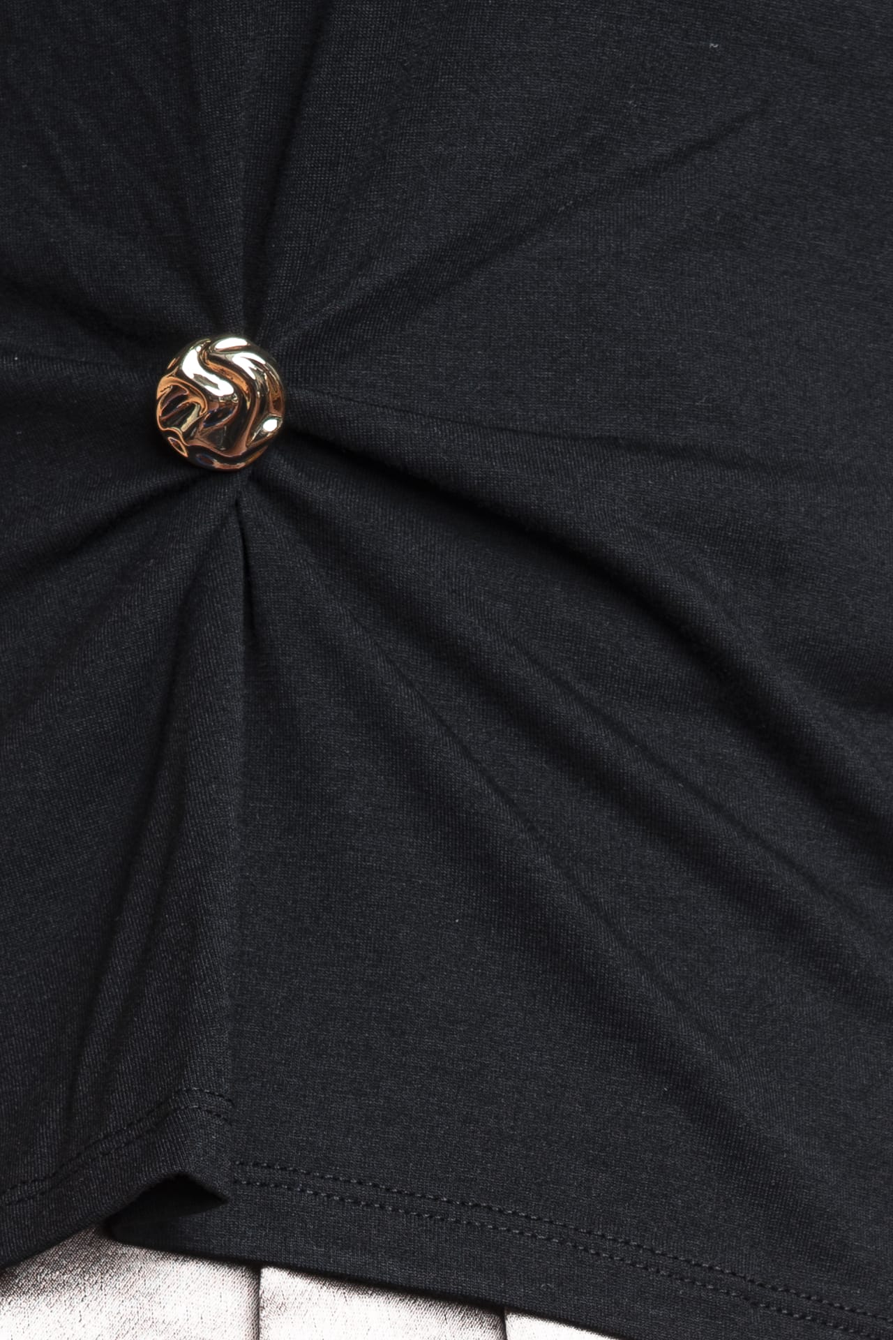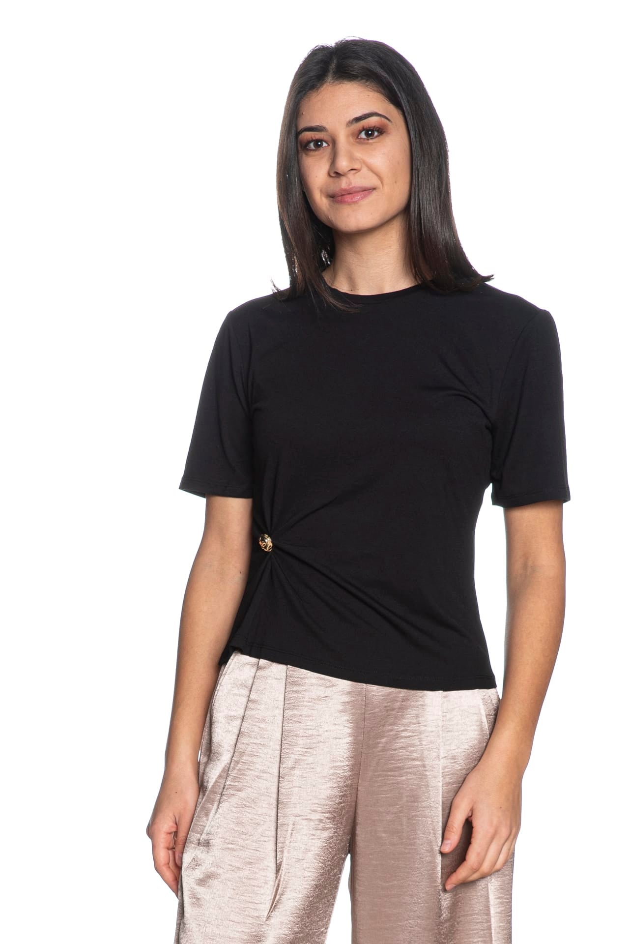 T Shirt Elena Detail da donna in jersey stretch di poliestere riciclato e viscosa, con manica corta, arricciatura con bottone metallico dorato su un lato e girocollo