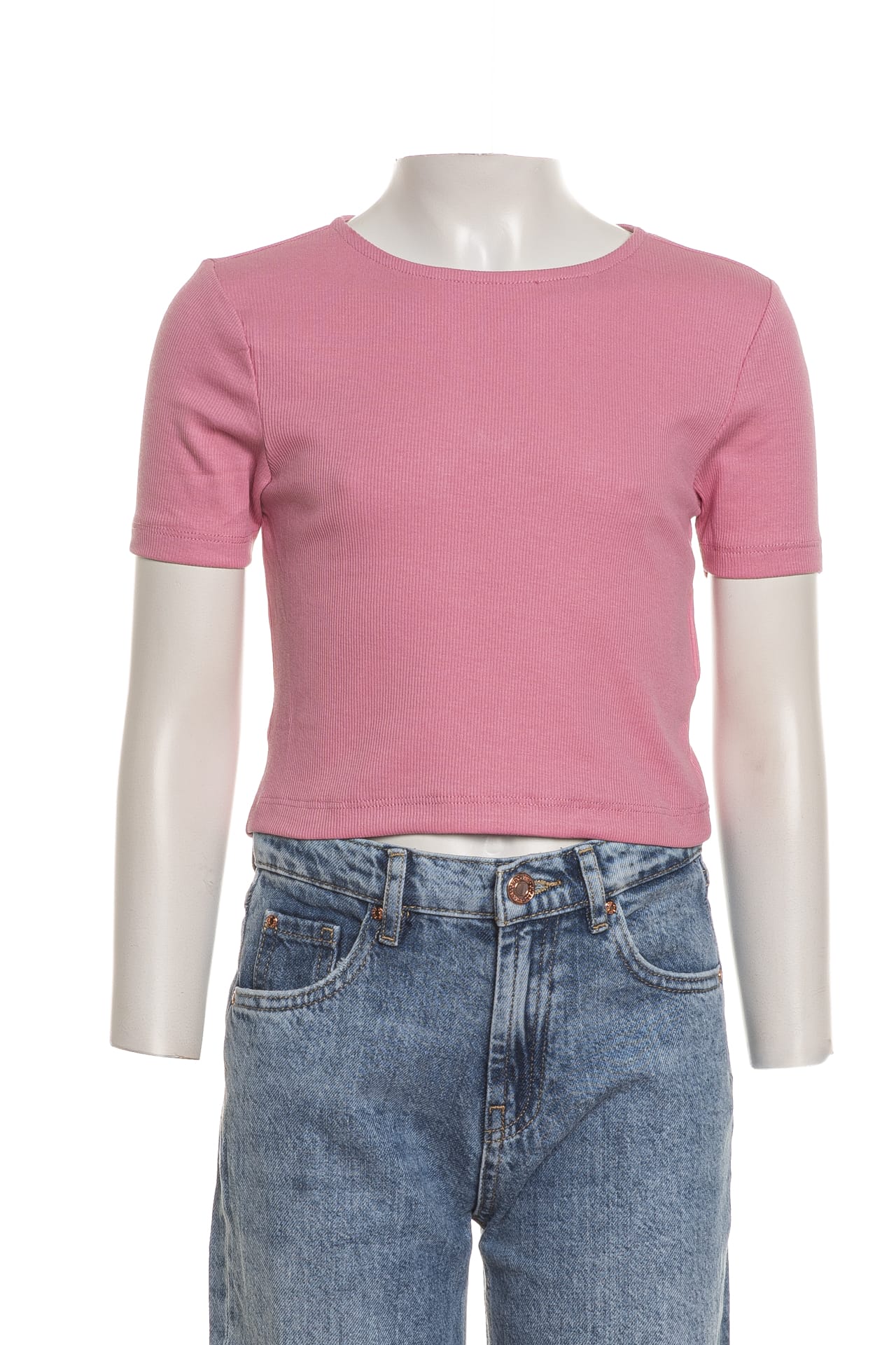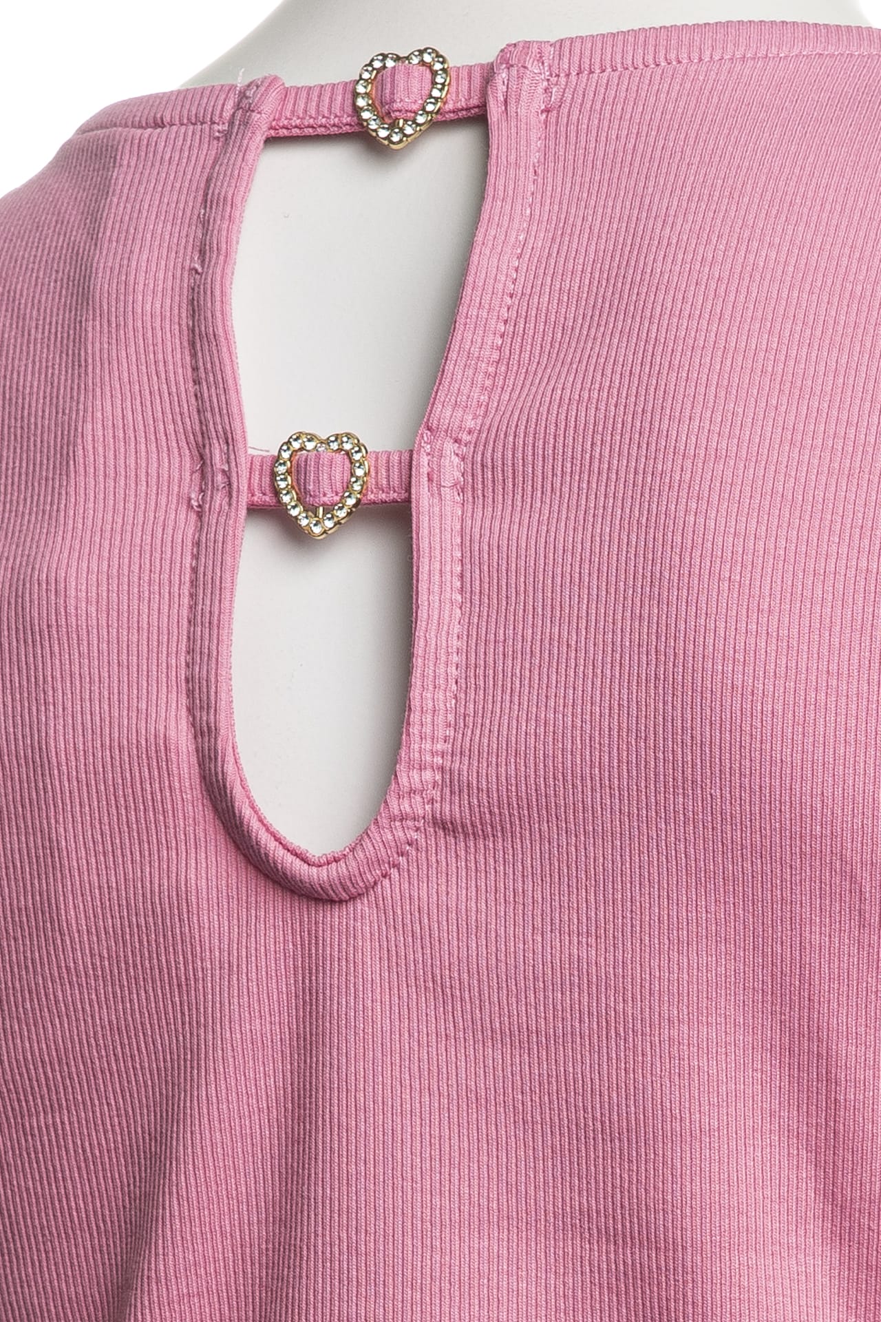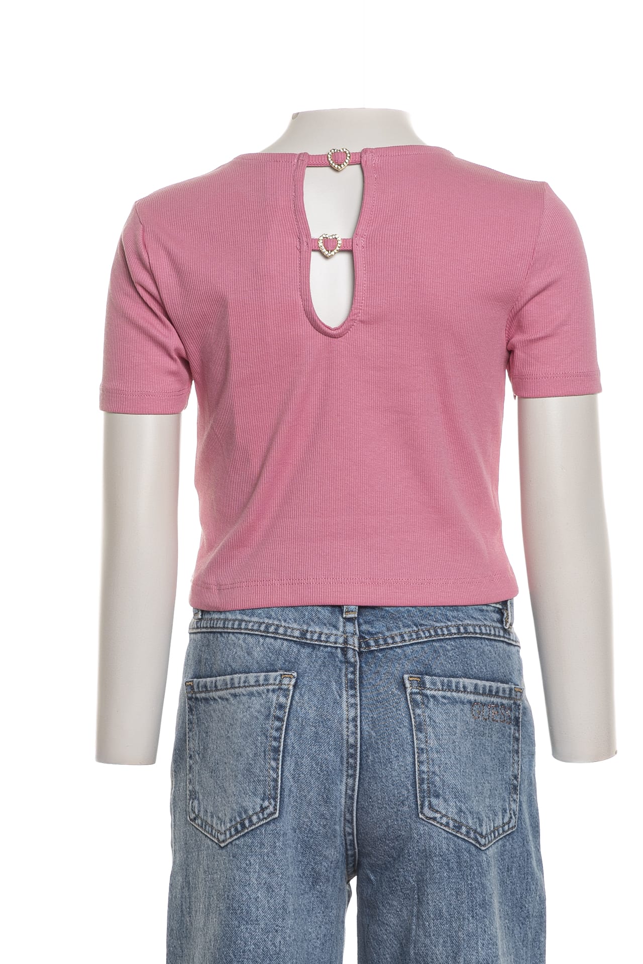 T shirt Kids Only Antonia da bambina in jersey stretch di cotone a costine, cropped fit girocollo a manica corta, con finte fibbie a cuore in strass su cut out sulla schiena