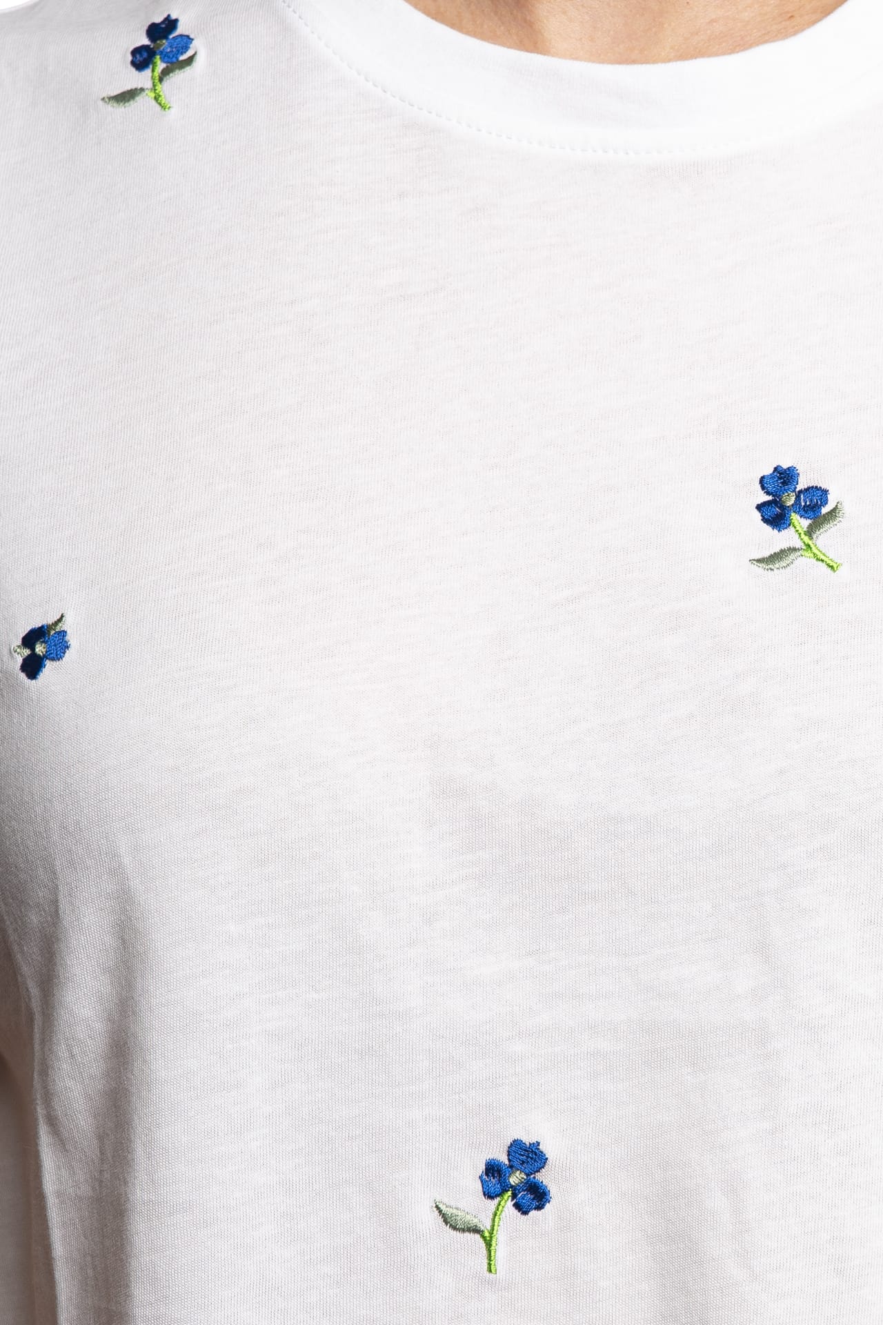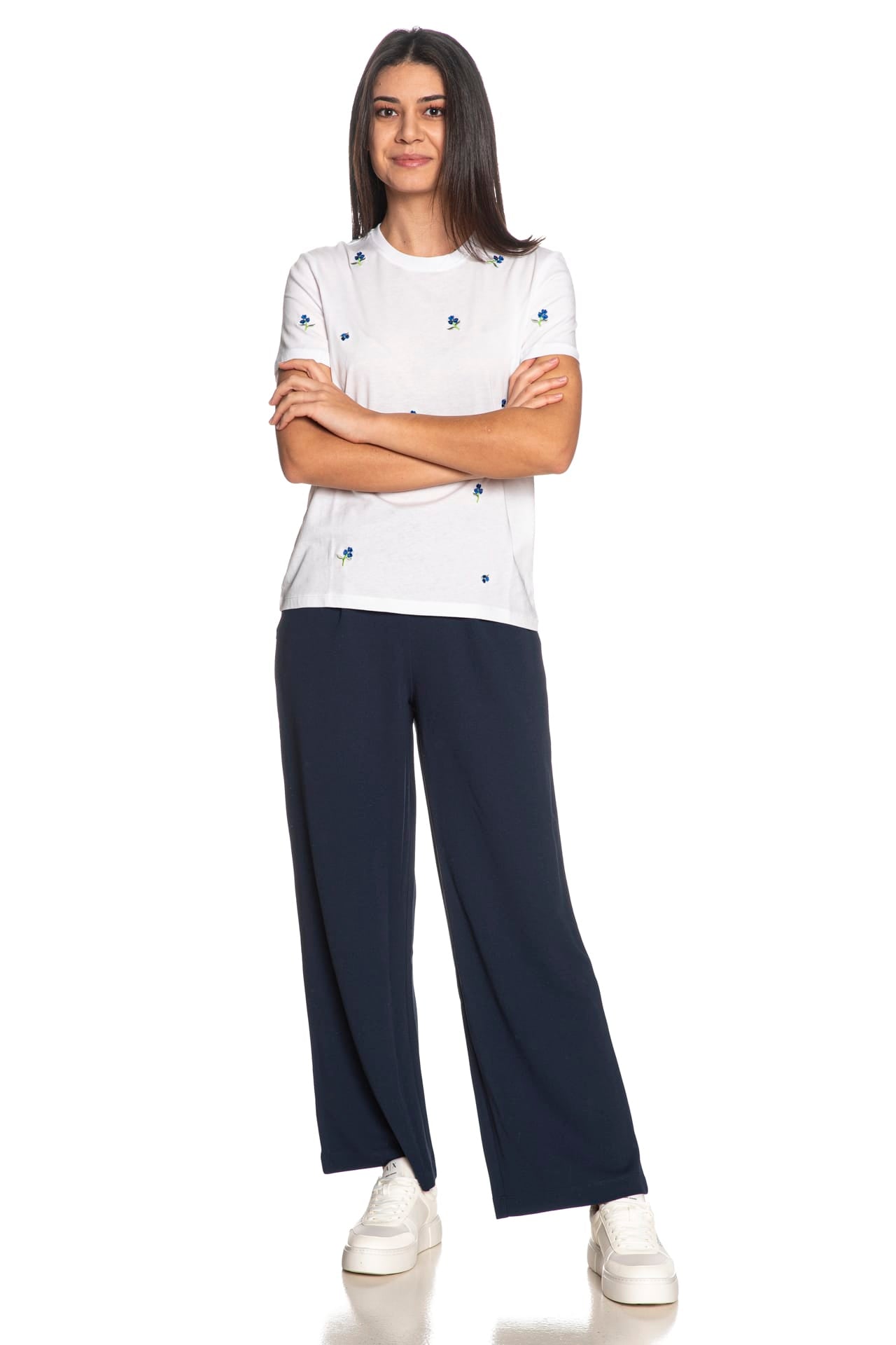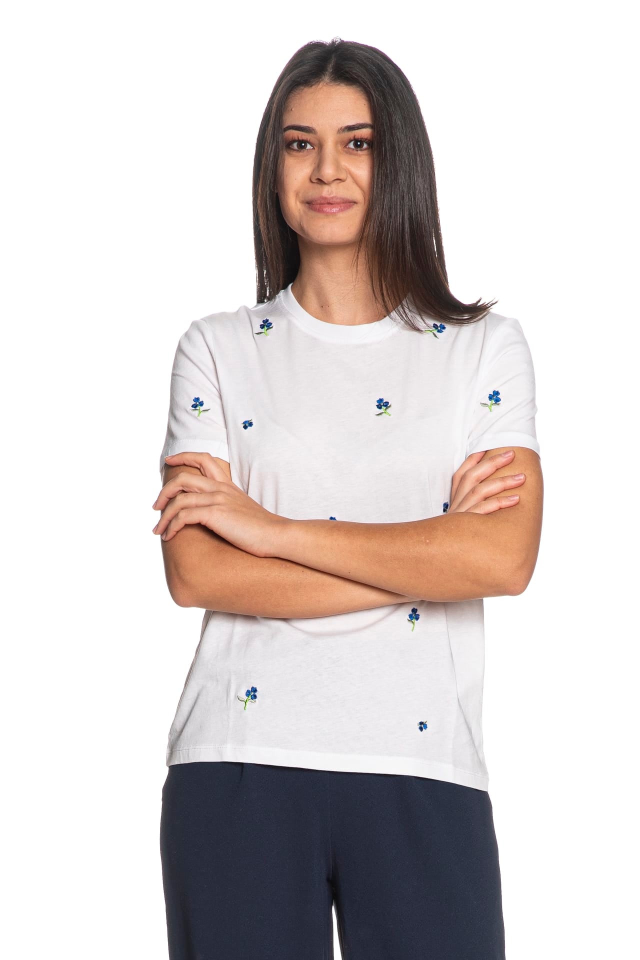 T shirt Only Ketty Flowers da donna in jersey di cotone organico, a manica corta, con girocollo in maglia a costine e piccoli fiori blu ricamati a filo bicolore sul lato anteriore