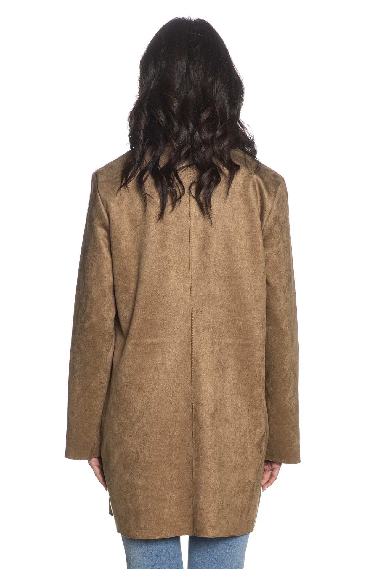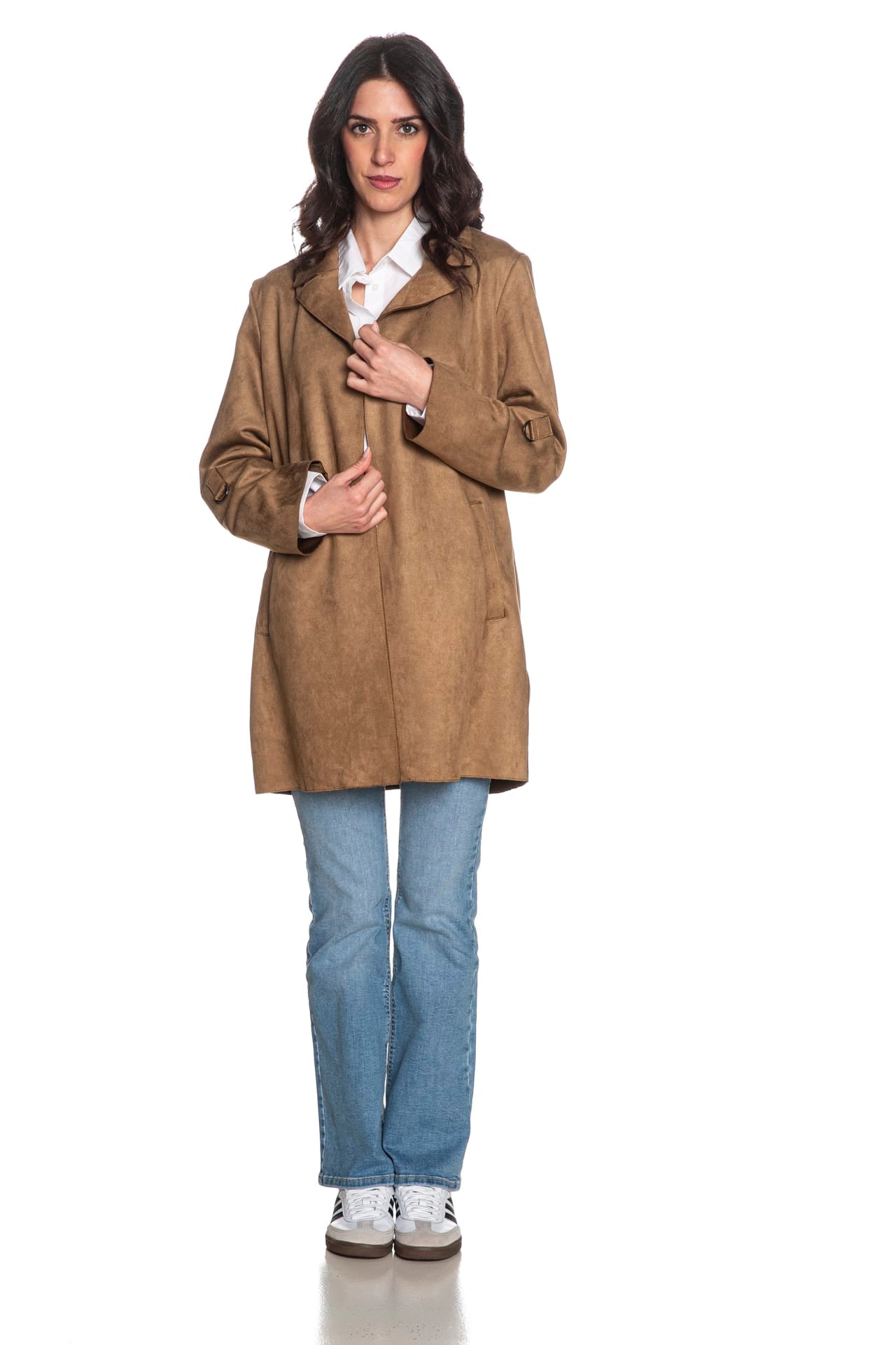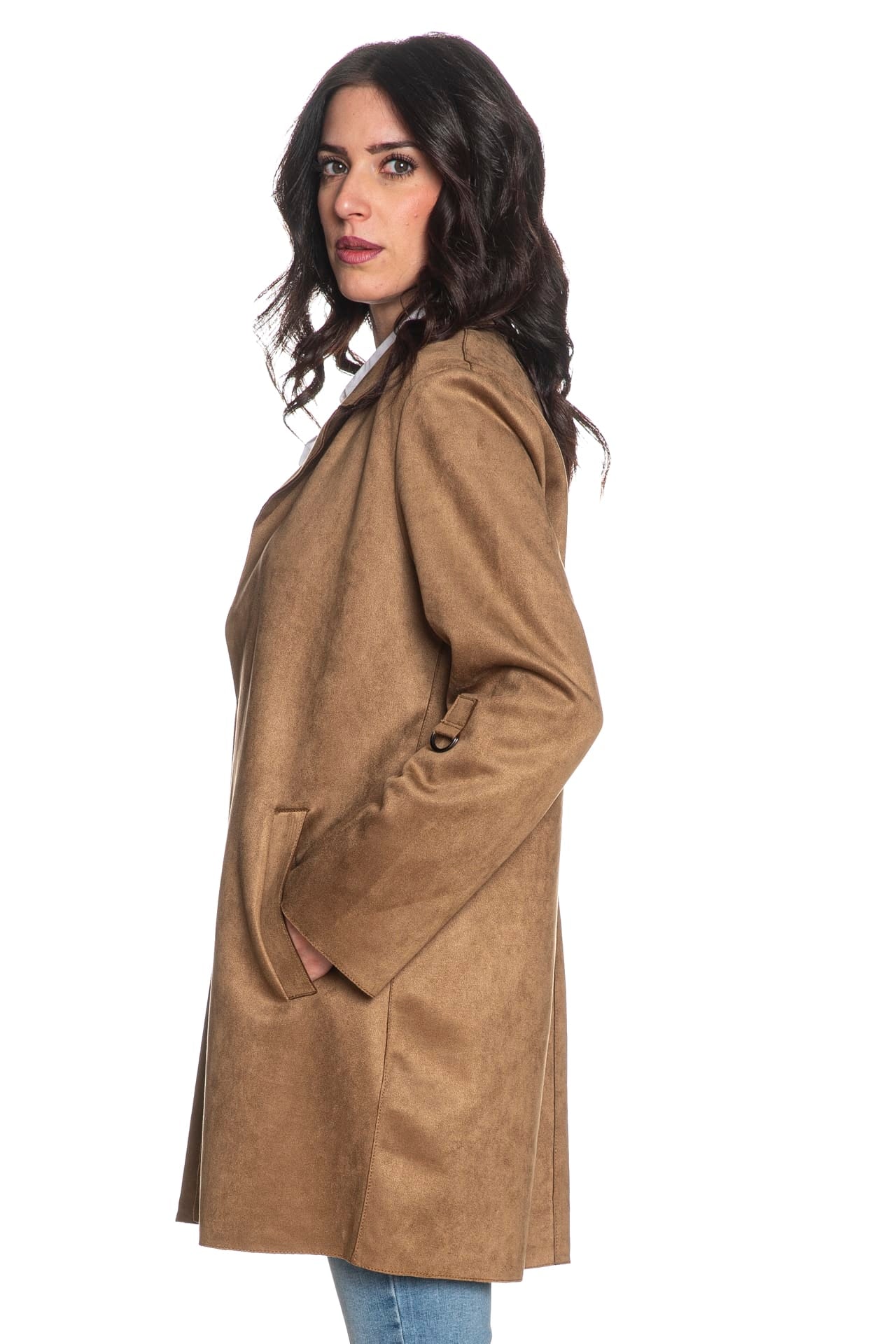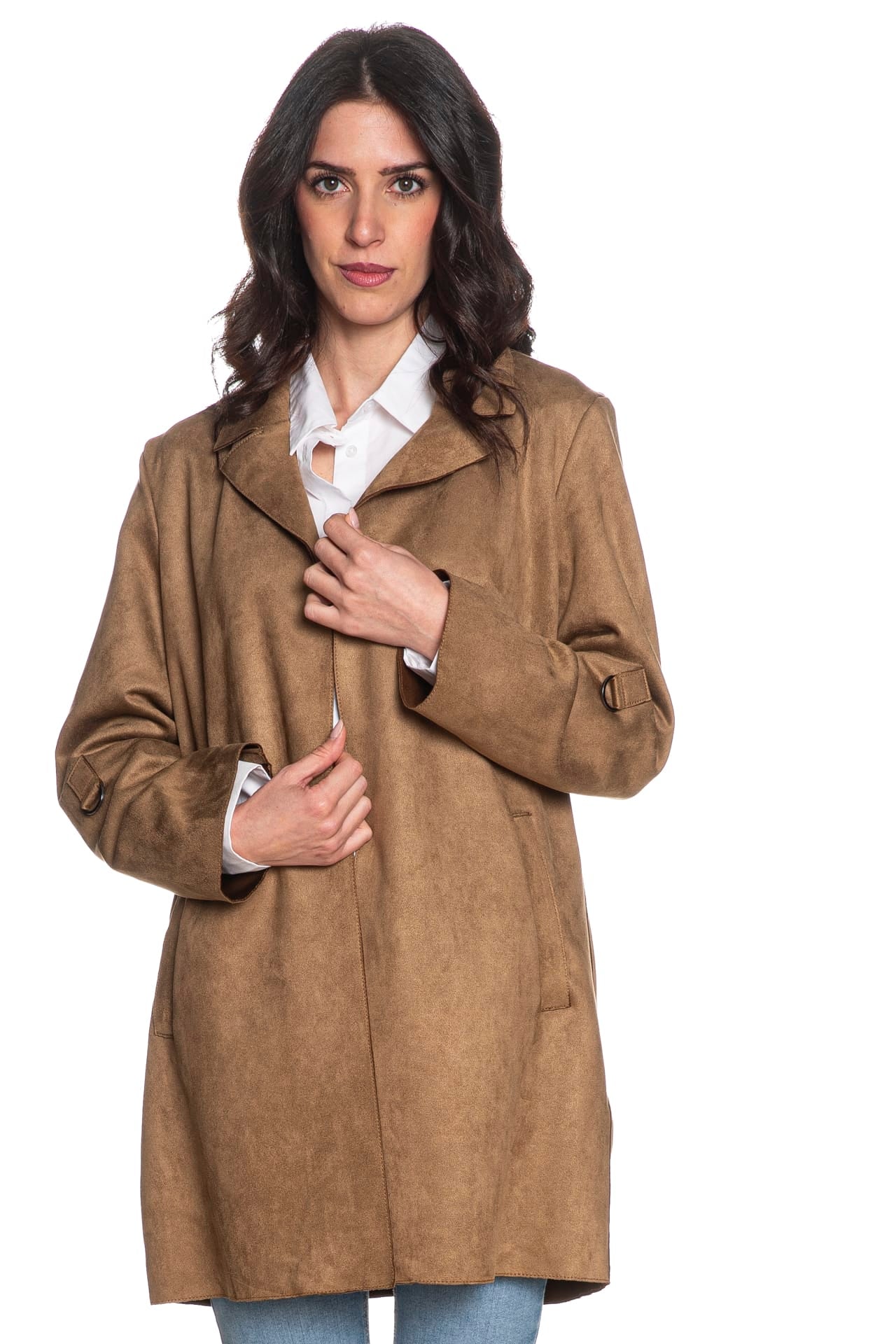 Trench Only Joline Faux Suede da donna in similpelle effetto suede stretch di poliestere, aperto, dalla linea dritta, sfoderato, lunghezza midi, con revers, tasche a filo, manica lunga dotata di fascetta interna per regolarne la lunghezza