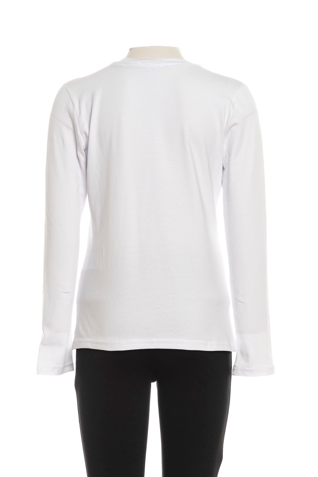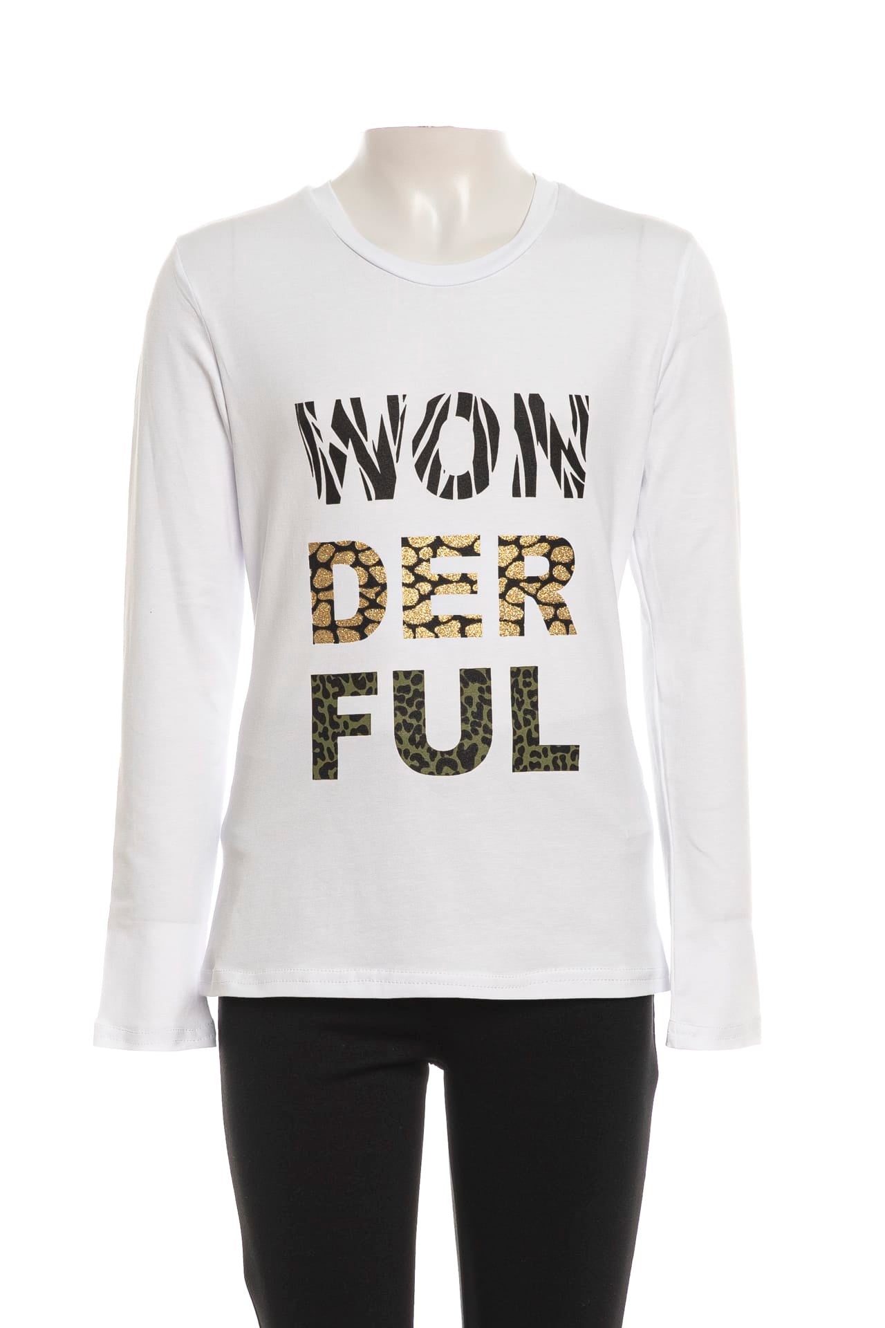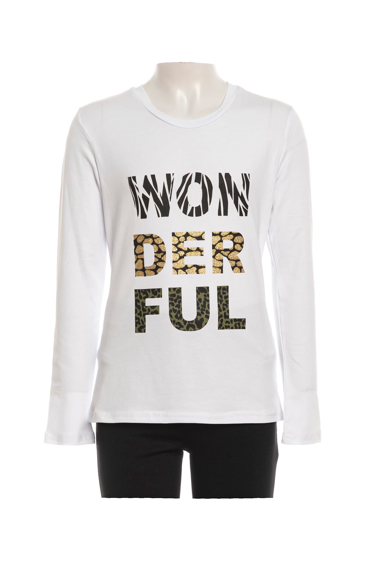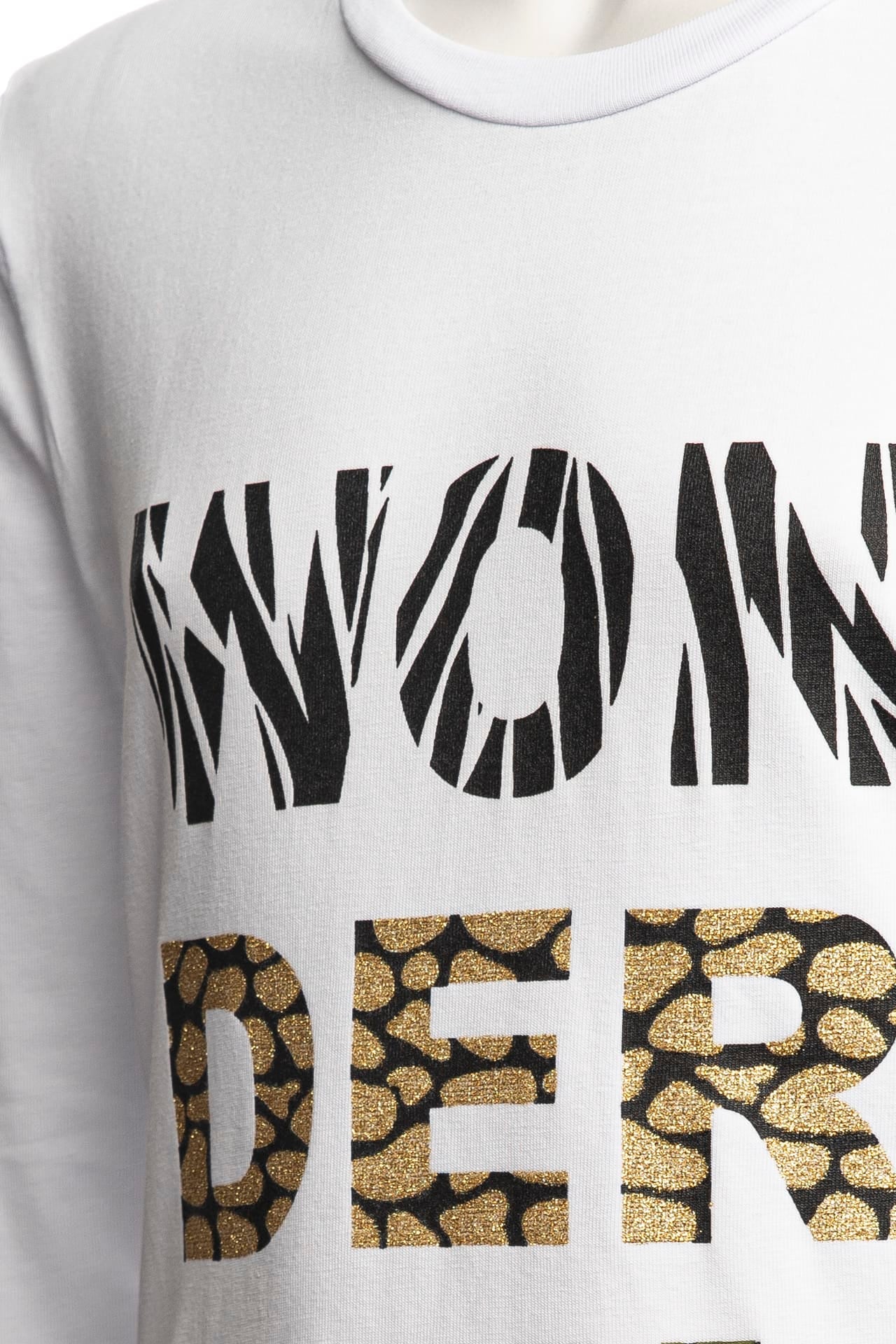 T shirt J'Aimè Wonderful da bambina in jersey di cotone stretch, a manica lunga, con girocollo in maglia a costine e macro grafica in stampa animalier gommata e glitter oro sul lato anteriore