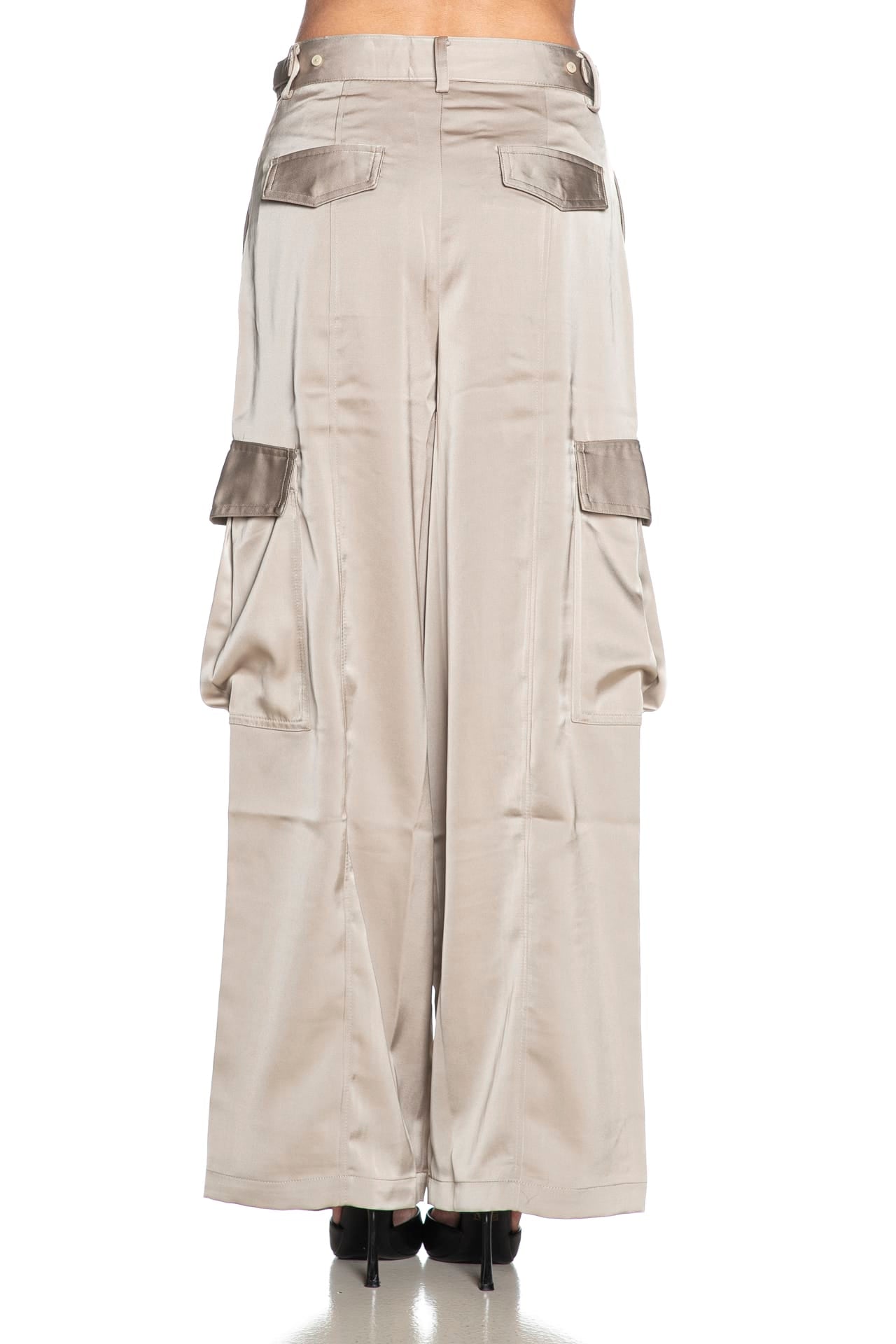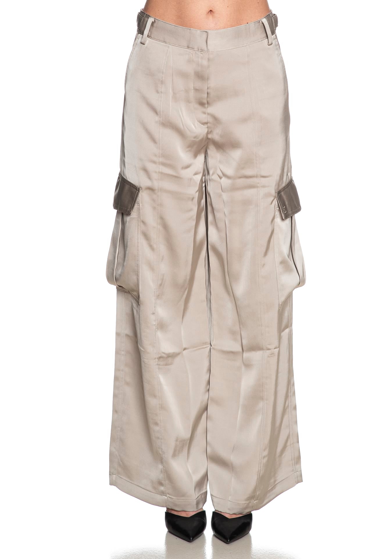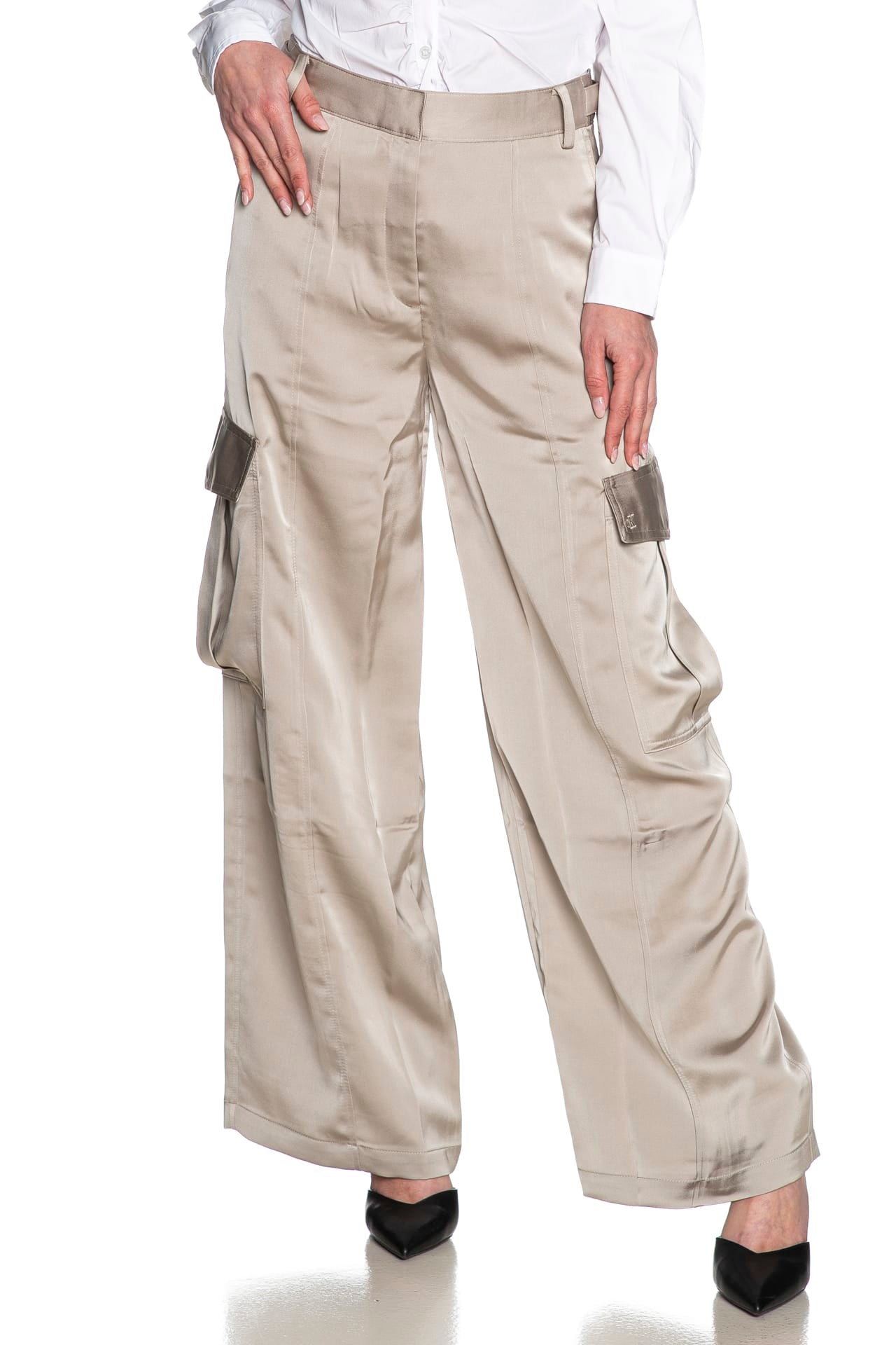 Pantalone Calvin Klein Satin Crg da donna in tessuto satinato di poliestere, modello cargo taglio chino gamba palazzo, con chiusura zip e gancetti a slitta coperti, vita regolabile da fettucce laterali, tasche america applicate, tasconi con patta sulle gambe e tasche posteriori a filo