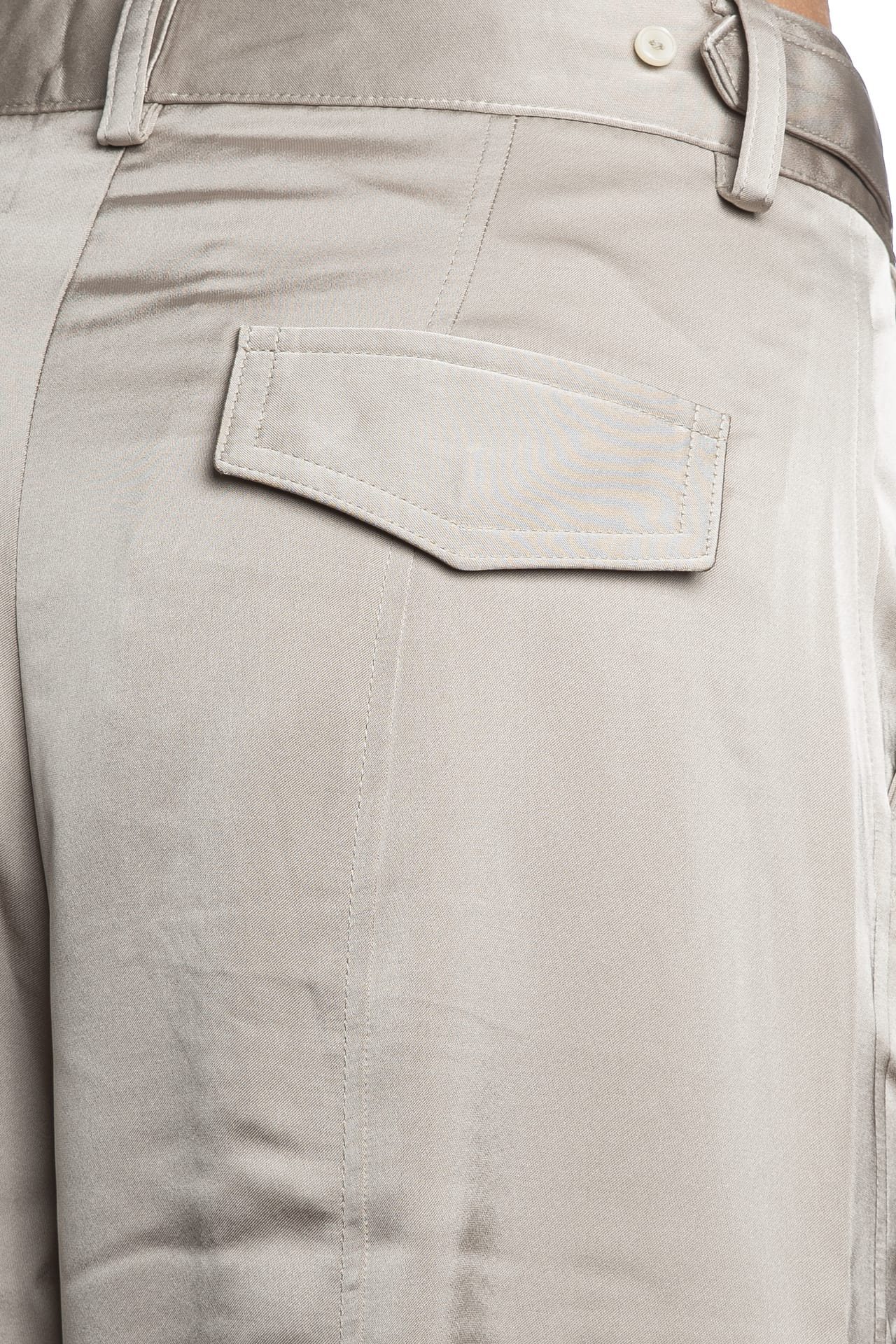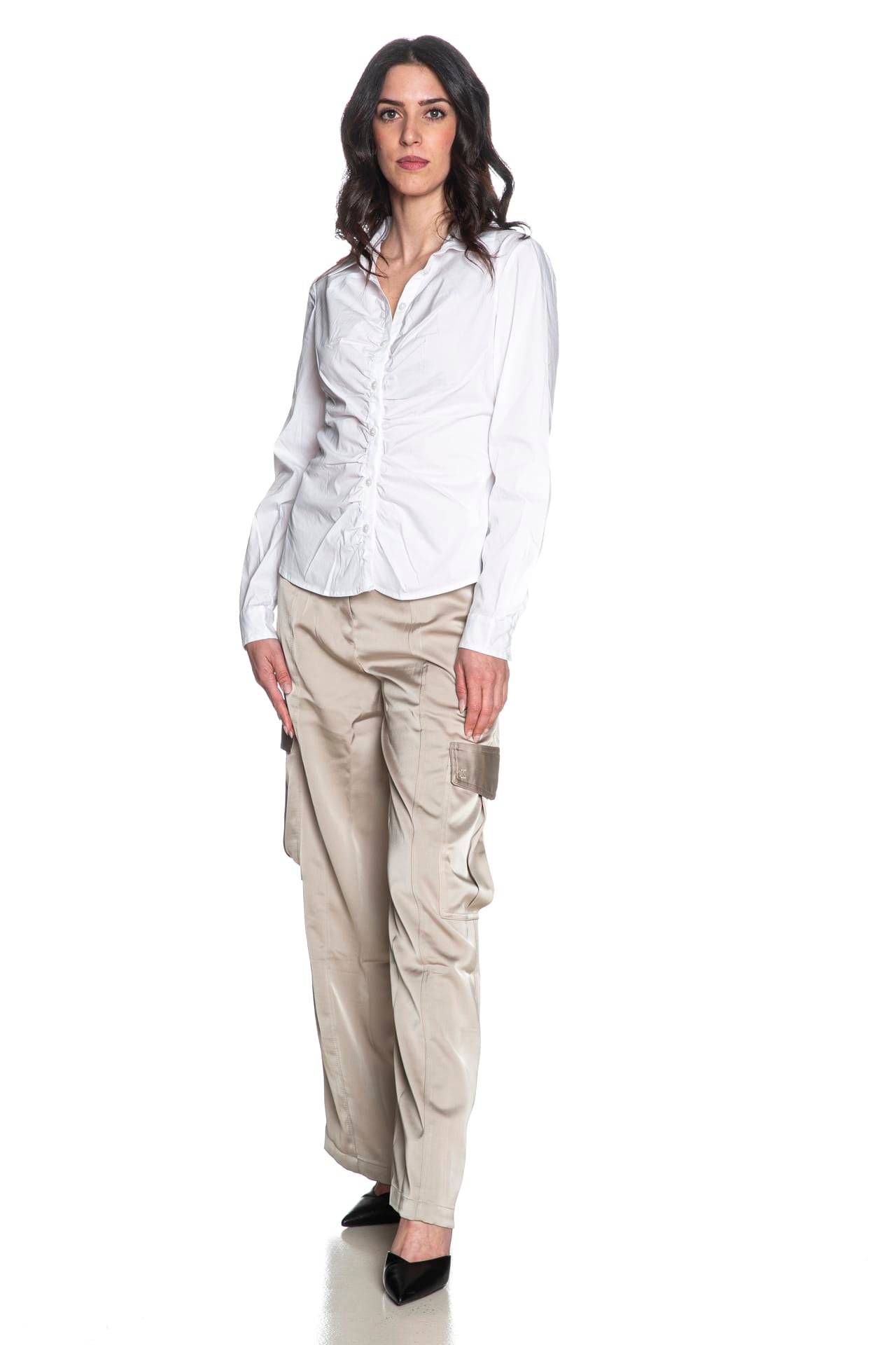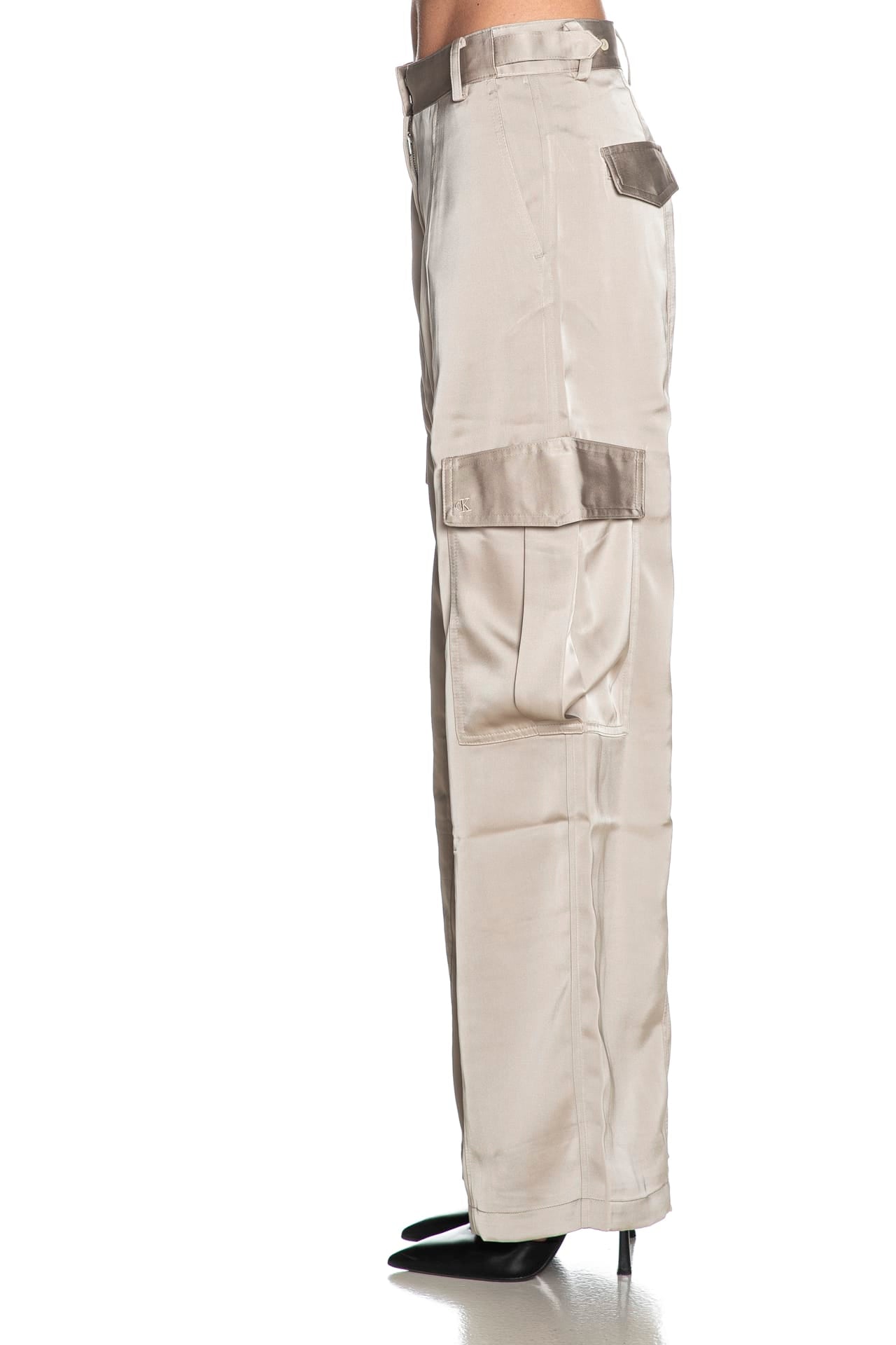 Pantalone Calvin Klein Satin Crg da donna in tessuto satinato di poliestere, modello cargo taglio chino gamba palazzo, con chiusura zip e gancetti a slitta coperti, vita regolabile da fettucce laterali, tasche america applicate, tasconi con patta sulle gambe e tasche posteriori a filo