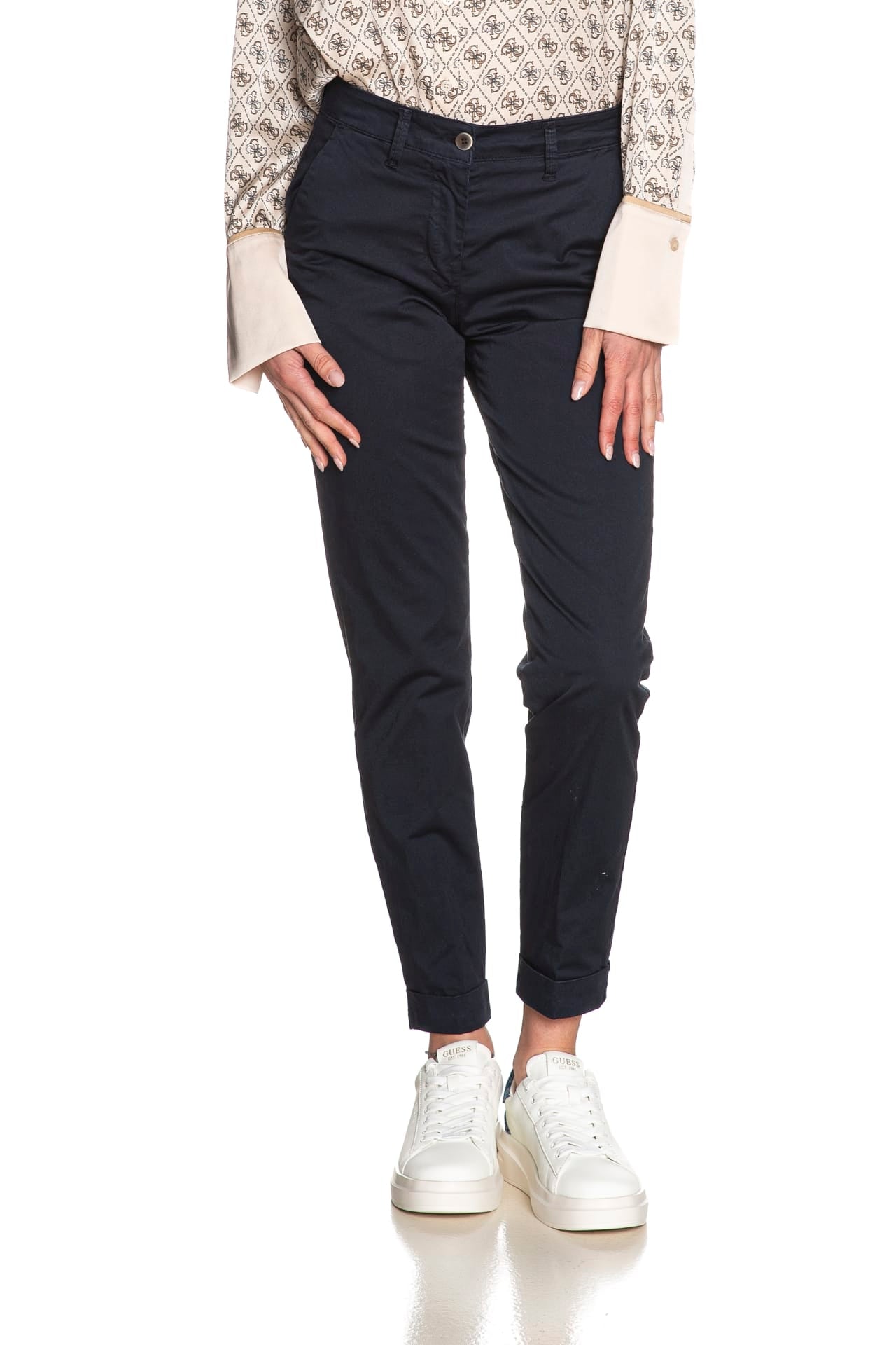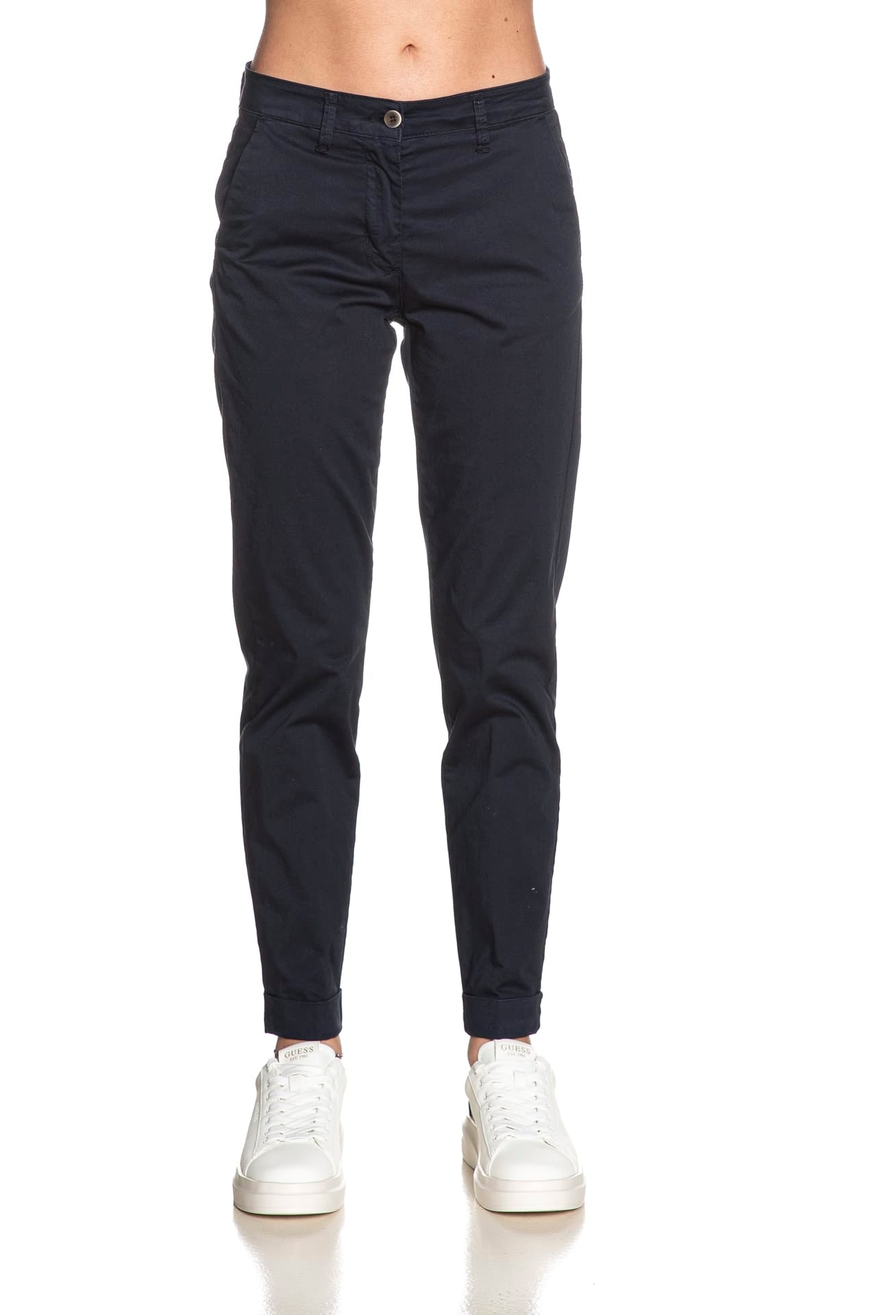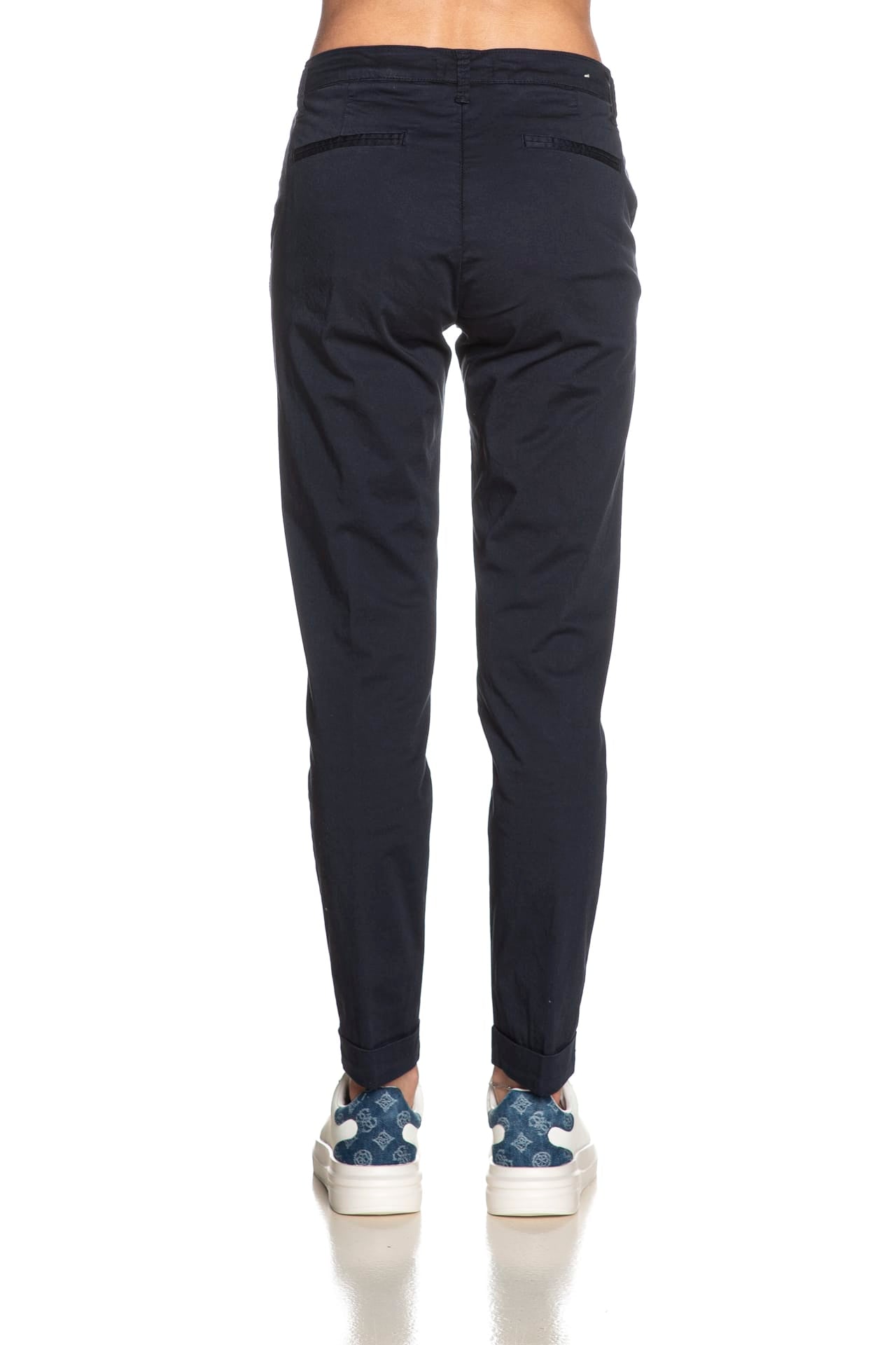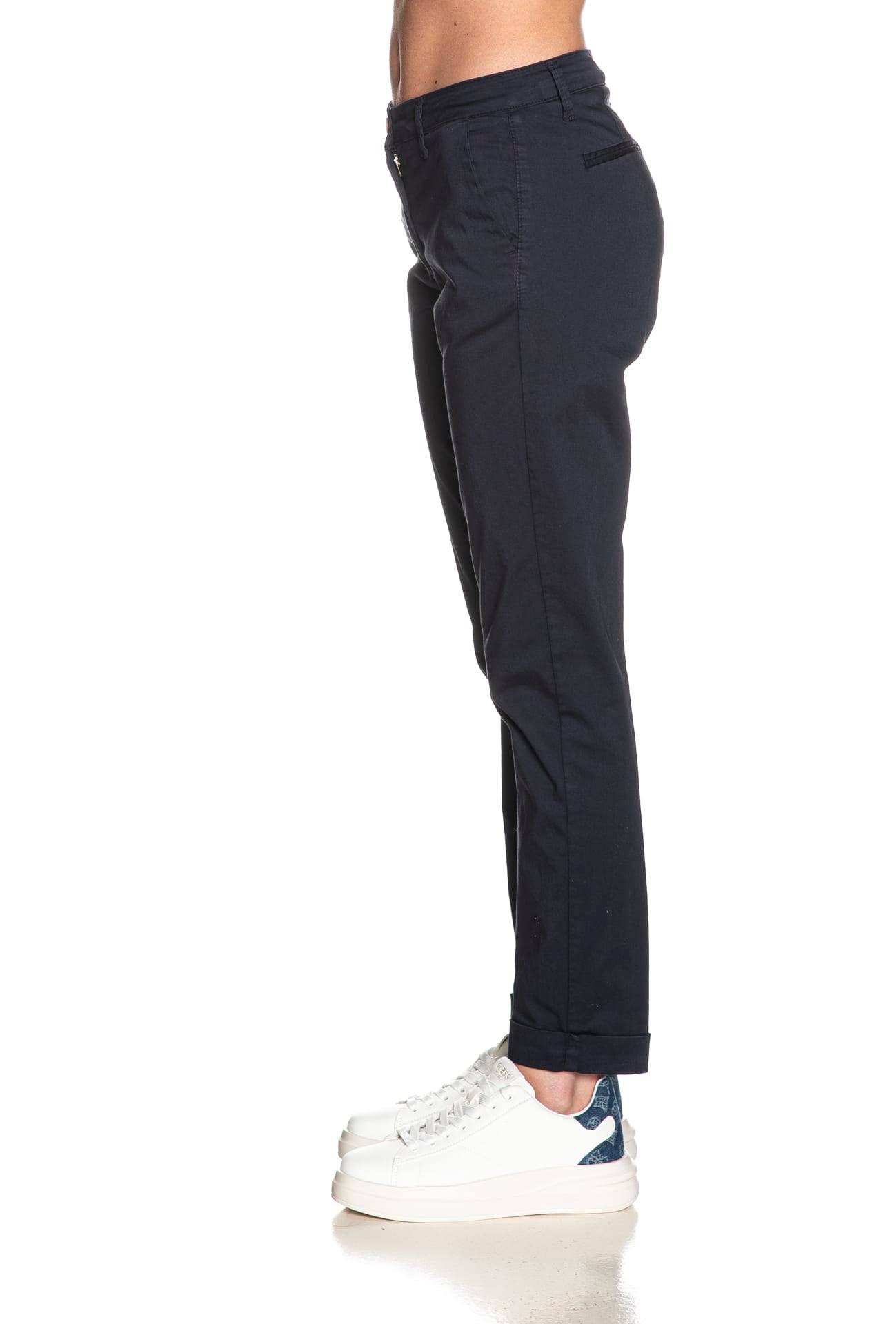 Pantalone Squad2 Napoli D da donna in tessuto a navetta stretch di cotone, modello chino, con tasche america laterali, a filo poteriori, chiusura zip a scomparsa con bottone e risvolto a fondo gamba.
