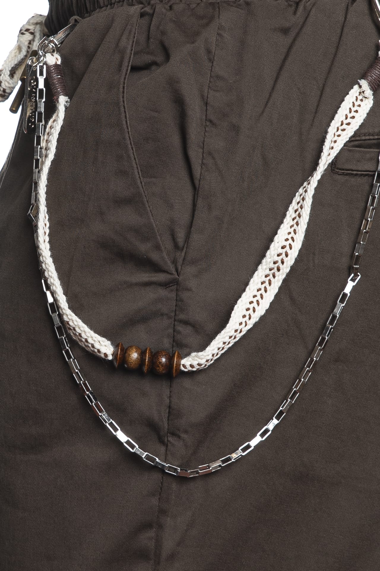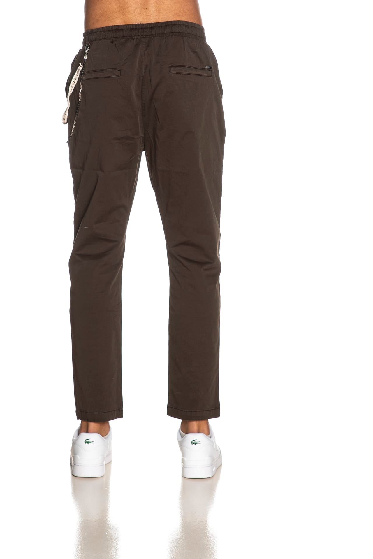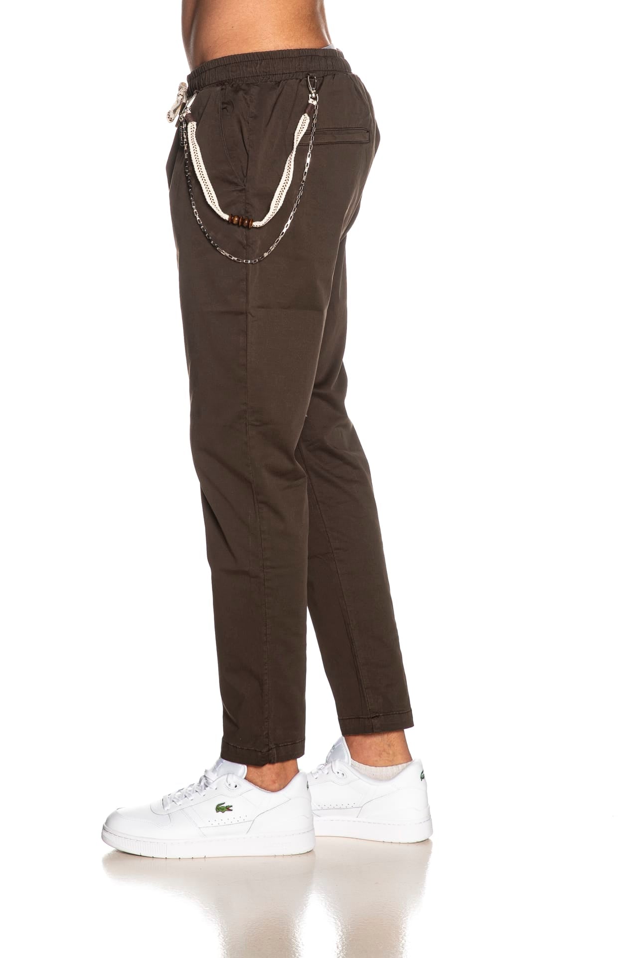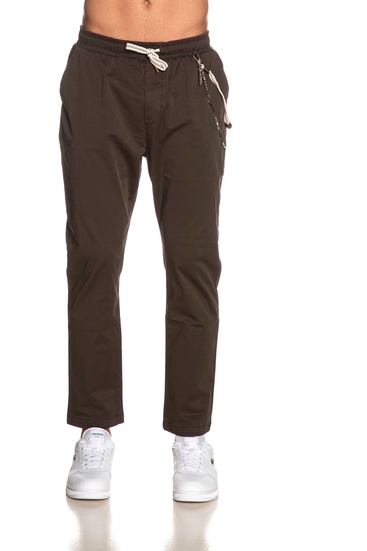 Pantalone Gianni Lupo Leonard da uomo in twill di cotone stretch, modello chino con elastico e coulisse in vita regolabile da maxi stringa intrecciata multicolor, finta patta cucita, tasche america anteriori e a filo posteriori