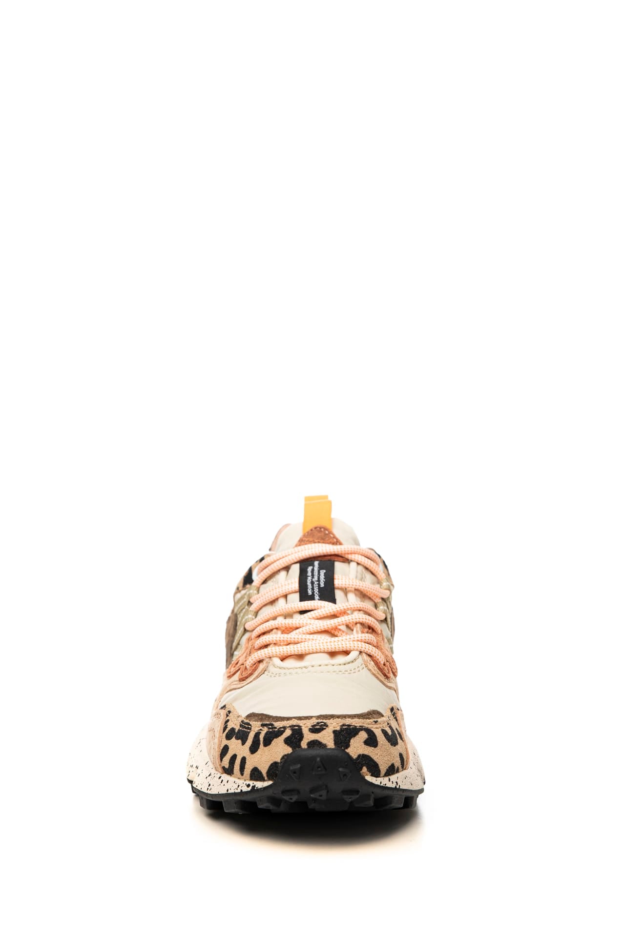 Scarpa Flower Mountain Yamano 3 W da donna dal design sportivo realizzata con tecnologia Microban che previene la formazione di muffe e allontana i batteri rendendo la calzatura durevole nel tempo, modello sneaker stile trekking con tomaia in tessuto tecnico e dettagli in suede liscia e traforata scamosciata multicolor e animalier, allacciatura ghillie mediante passanti anzichè occhielli a lacci tubolari, occhielli rinforzati, fettuccia su linguetta e tallone per facilitare la calzata, soletta interna in sughero naturale antibatterico e fondo sagomato in gomma ultra leggera con battistrada dentellato