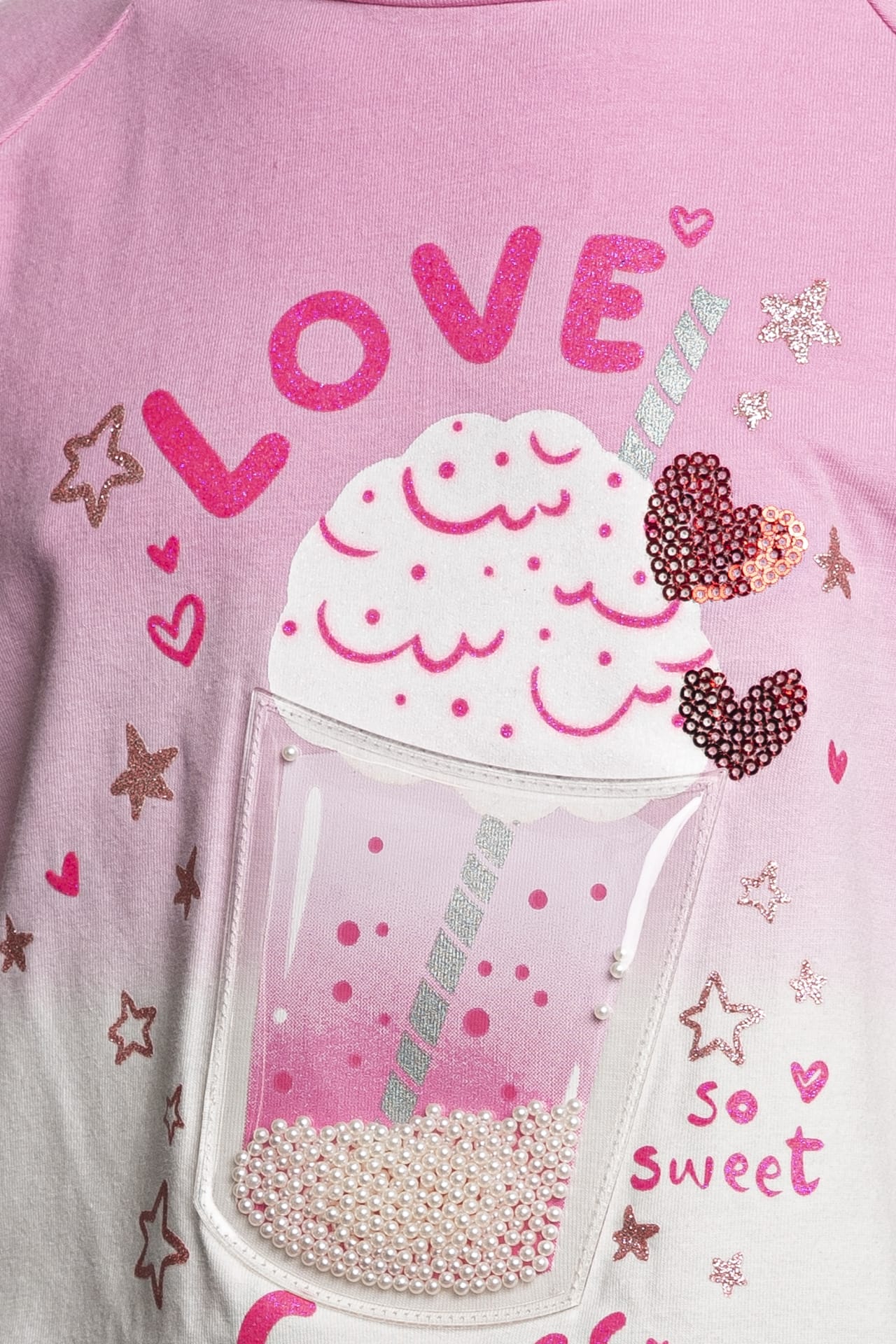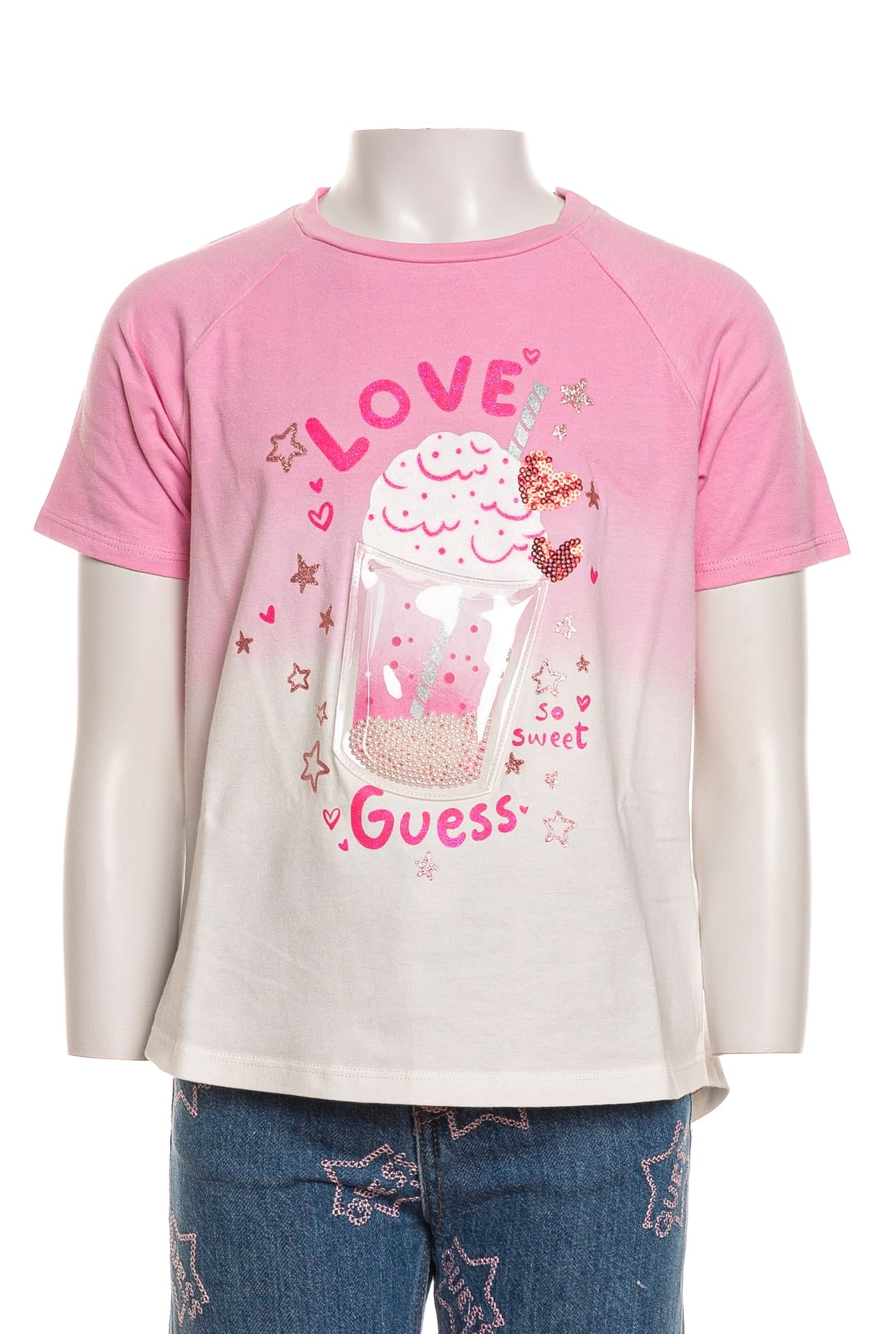 T-Shirt Guess Ss High Low Dip Dye da bambina in jersey stretch di cotone parzialmente organico degradè, a manica corta raglan, con girocollo in maglina e maxi lavorazione a tema milkshake sul petto composta da stampa glitterata, ricamo paillettes e patch in materiale plastico simil pvc con all'interno perline e fondo asimmetrico più lungo nel retro