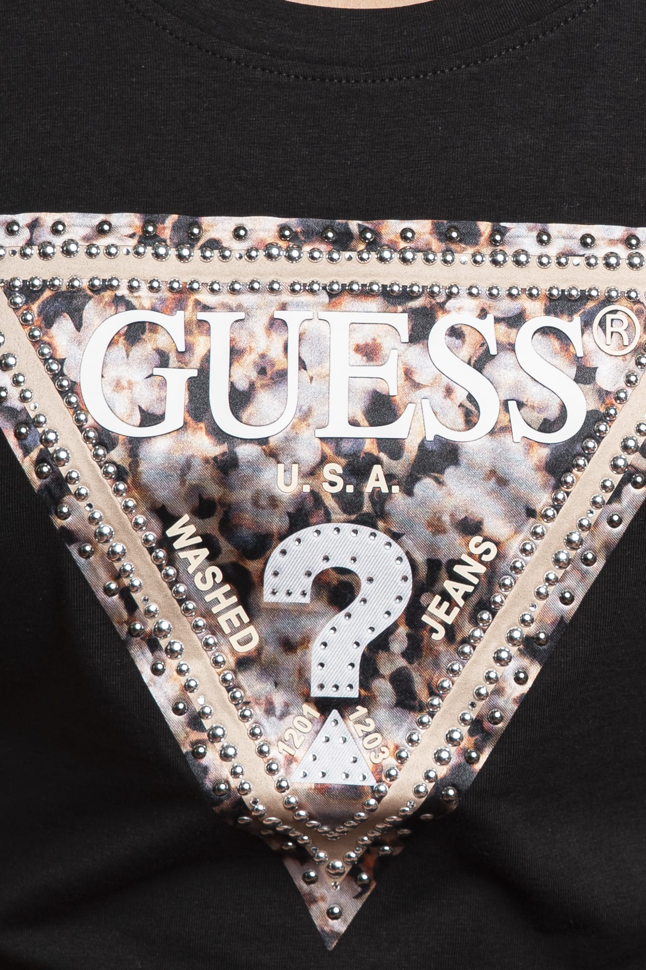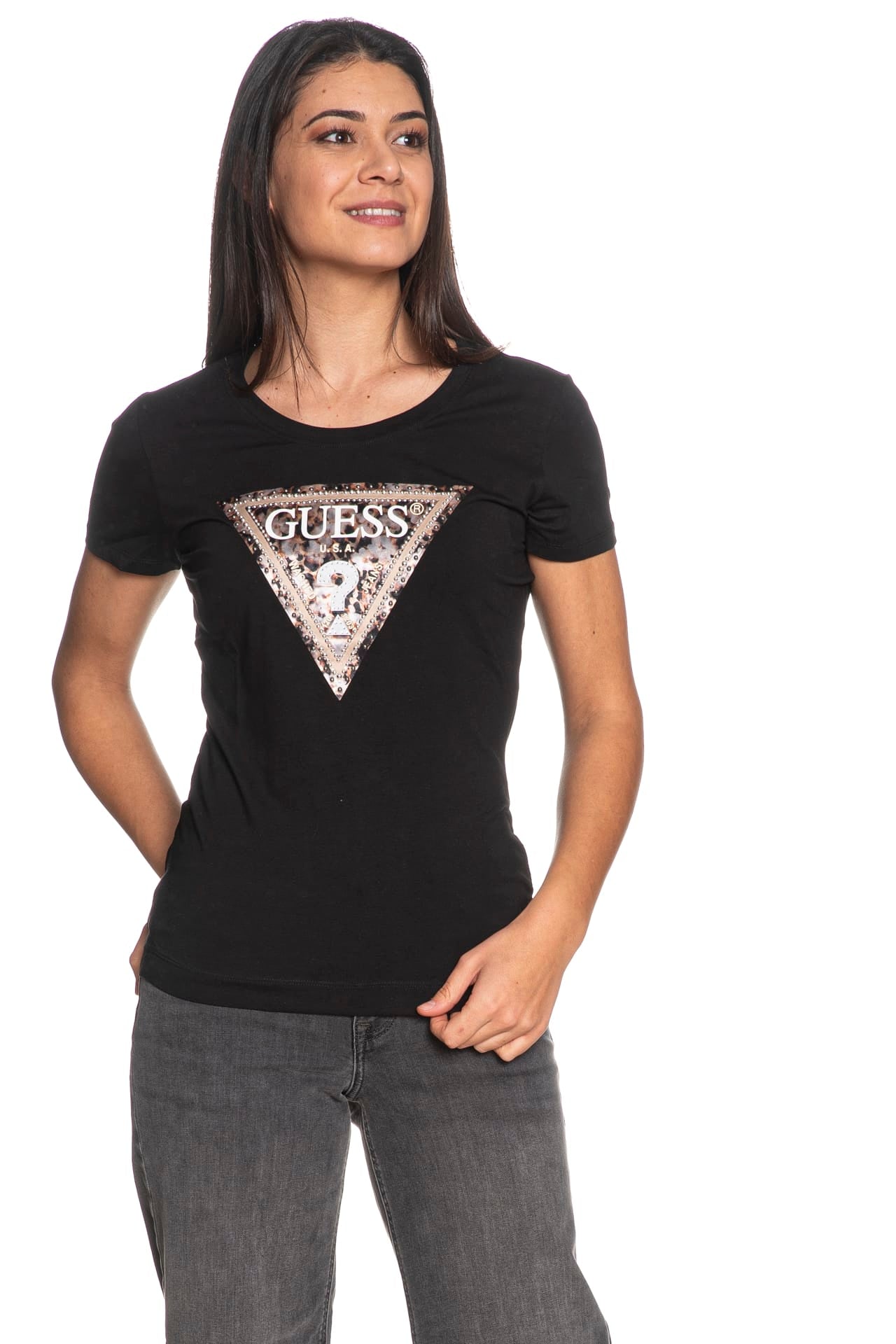 T shirt Guess Leo Tringle da donna in jersey di cotone stretch, a manica corta, con scollo tondo e macro logo gommato su tessuto stampato in fantasia leopardata con dettagli in strass e micro borchie acciaio