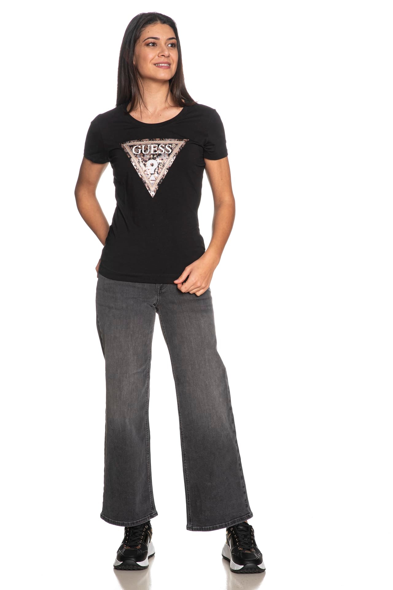 T Shirt Guess Leo Tringle Da Donna Nera