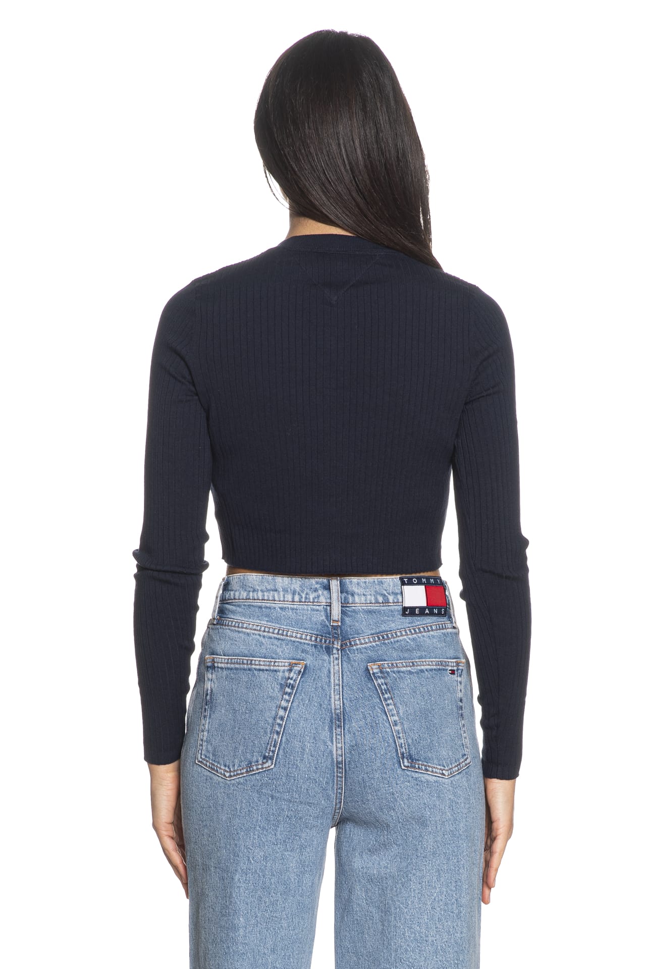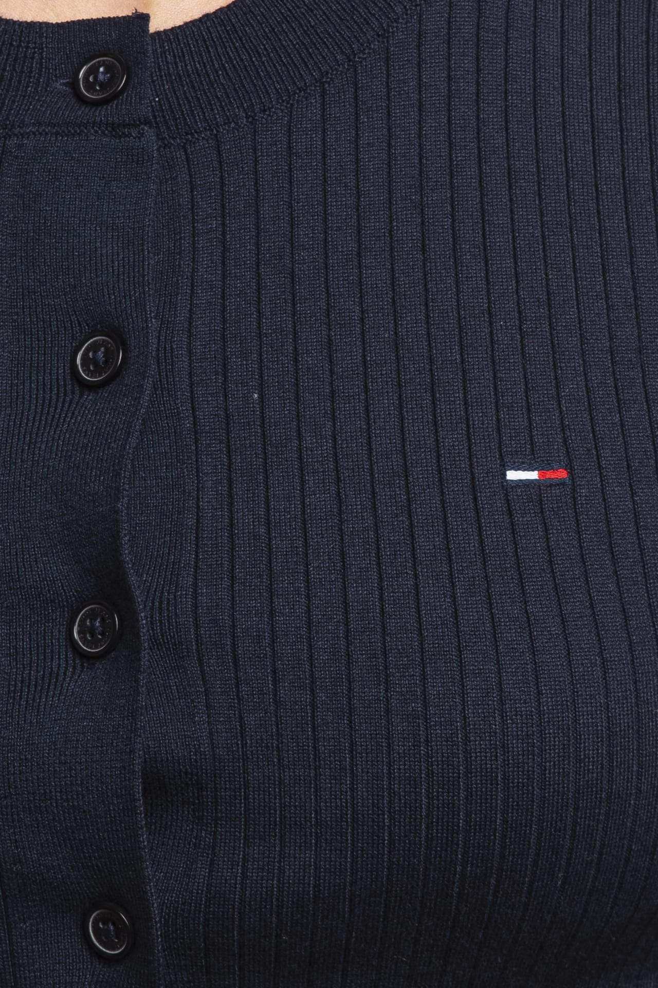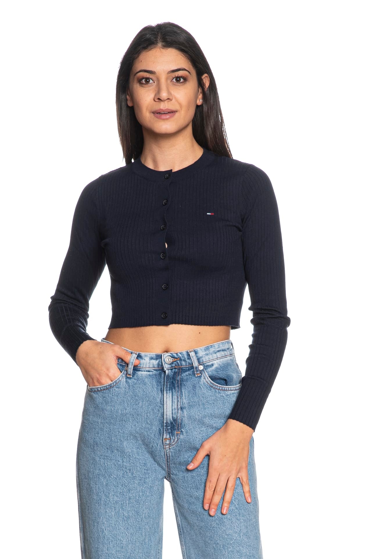 Cardigan Tommy Hilfiger Crp Rib Crg da donna in filato a coste piatte di misto cotone, cropped, girocollo a manica lunga, con abbottonatura full e micro flag istituzionale ricamato sul petto