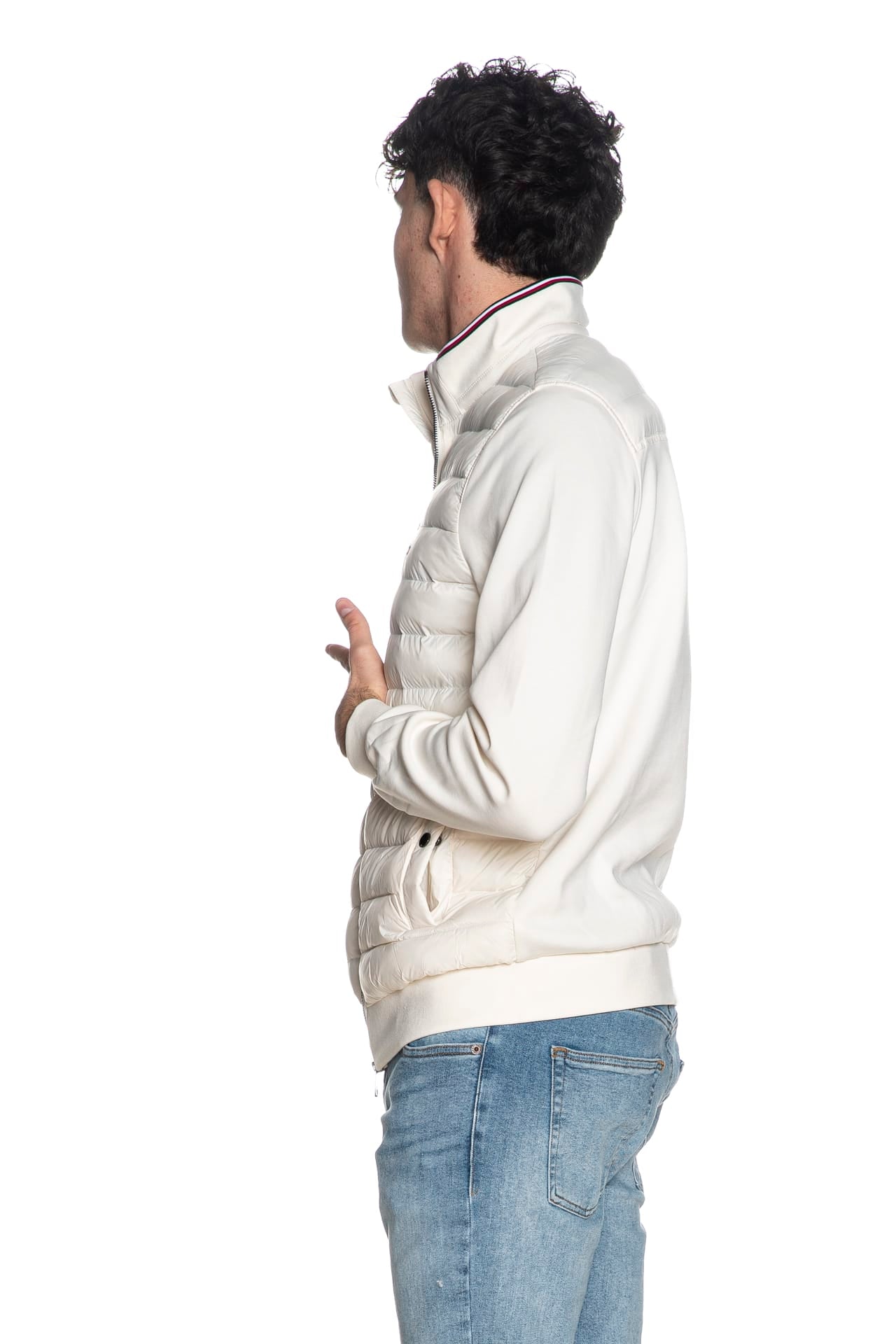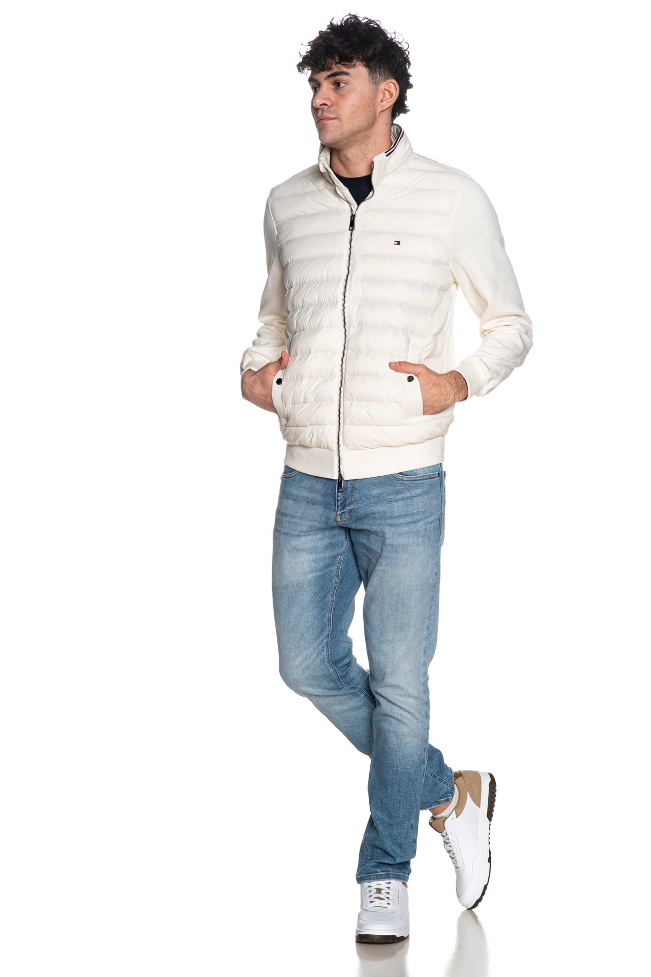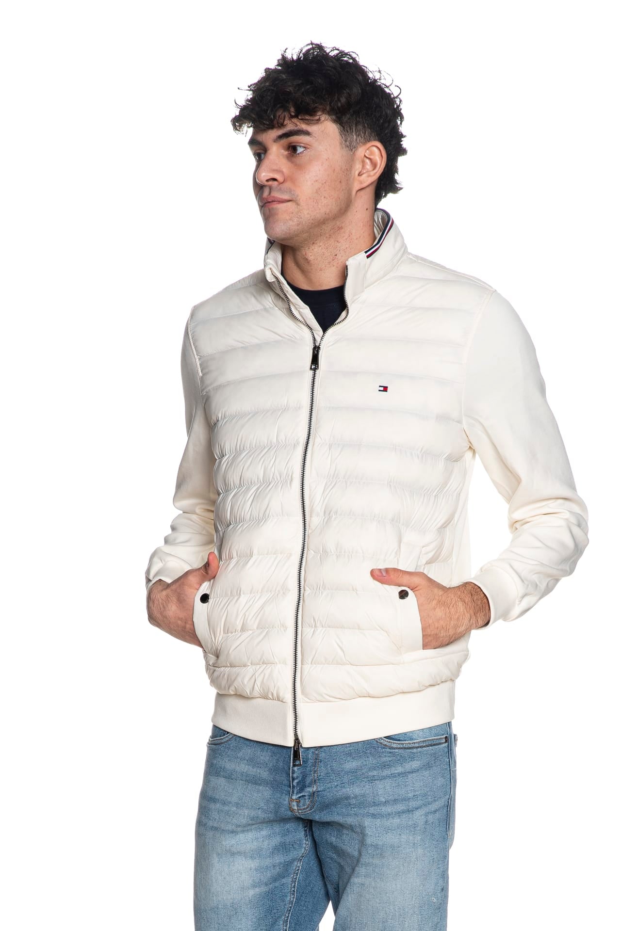 PiuminoTommy Hilfiger Mix Media Ess Rwb Stand Collar da uomo, con pannello frontale in trapunta leggera di poliammide e imbottitura sintetica, maniche e retro capo in interlock di misto cotone e poliestere, collo alto polsini e cannolè a costine, chiusura full zip a doppio cursore, micro flag istituzionale ricamato sul petto e tasche laterali a filo con bottone a pressione