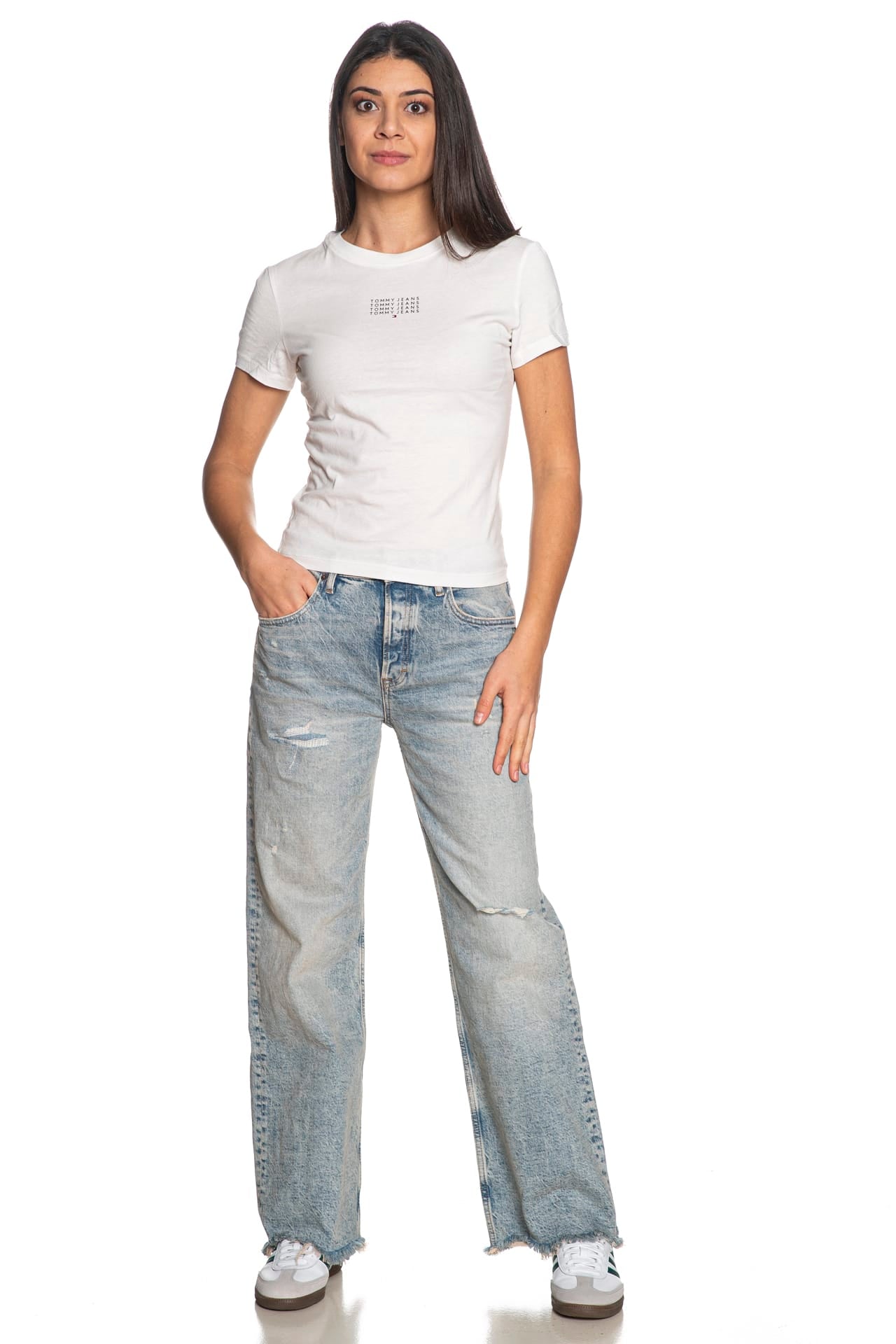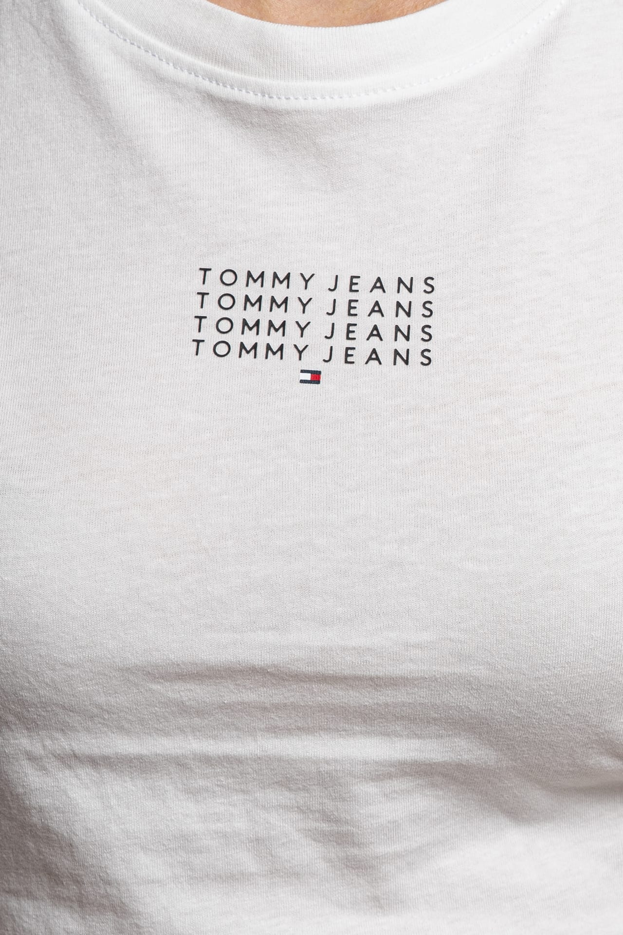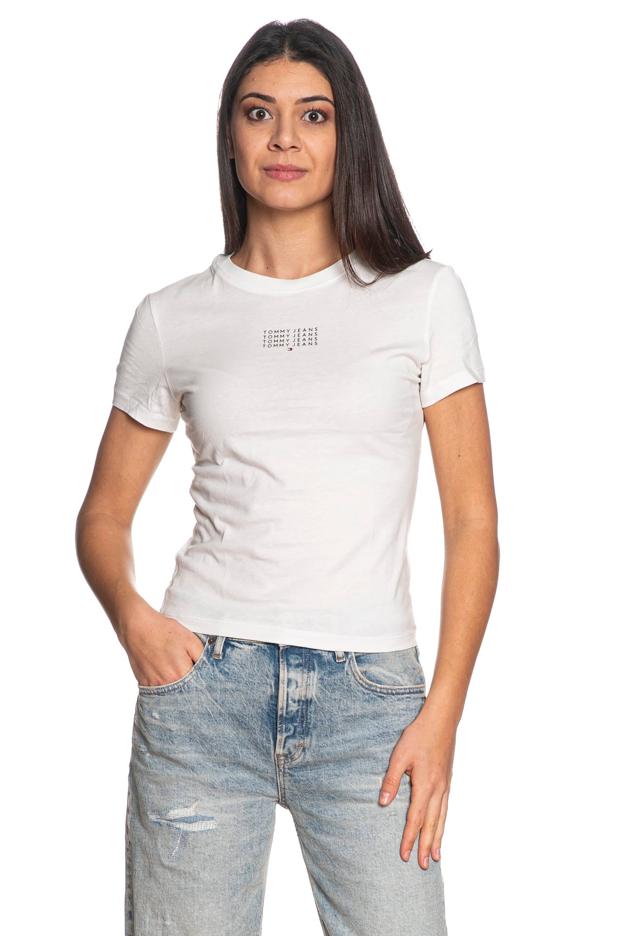 T shirt Tommy Hilfiger Sl Multi Linear Ss Tee da donna in jersey di cotone, slim fit girocollo a manica corta, con piccoli loghi a ripetizione in stampa gommata a contrasto colore a centro petto