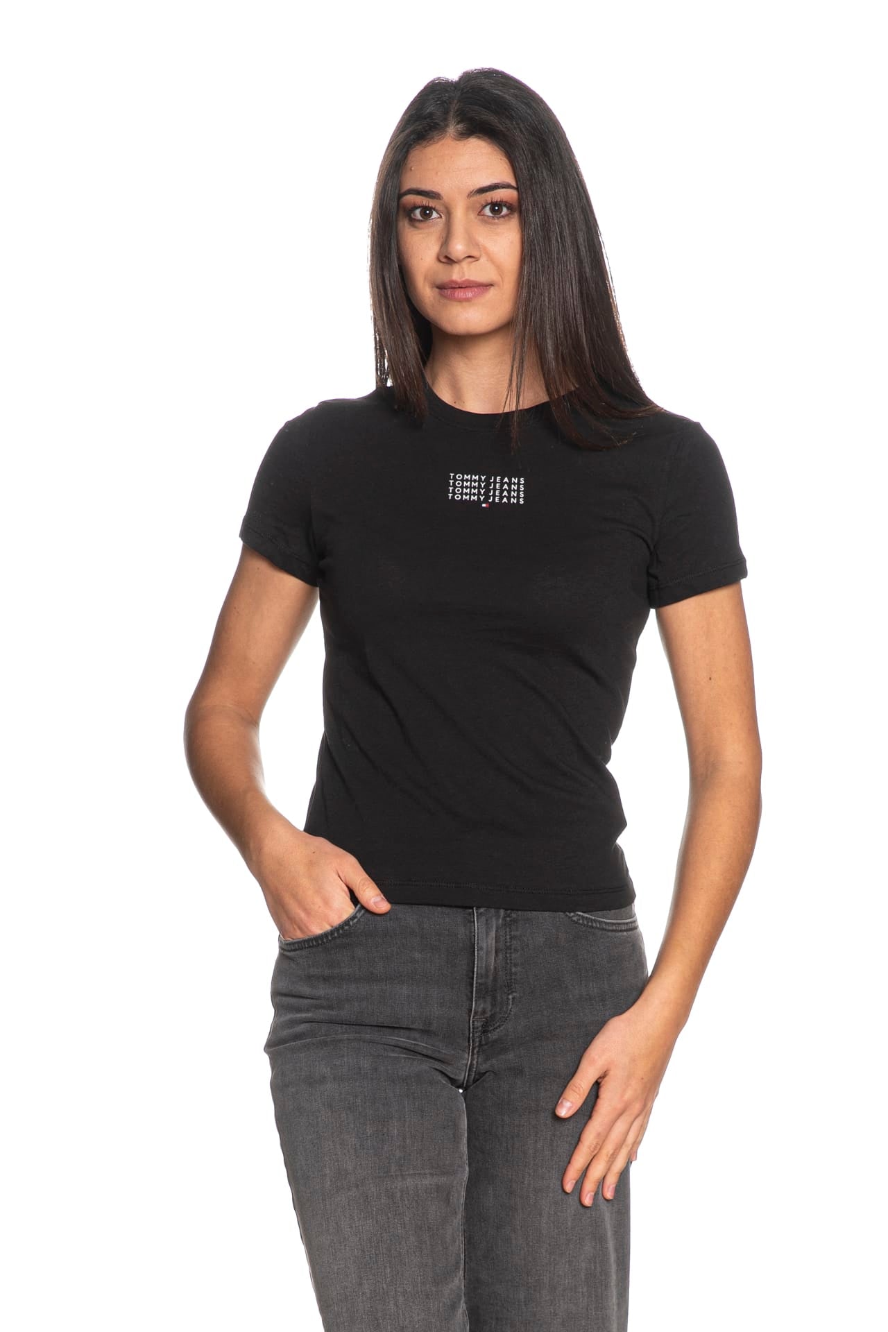 T shirt Tommy Hilfiger Sl Multi Linear Ss Tee da donna in jersey di cotone, slim fit girocollo a manica corta, con piccoli loghi a ripetizione in stampa gommata a contrasto colore a centro petto