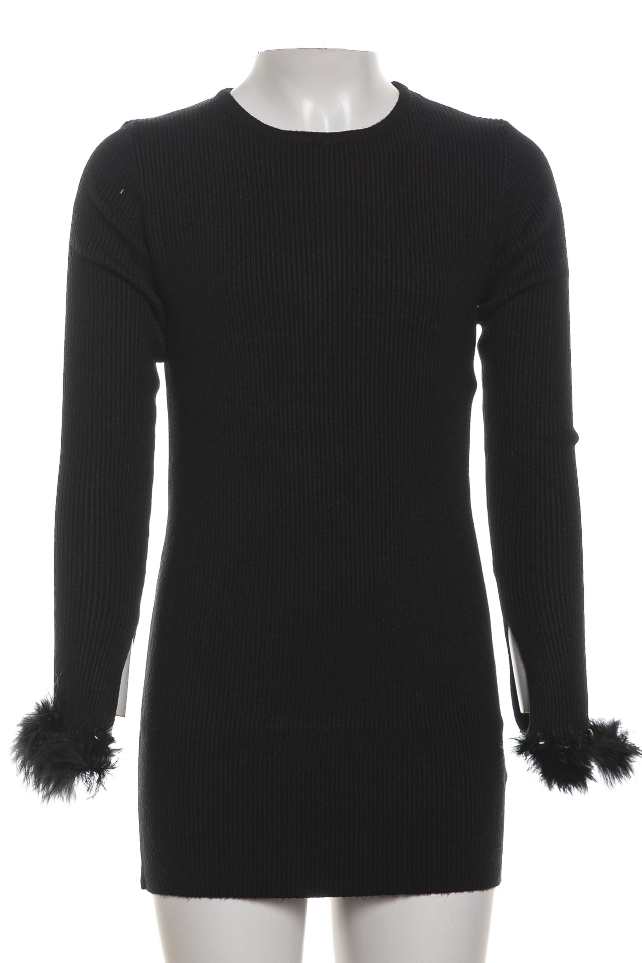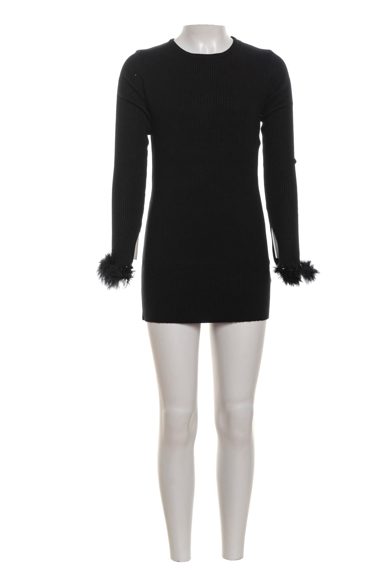 Abito corto J'Aimè Ribs da bambina in filato a costine di misto viscosa poliammide e poliestere, girocollo, con piccola placchetta logo in acciaio applicata sul retro collo, maniche lunghe con spacchetti e bordi rimovibili in piume di struzzo tono su tono ai polsi