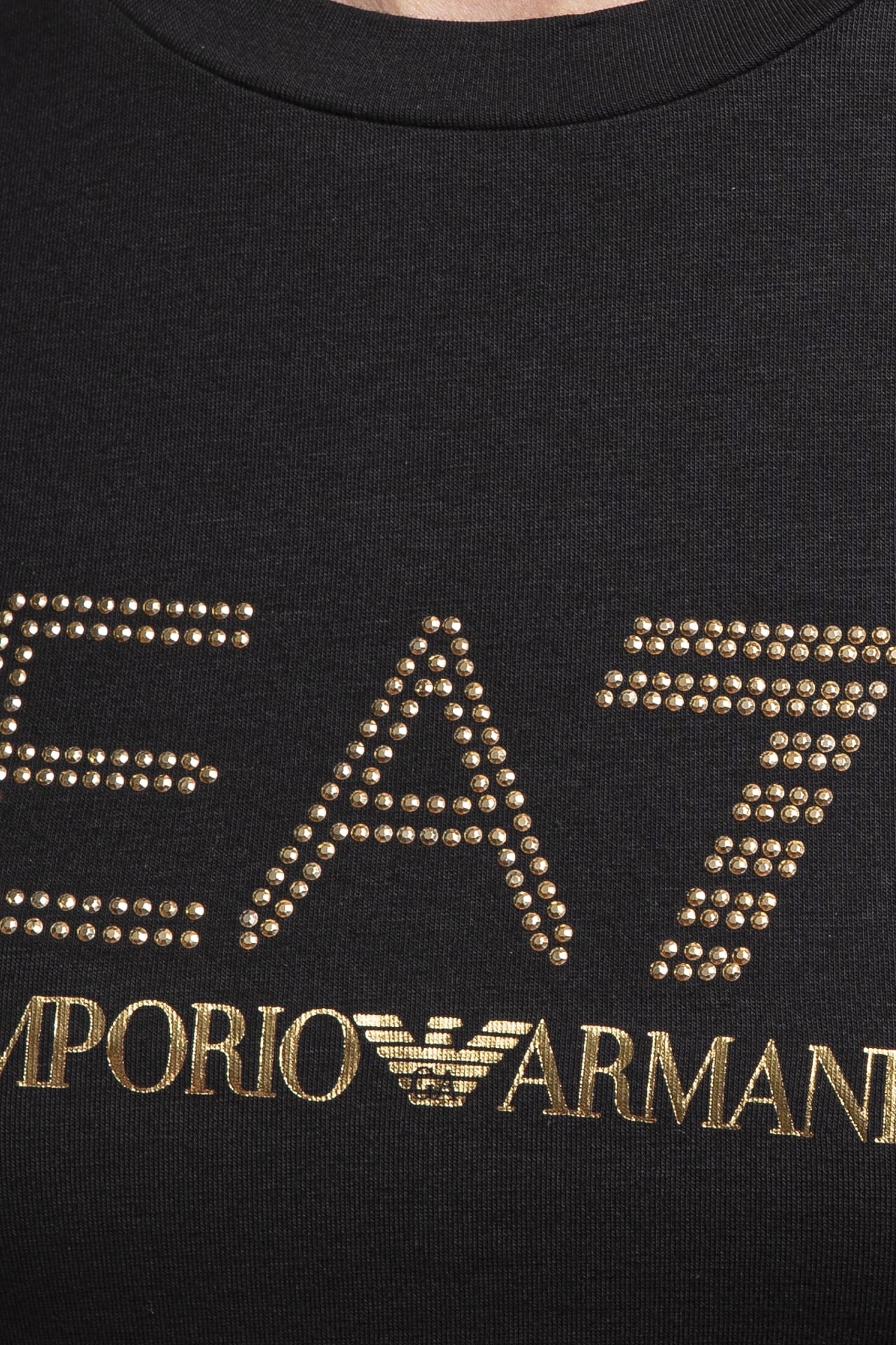 Abito EA7 Train Evolution Dress Ss da donna in jersey, modello t shirt lunga girocollo regular fit, con risvolto alla manica corta, monogramma in micro borchie sulla spalla e a centro petto con logo laminato oro