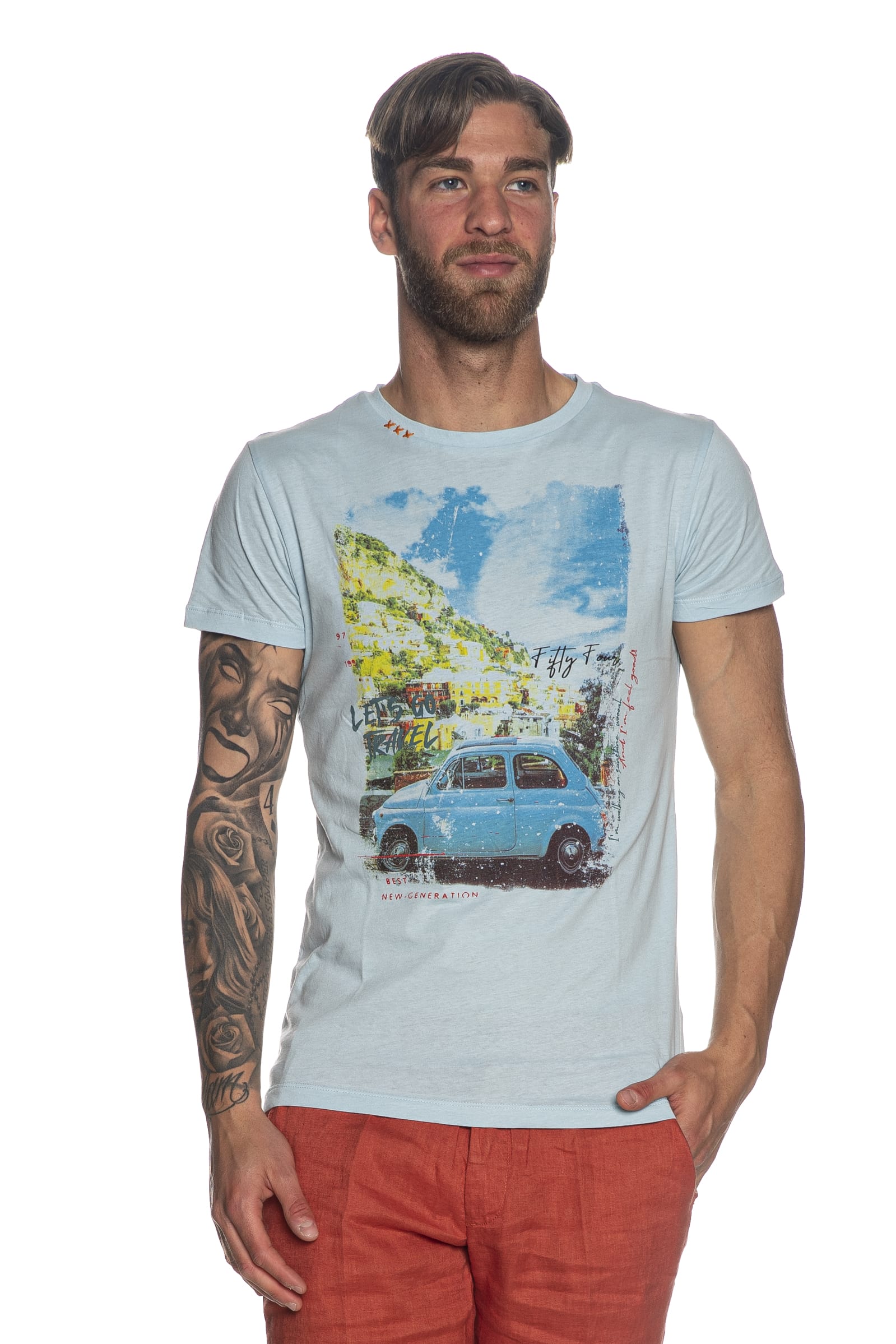 T shirt Fifty Four Acing da uomo in jersey di puro cotone, a manica corta, con macro immagine fotografica vintage in stampa serigrafata multicolor sul lato anteriore e dettaglio ricamo a filo sul girocollo